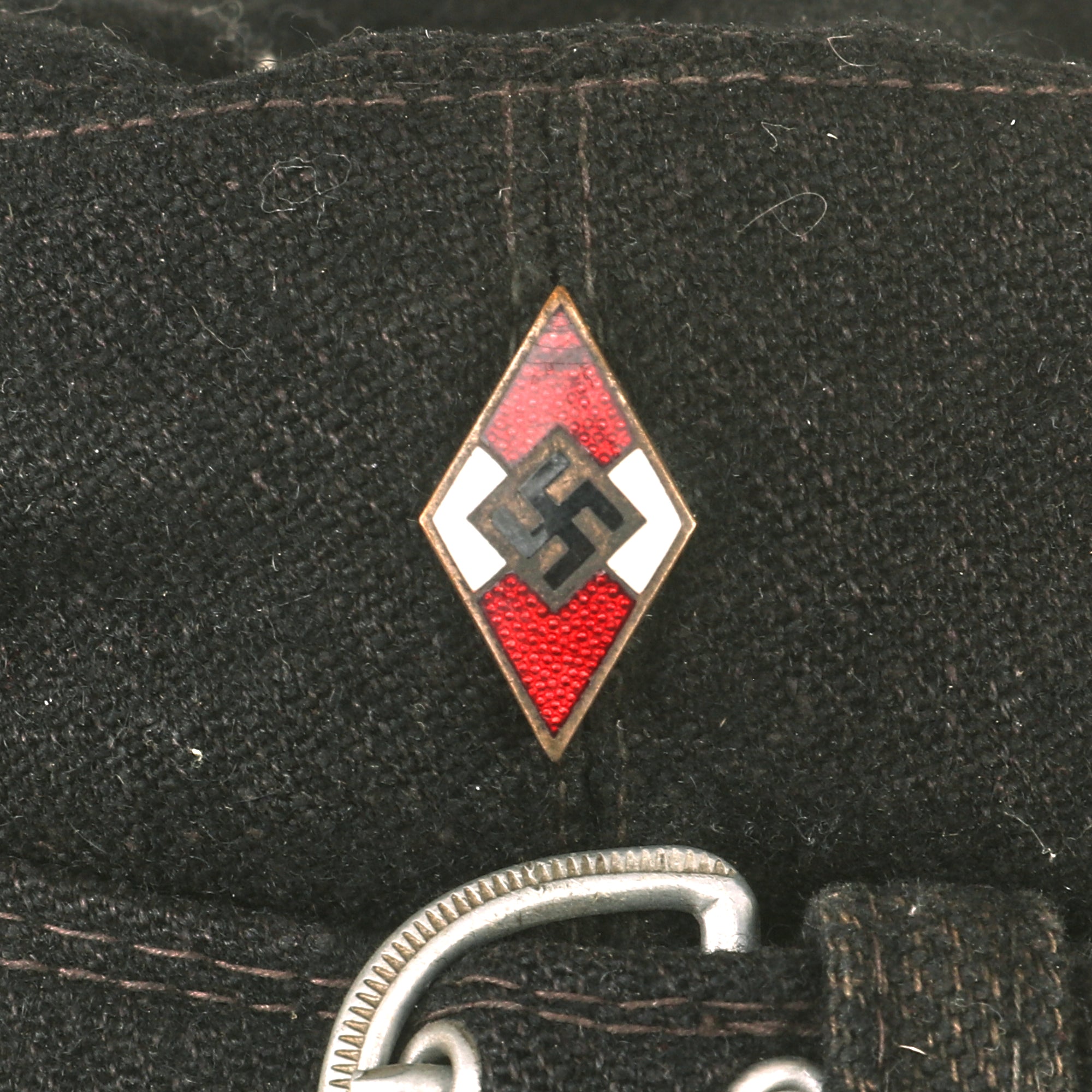 The front top of the cap has a very nice early pattern enameled HJ diamond emblem, which consists of a black mobile swas inside a white square diamond, which is surrounded by alternating white and red quadrants. The borders between sections are plated metal, which now has oxidized to a lovely gray patina. We cannot see any maker name on the back of the pin.
