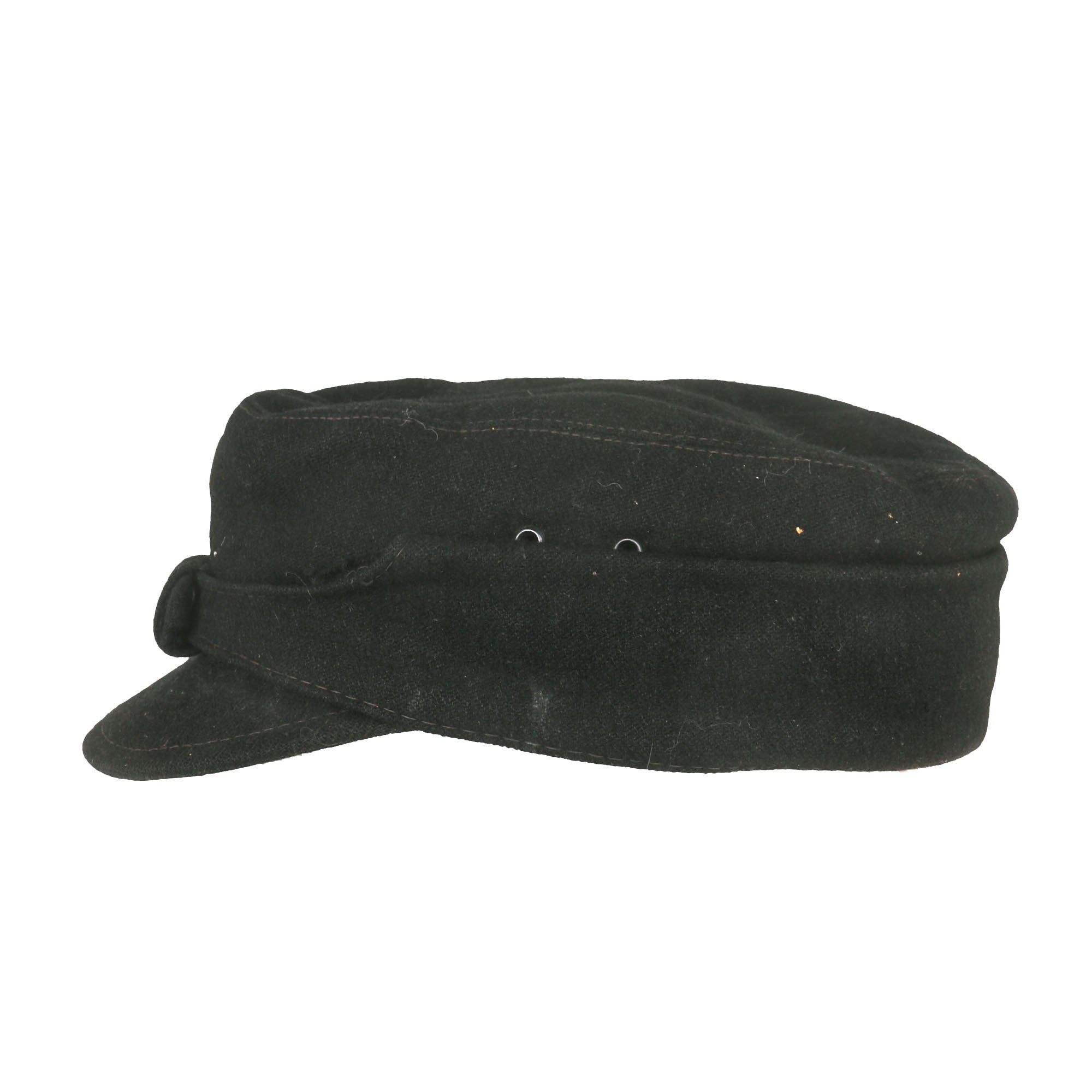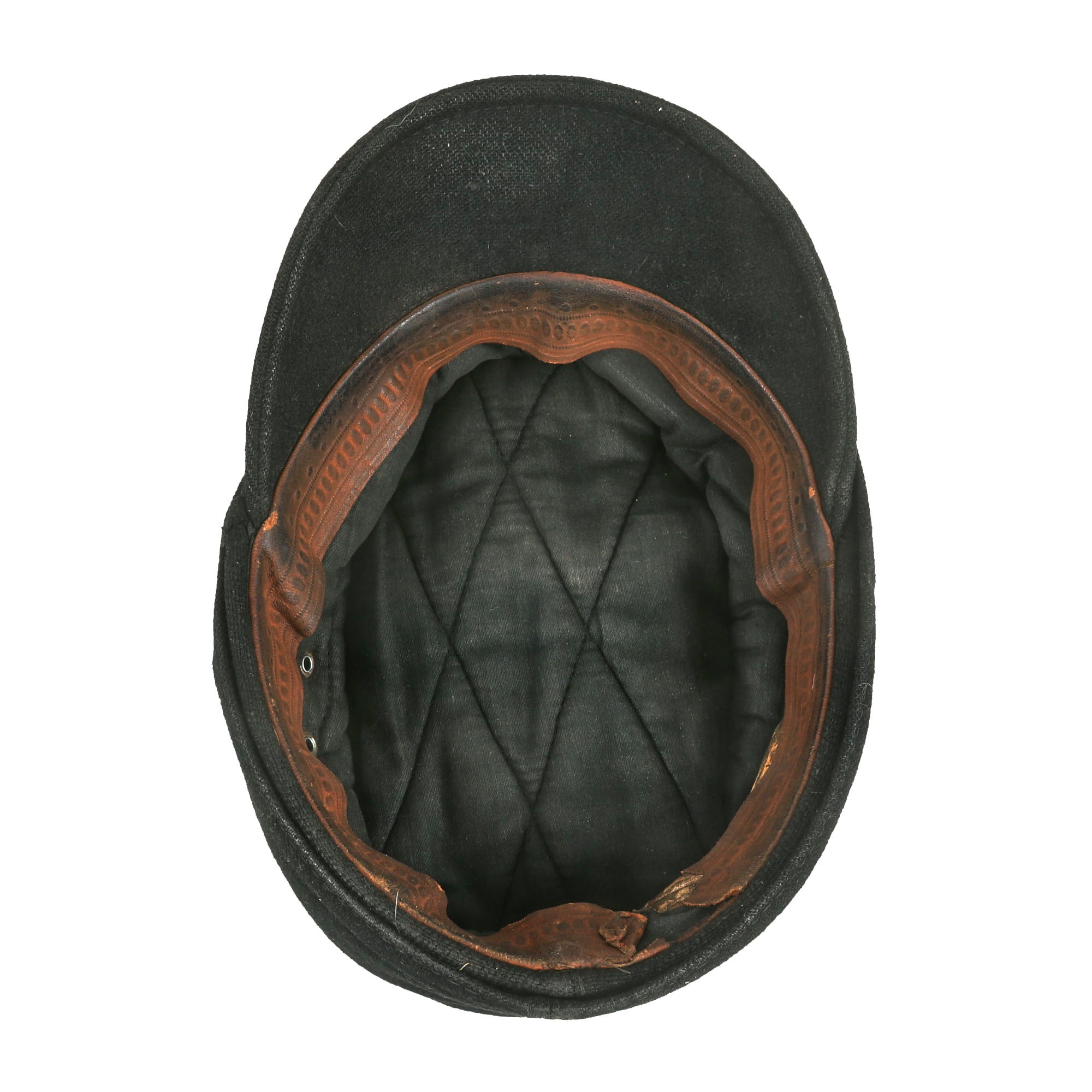 Overall condition is very good, with just a few spots of wear and mothing to the wool body. The visor is still quite well shaped, with just a bit of bending to the cardboard stiffener, and no cracks, though there are some parts that are a bit weak.