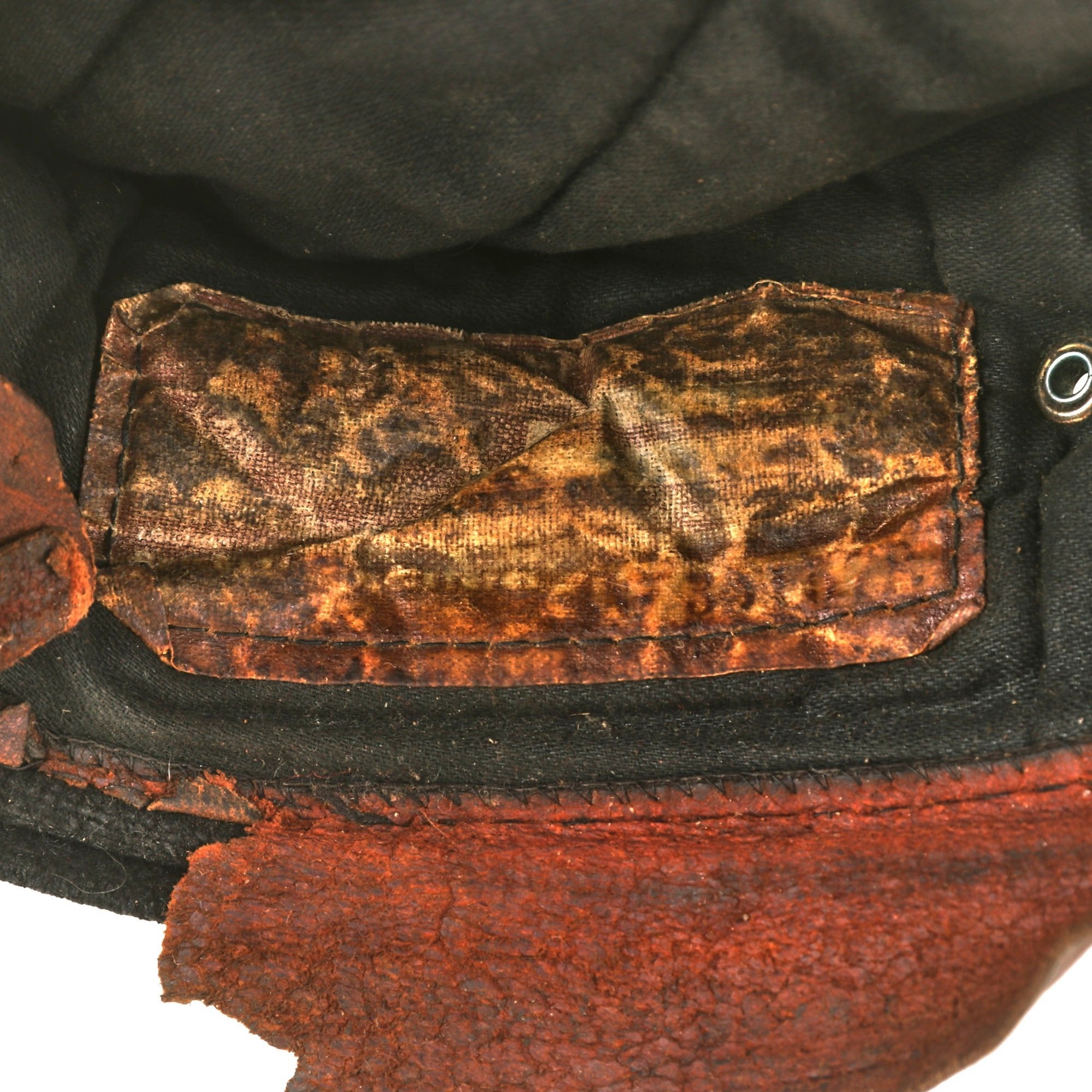 The interior of the cap is lined with black cotton twill, which has crisscross stitching to hold the insulation in place. There is a leather sweatband around the bottom edge, which shows significant wear and staining from service. There is an area at the back of the cap where it has torn out. There is also an original RZM label on the interior, but it is very faded, so we can only make out a few parts, such as "HJ - DJ".