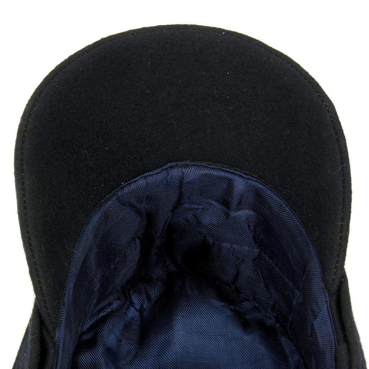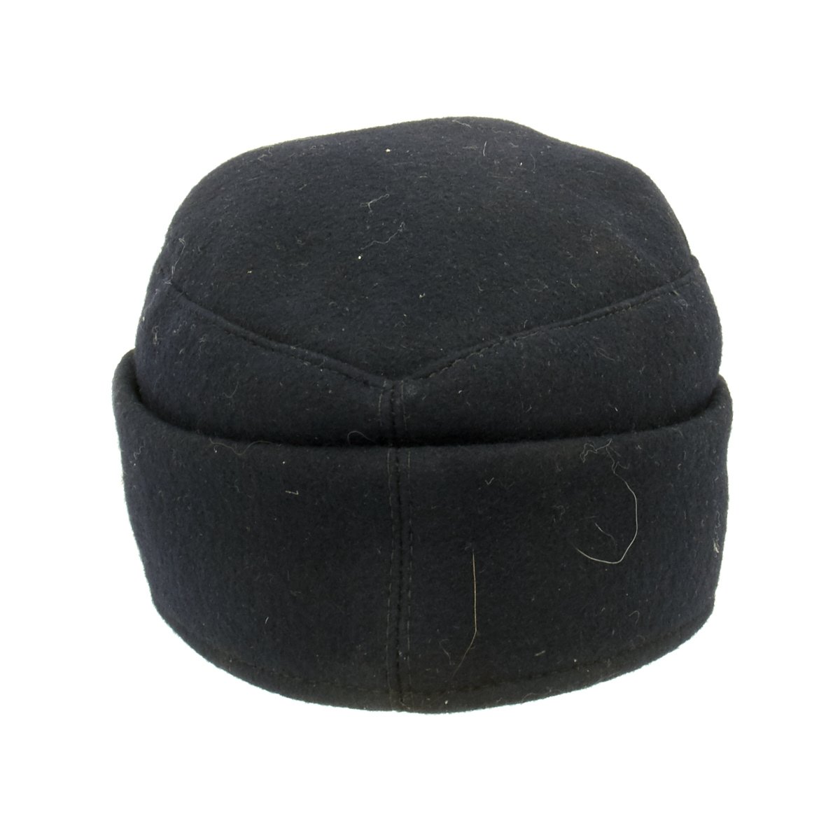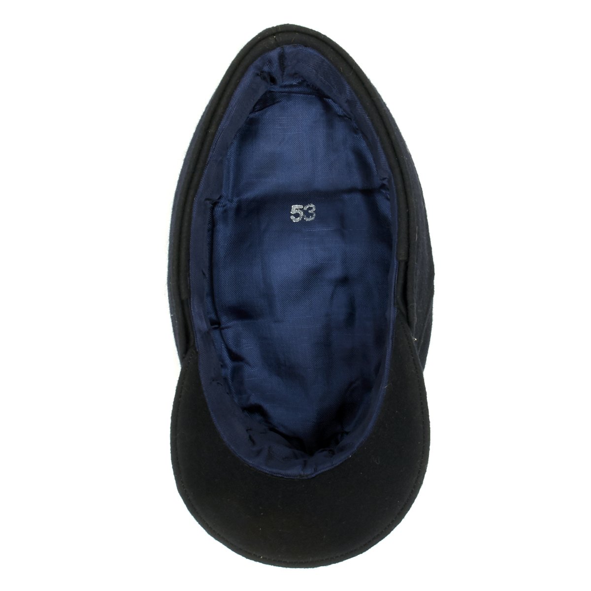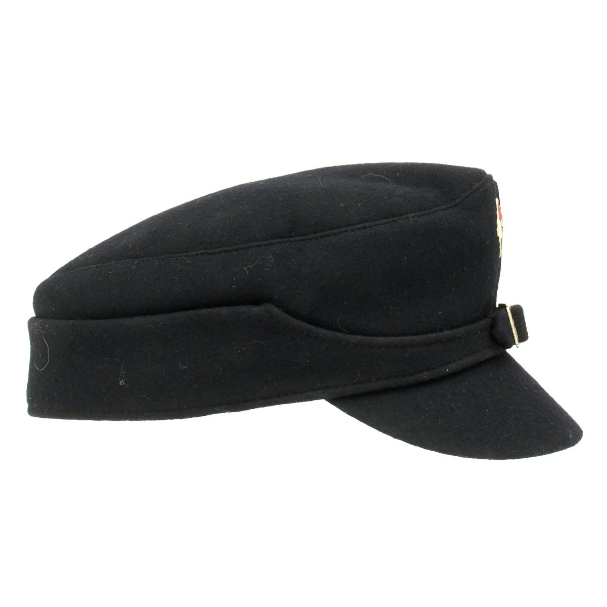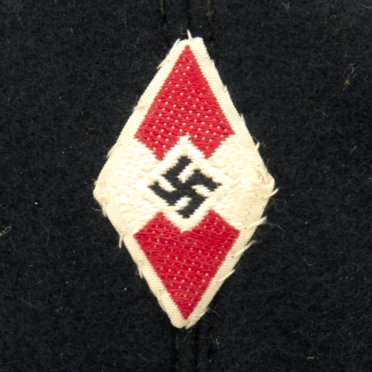 - Original Item: Only One Available. This is an excellent condition rare WWII HJ Ski Cap in black wool with a sewn on BeVo HJ diamond patch to front. It is quilted style liner and is thick construction. The lining is deep royal blue satin type fabric with size stamp 53 in crown. The ski cap retains its front buckle.