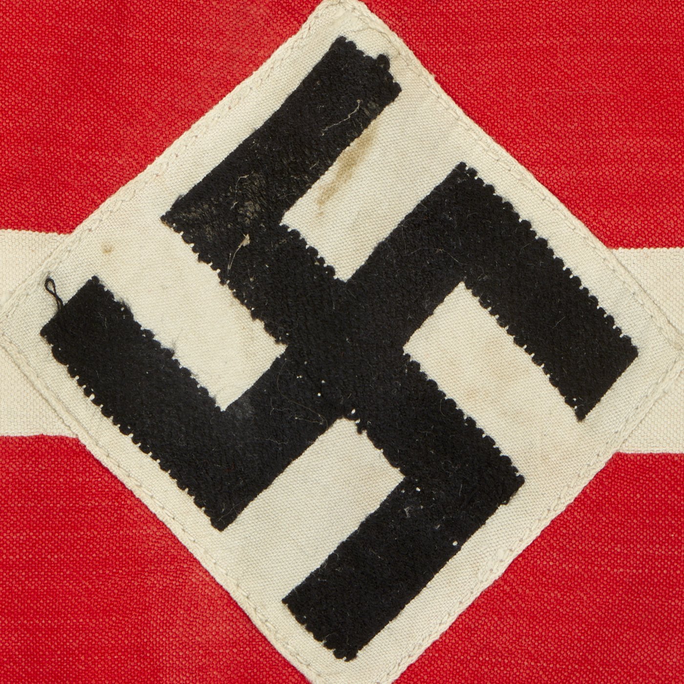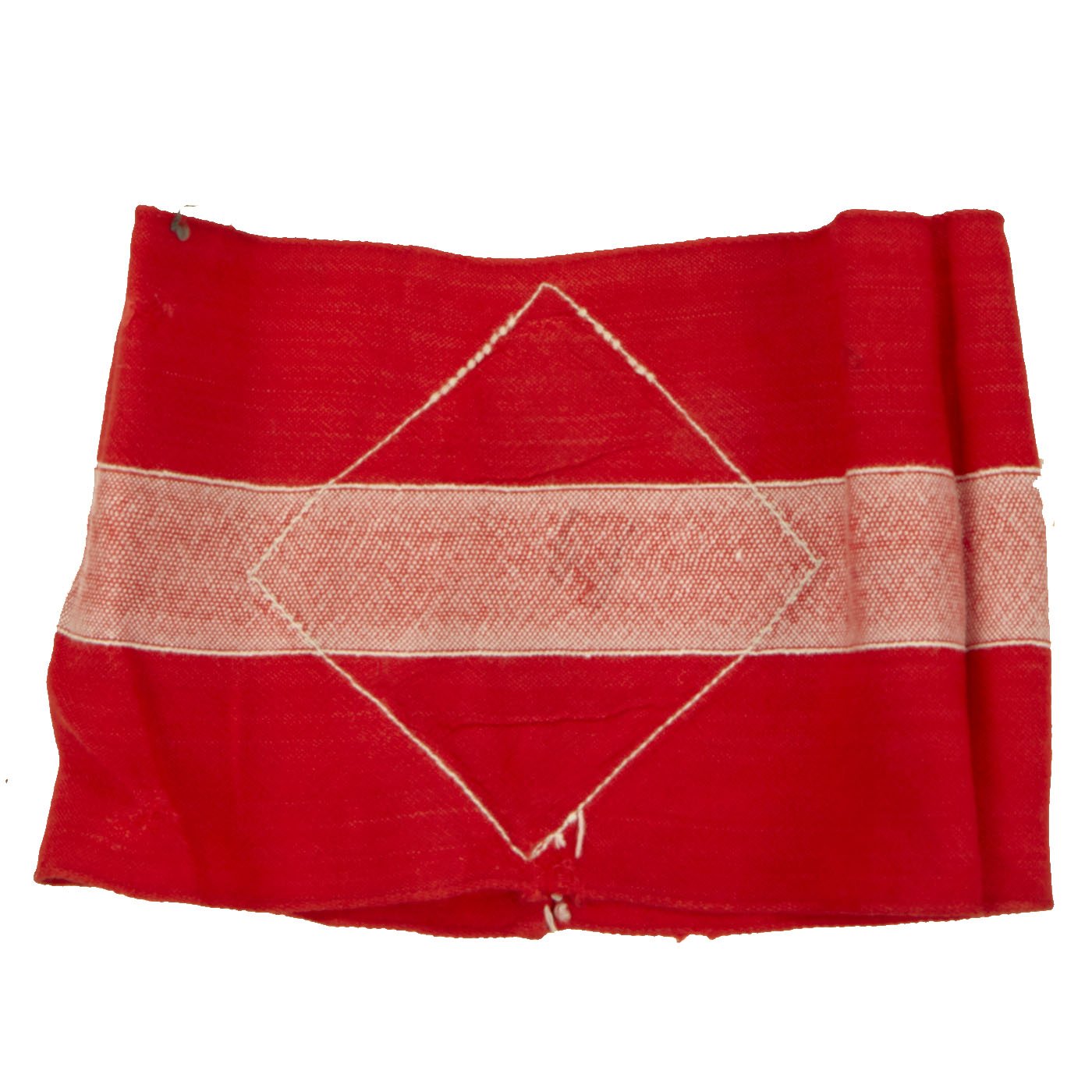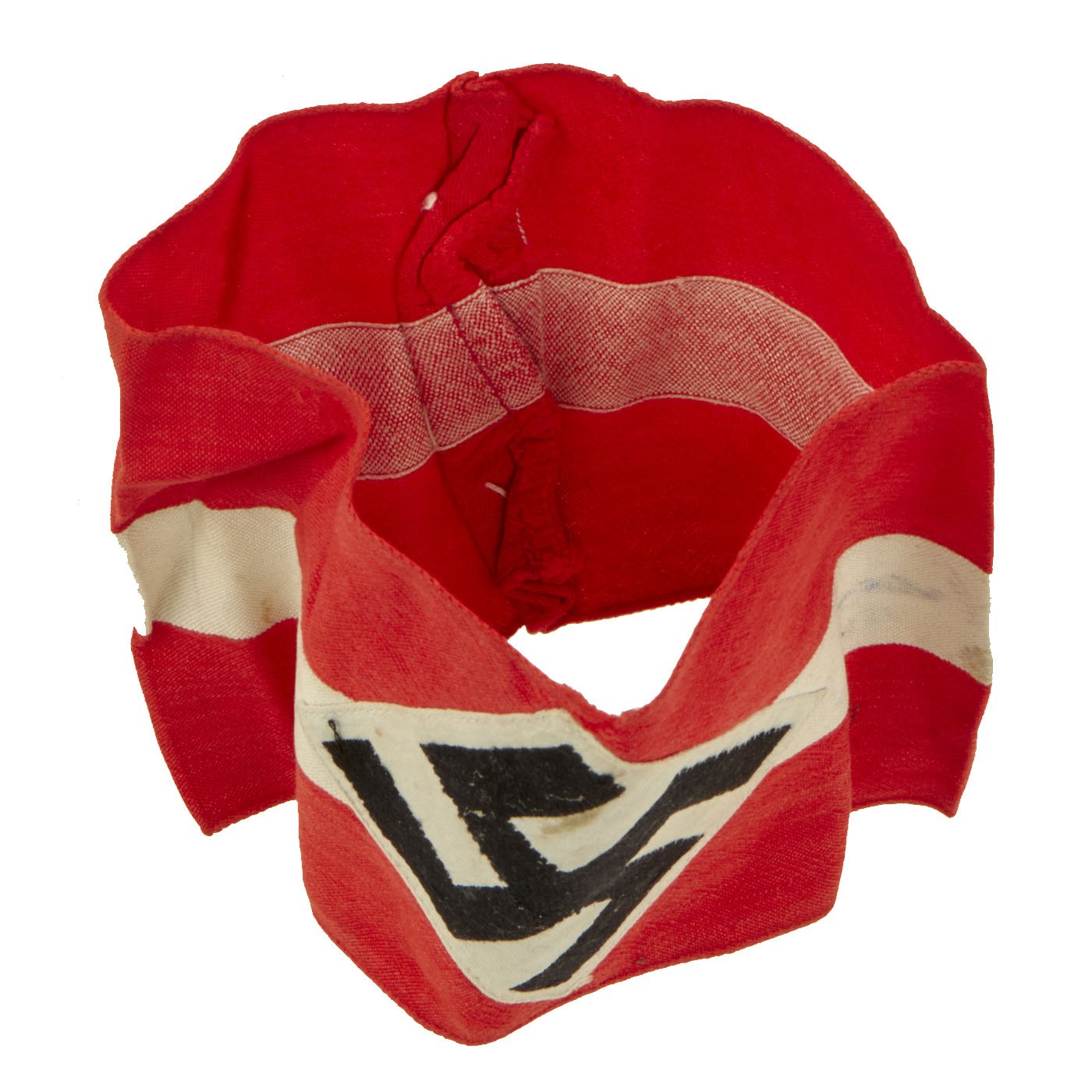 The band is red with a white center stripe that is a separate piece stitched onto it. There is also a machine stitch applied HJ diamond with a machine embroidered swas (Hook Cross).