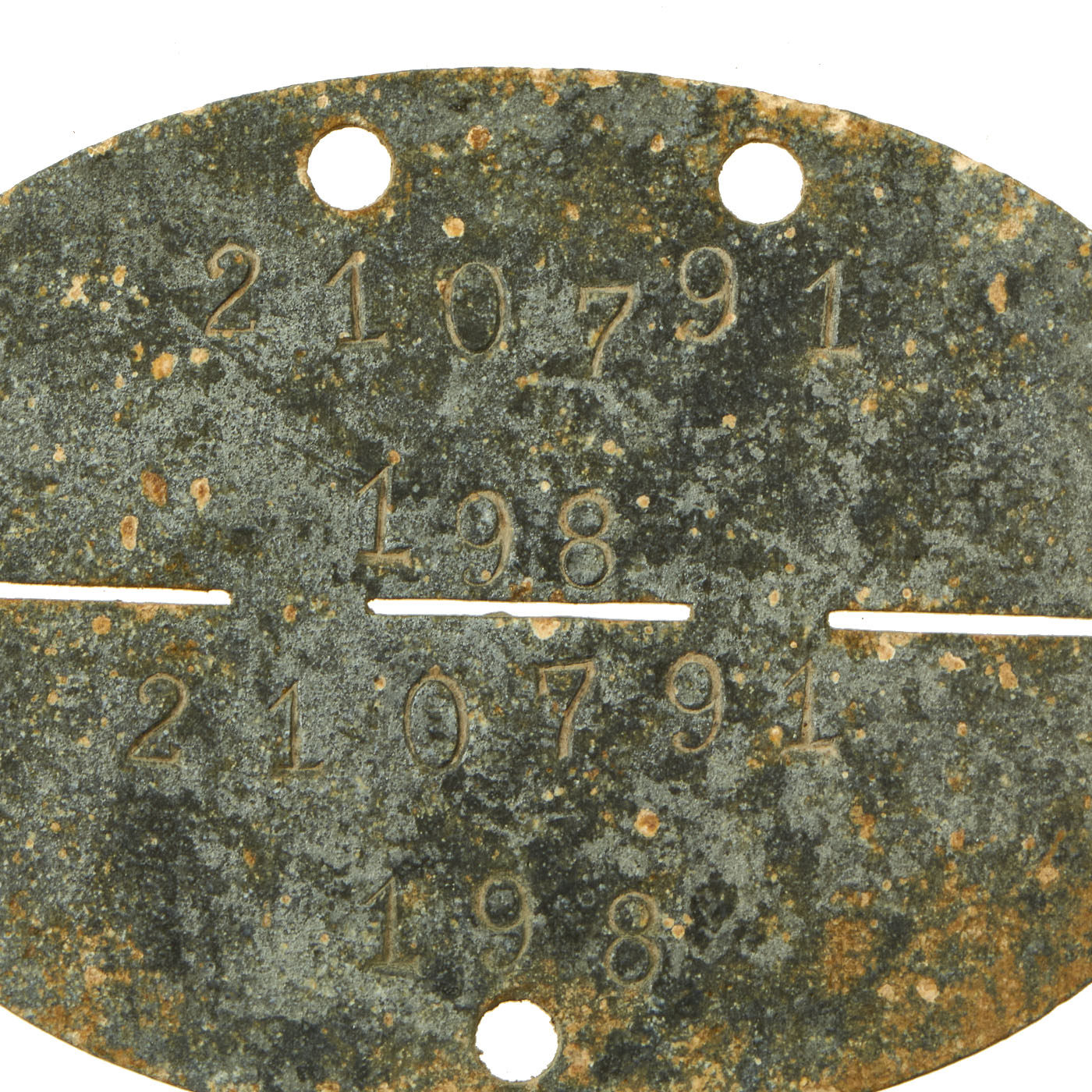 "198" is the soldier's ID number, and "210791" is the Luftwaffe Mobilierungs Nummer (Luftwaffe mobilization number) for 12. / Fallschirmjäger Regiment 16 (16th Paratrooper Regiment, 12th Company). This later became 8. / Fallschirm Panzergrenadier Regiment 3, Hermann Göring (3rd Parachute Armored Infantry, 8th Company), which was formed on 24 September 1944 in the area of Radom, Poland. It subsequently was joined with the Fallschirm-Panzer Division 1 Hermann Göring to form the Fallschirm Panzer Corps Hermann Göring. After heavy fighting against the Soviet Army in Prussia, Pomerania, Silesia, and Saxony, the Corps surrendered to Soviet troops on May 8, 1945.
