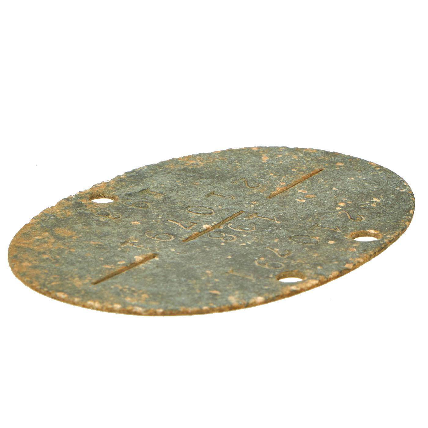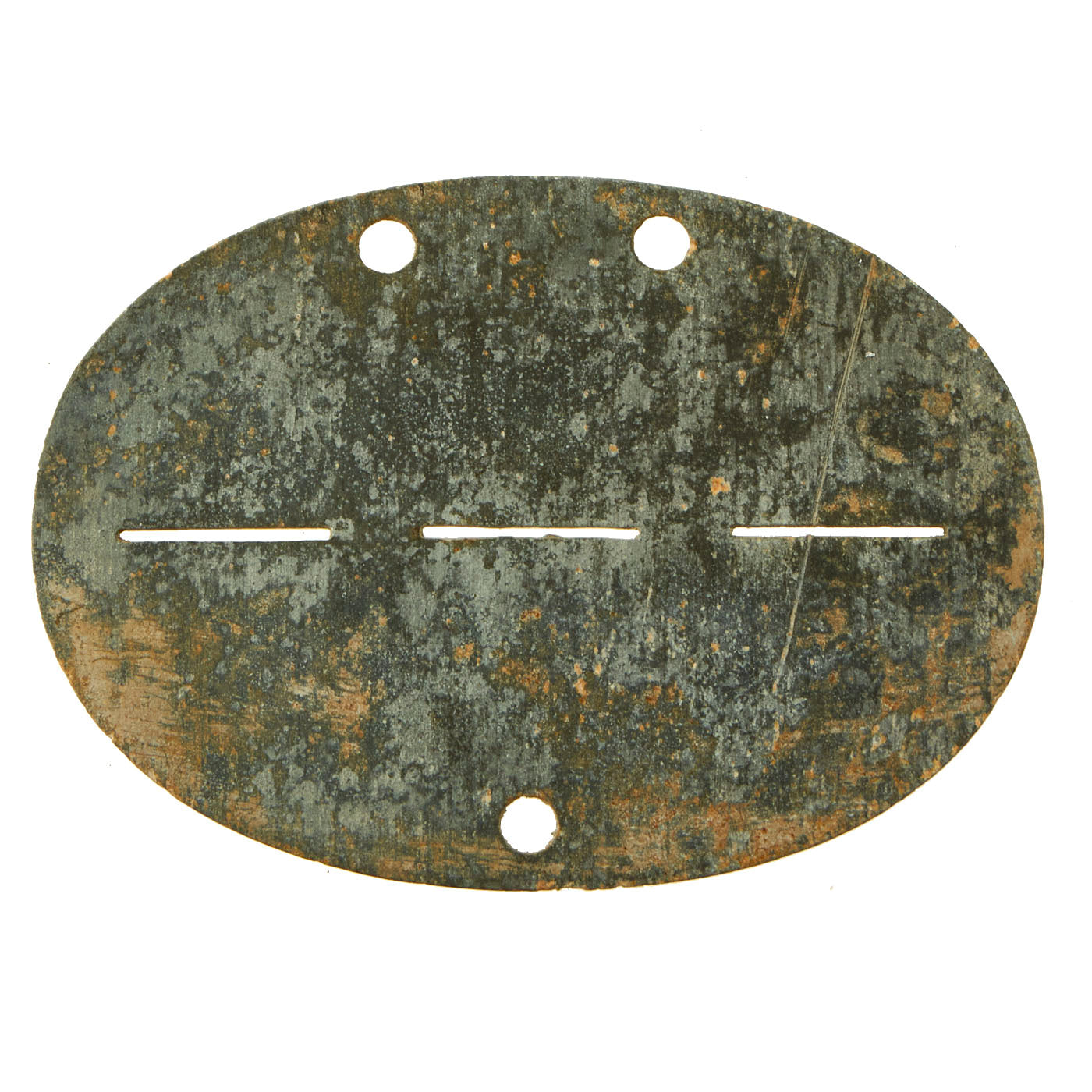 Original Item: One-of-a-kind. Genuine German Late WWII Hermann Göring Division identity disc (aka; Dog Tag) Erkennungsmarke, used to identify soldiers in the field. These were made of plated steel, aluminum, or zinc, and were designed so that if a soldier died, the bottom half of the tag would be broken off, while the other half remained with their body.