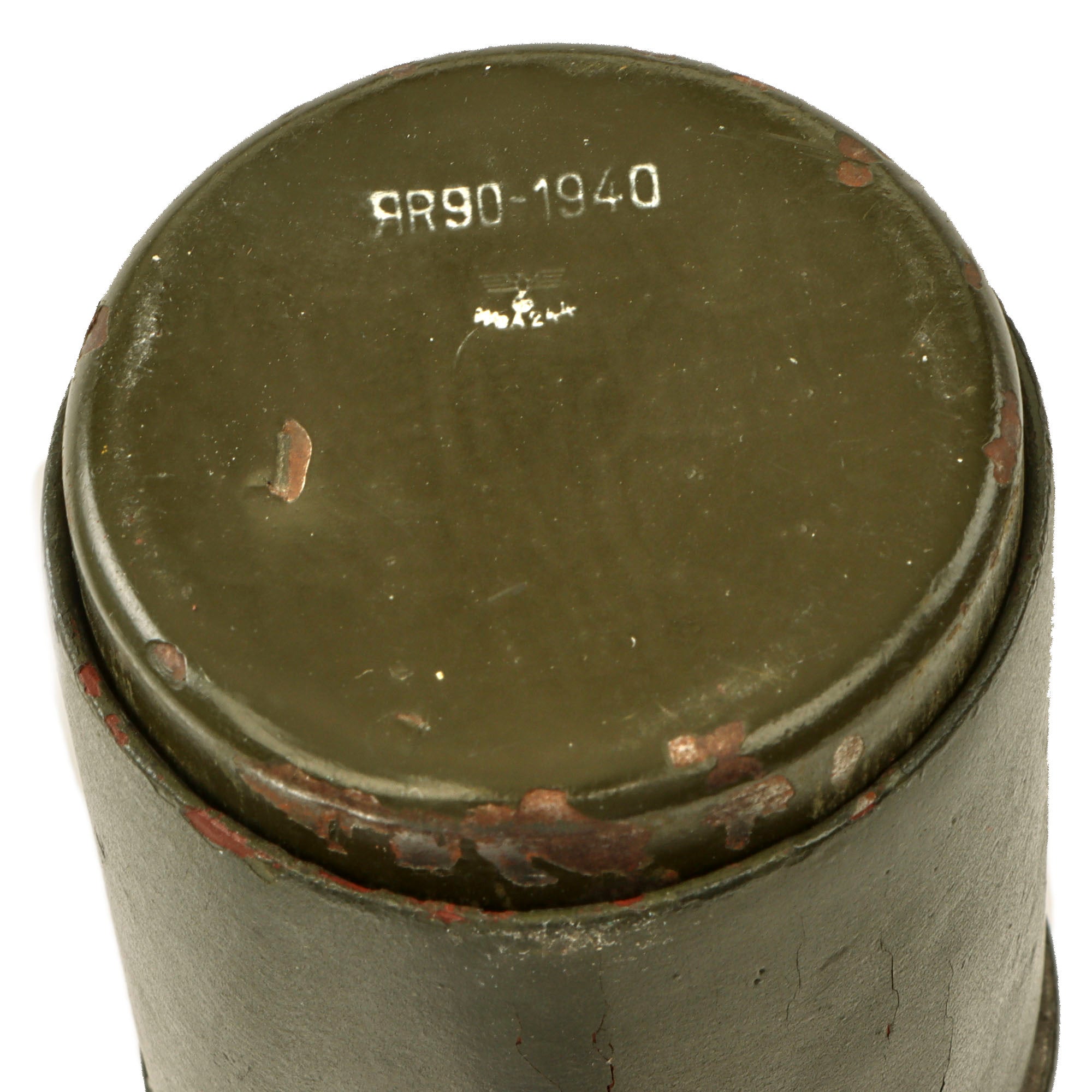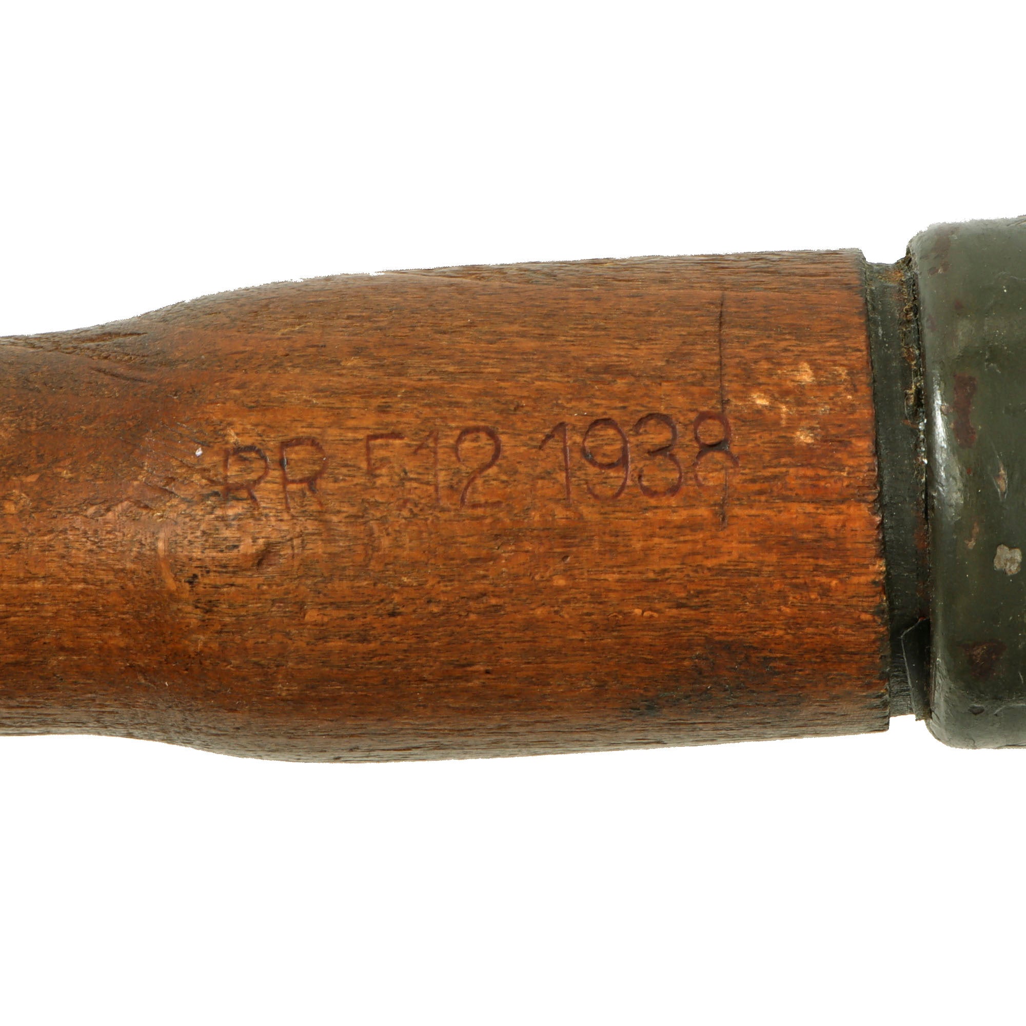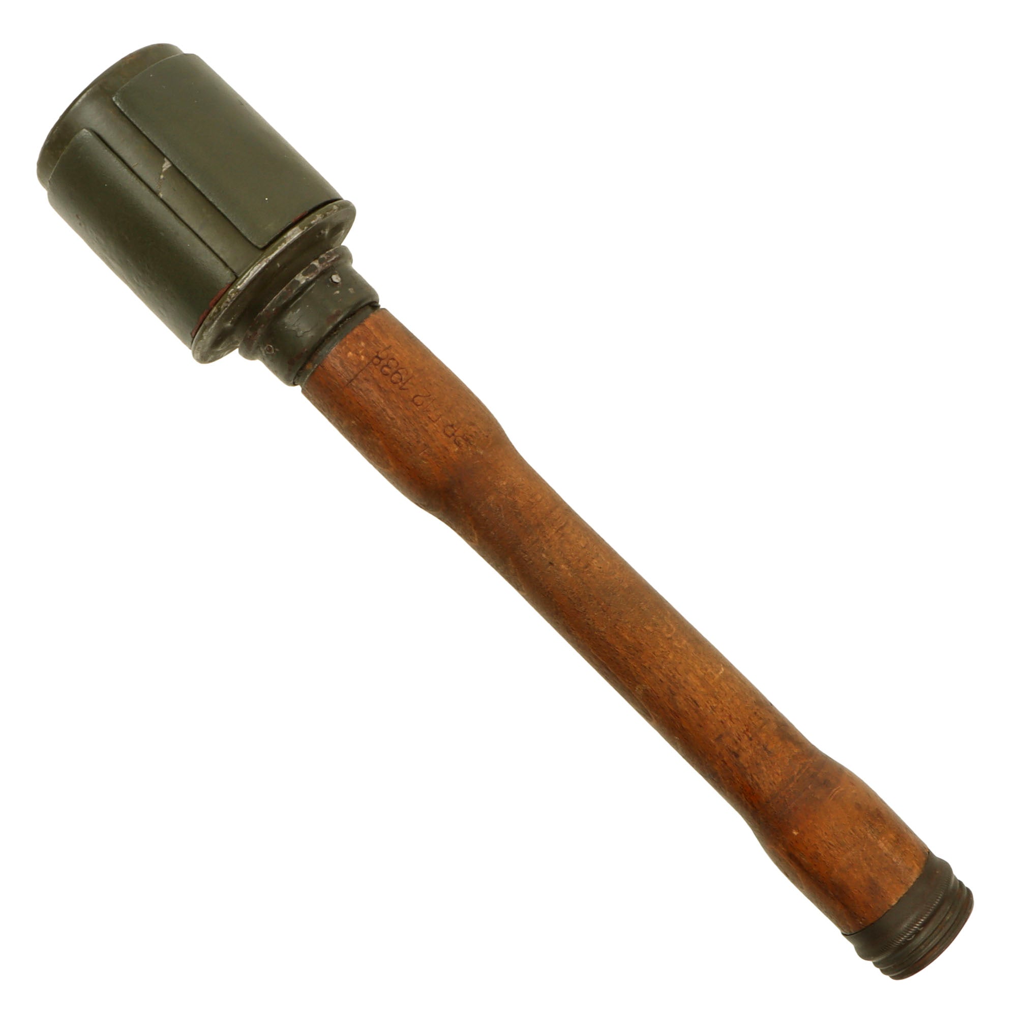 The wood shaft of the grenade is stamped ЯR 512 1938 for 1938 manufacture by subcontractor Wilhelm von Hagen Metallwarenfabrik, Iserlohn Westfalen. All early (pre/early 1940) Stielhandgranate 24 were marked with the letters "ЯR" to fool the Allies.