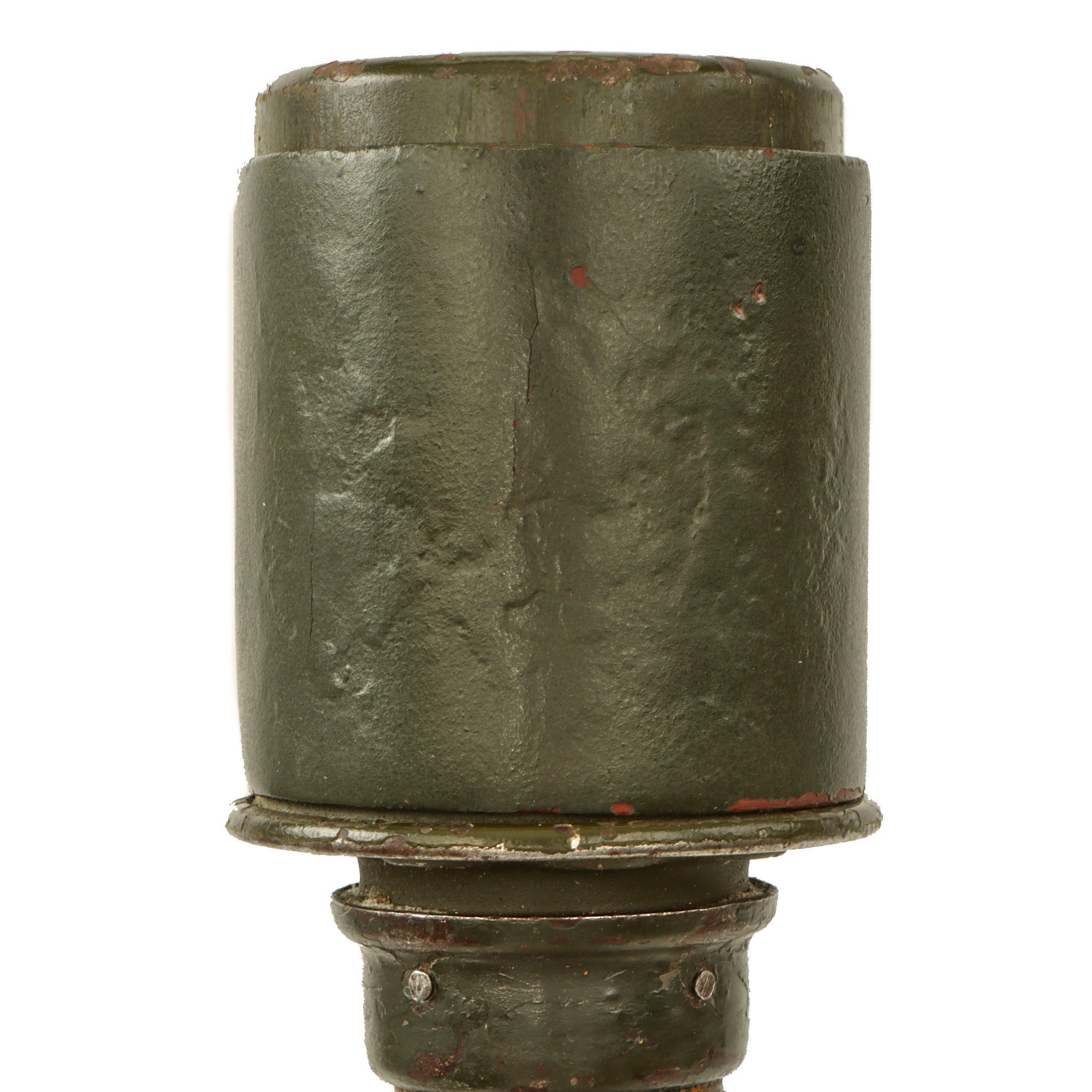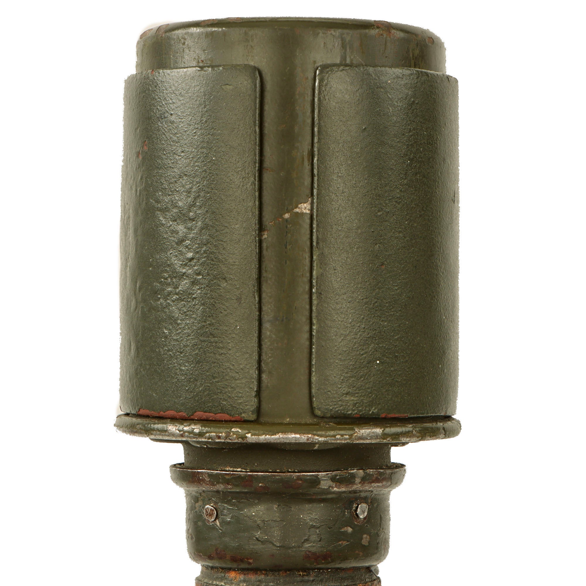 The warhead does not appear to be repainted, as the holes were punched in the side before the head was painted, but the stencil is gone. The warhead bears a Waffenamt WaA244 on the top, under the stamped maker marking ЯR 90-1940 for manufacture in 1940 by a subcontractor of Richard Rinker. Warhead is empty and demilitarized by means of drilling several holes into the side of the head, but thankfully they are covered by the fragmentation sleeve. The warhead is able to be unscrewed from the collar to inspect the interior.