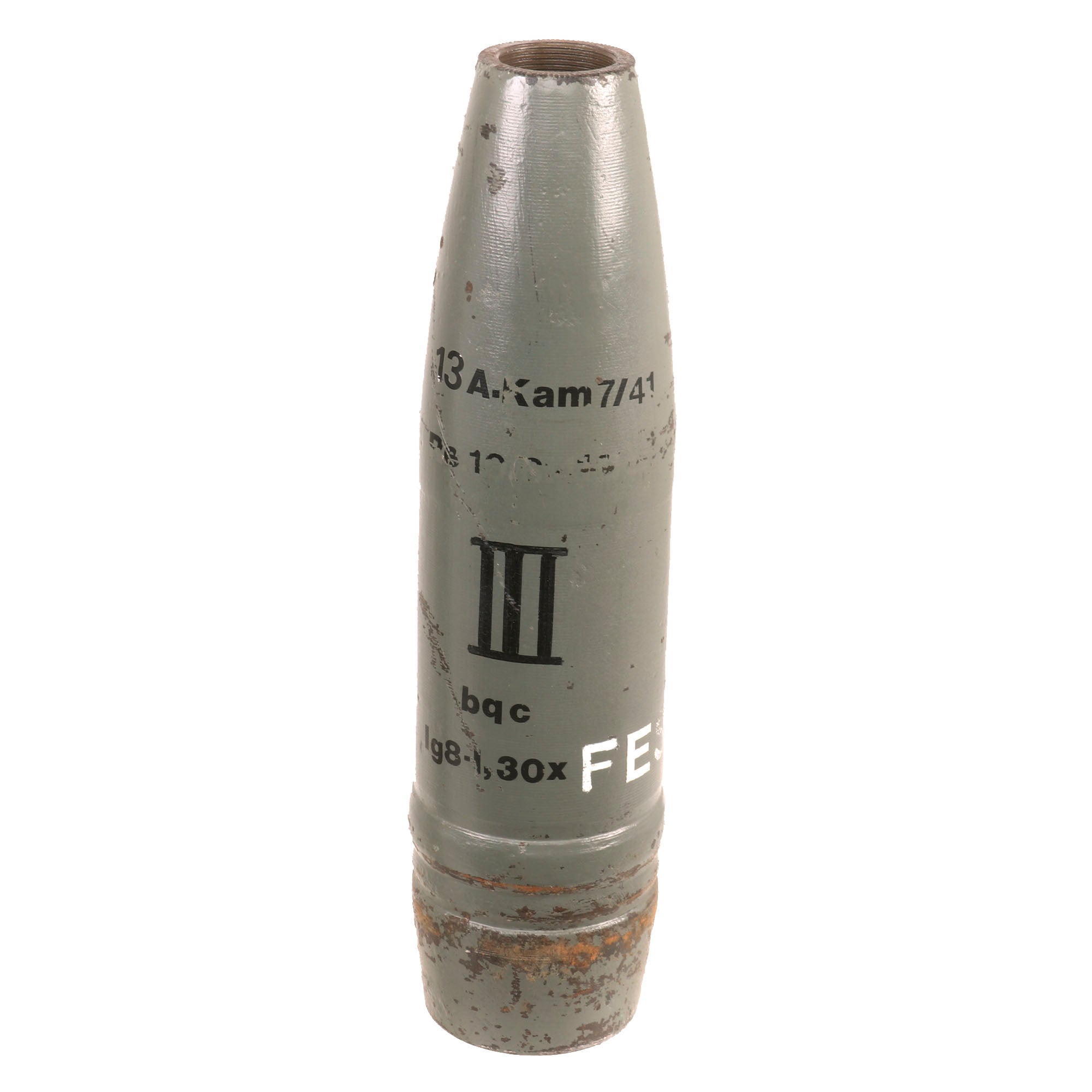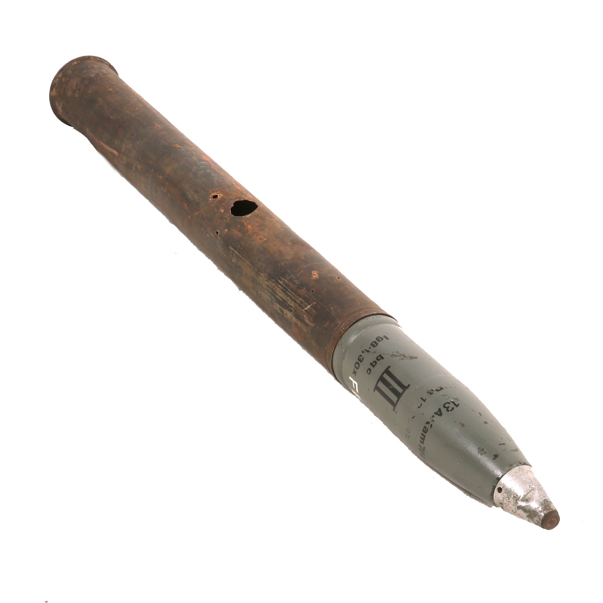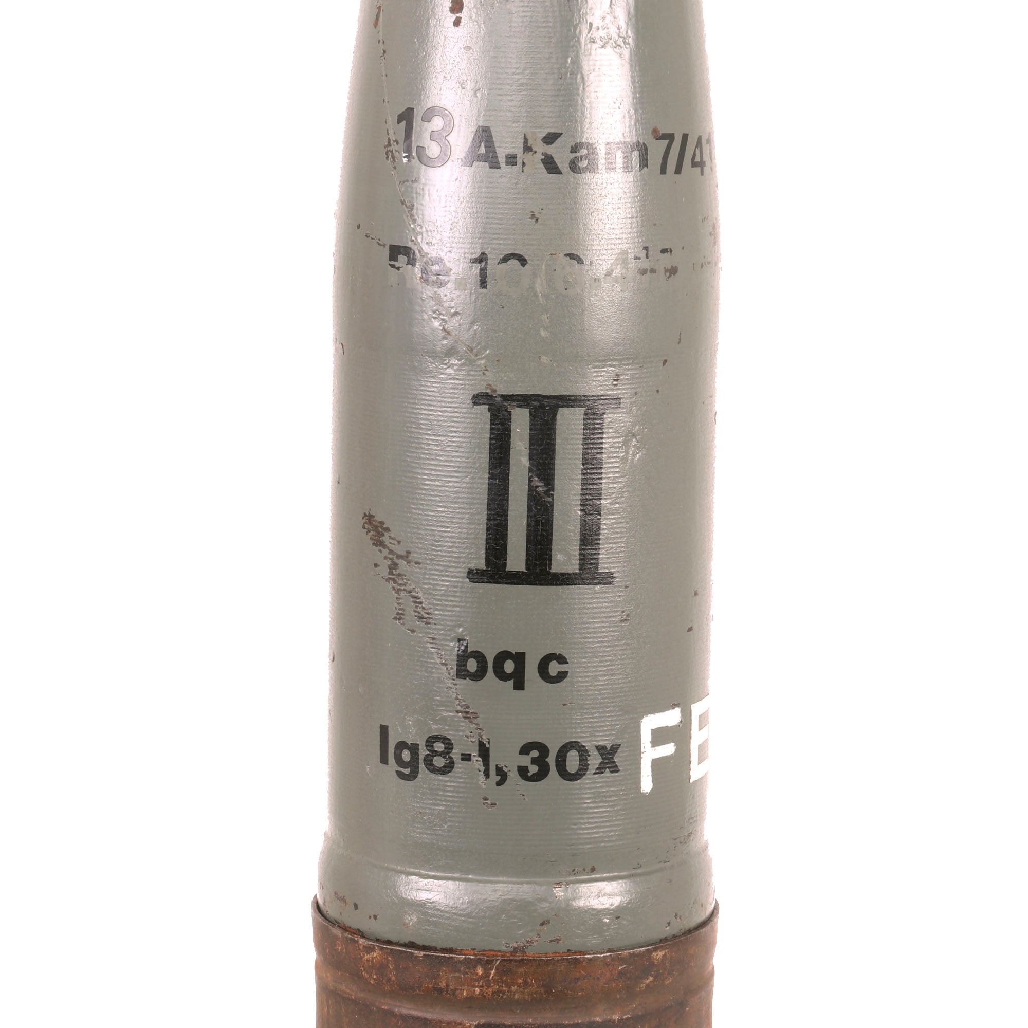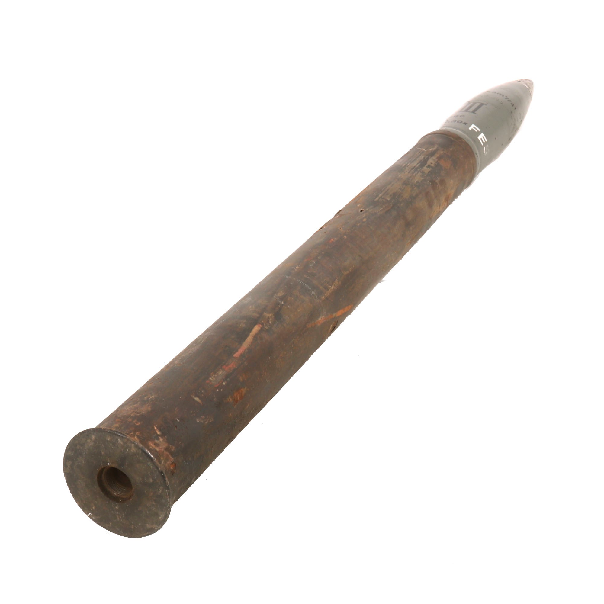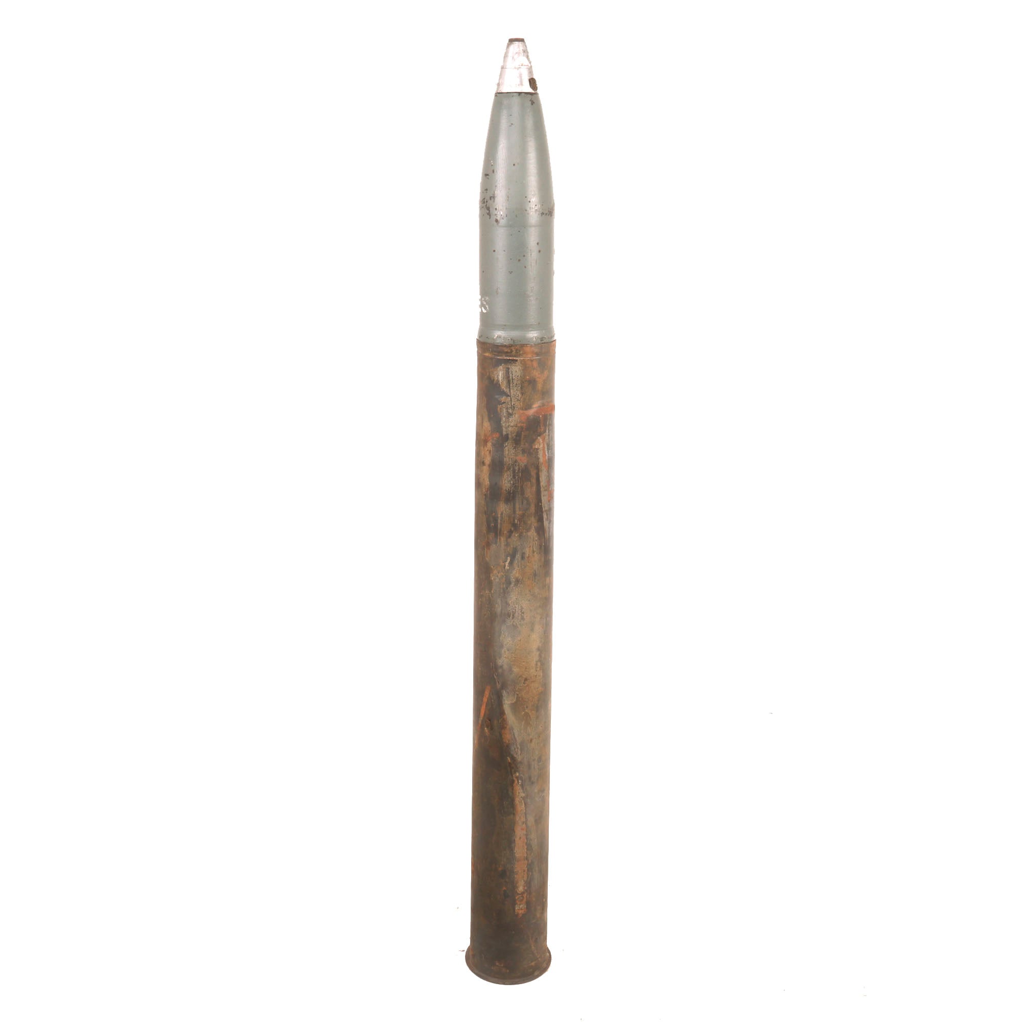 Original Item. Only One Available. The 7.5 cm Pak 40 (7,5 cm Panzerabwehrkanone 40) was a German 75 millimetre anti-tank gun of the Second World War. The gun was developed in 1939–1941 and entered service in 1942. With 23,303 examples produced, the Pak 40 formed the backbone of German anti-tank guns for the later part of World War II, mostly in towed form, but also on a number of self propelled artillery such as the Marder series of Panzerjäger. Like all decactivated ordnance, this projectile is Not Available for Export.This is a lovely round & casing for the Pak 40 Anti-Tank gun. The original fuze has heavy wear but still retains markings:klAZ23umgM- V-0,15 44 myx (WAFFENAMT EAGLE) WaAAThe code myx indicates 1944 manufacture by Rheinmetall-Borsig AG, Werk Sömmerda in Thüringen, a maker of artillery and vehicle parts.The projectile is painted green (appears to have been repainted recently) and retains its painted markings:13A.Kam 7/41IIIbqclg8-I, 30x FESThe body of the round is also stamped with code bqc, an unknown maker.The original casing is very heavily oxidized with a large and small hole in the side from loss of material. The bottom of the casing is marked:bwx126avt 44Waffenamt WaA4606340St7.5cm Pak40This indicates 1944 manufacture by Silva Metallwerke GmbH, Magdeburg. The round with the projectile and fuze inserted measures roughly 39½” tall.A good example with markings and paint retained, ready for further research and display.A modified version of the gun designed specifically for vehicle-mounting was the 7.5 cm KwK 40, which differed primarily in using more compact ammunition, thereby allowing more rounds to be carried inside the vehicles. The KwK 40 armed many of the German mid-war tank designs such as the Panzer IV, as well as tank destroyer designs, replacing the Pak 40 in the latter role.The Pak 40 may be referred to as the 7.5/L46, referring to its calibre and the barrel's length in calibres. There were two versions of the KwK 40, which would be referred to as the 7.5/L43 or 7.5/L48.