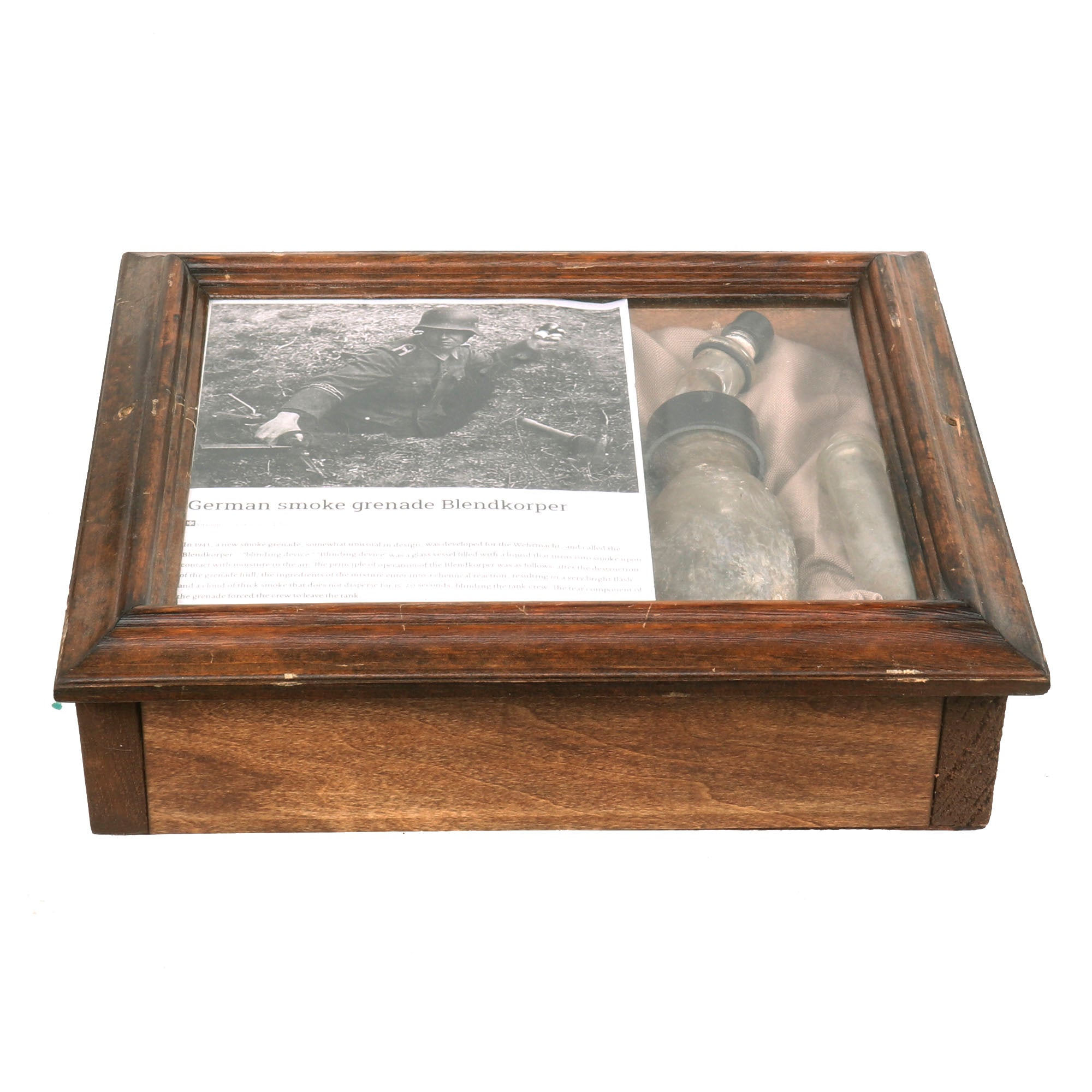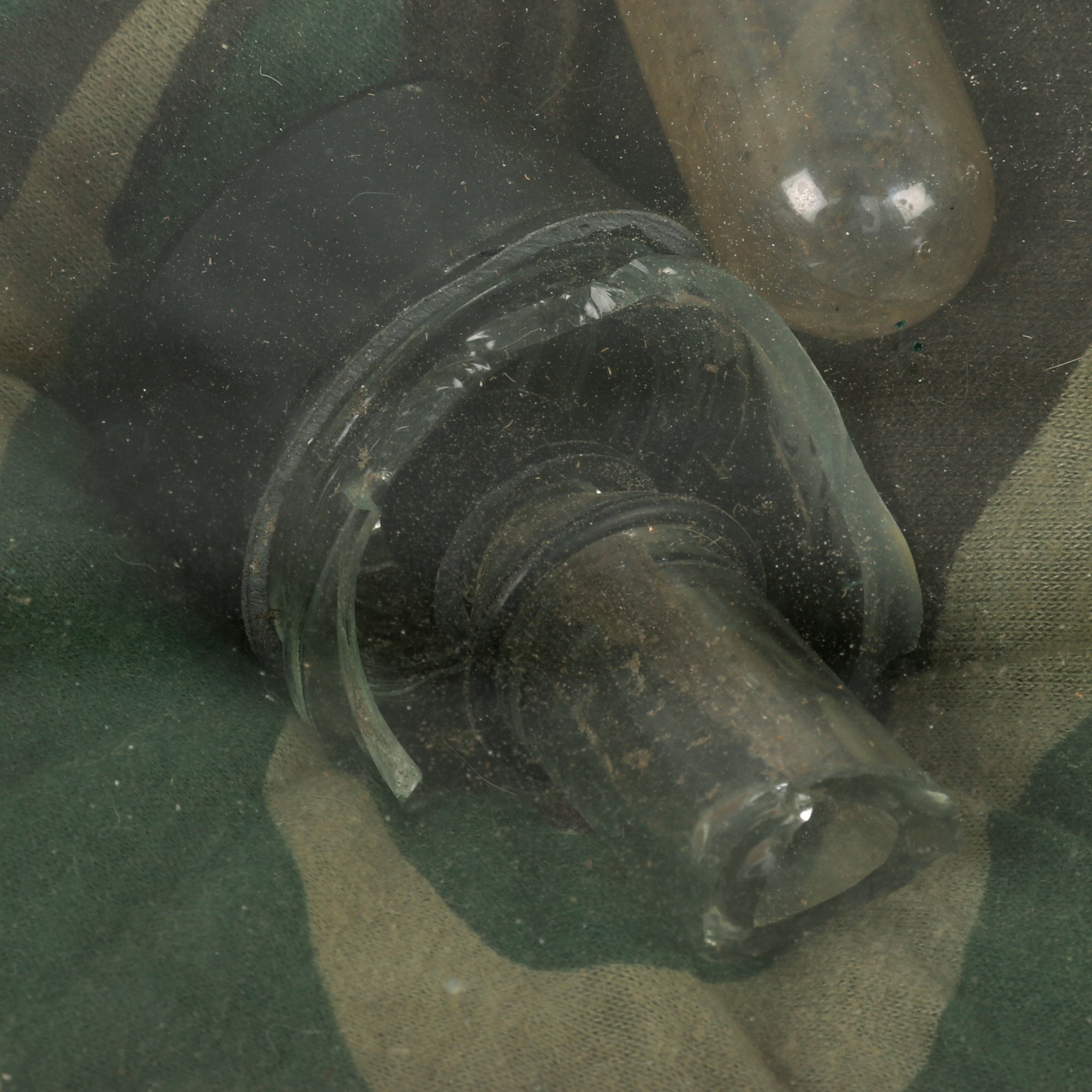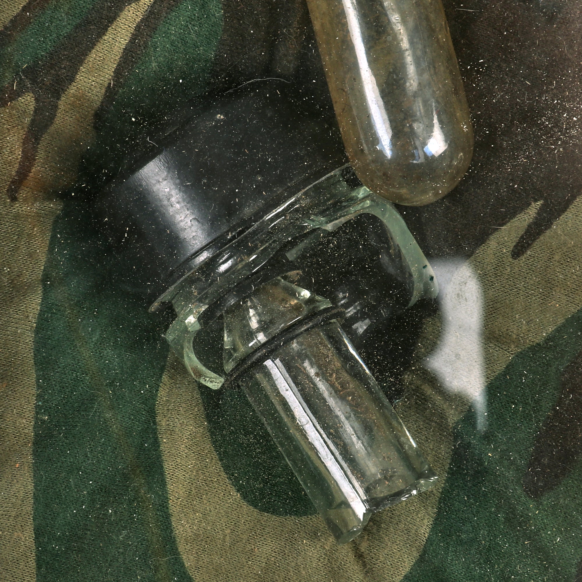 Original Item: Only One Available. This is an incredibly rare set of pieces of the second model Blendkörper (Blinding Device) BK-2H, introduced in 1943 as an anti tank weapon. It consists of a heavy glass bottle with a smaller glass vial nested inside. The dual bottle arrangement kept two chemical solutions separated. As with all deactivated ordnance, this is Not Available for Export.