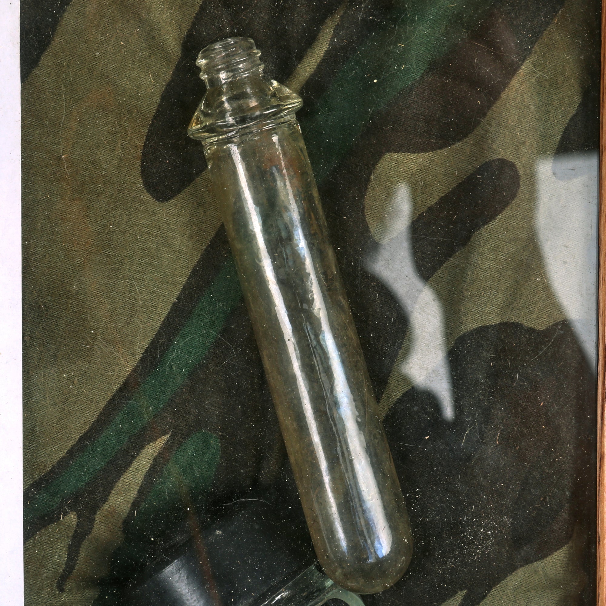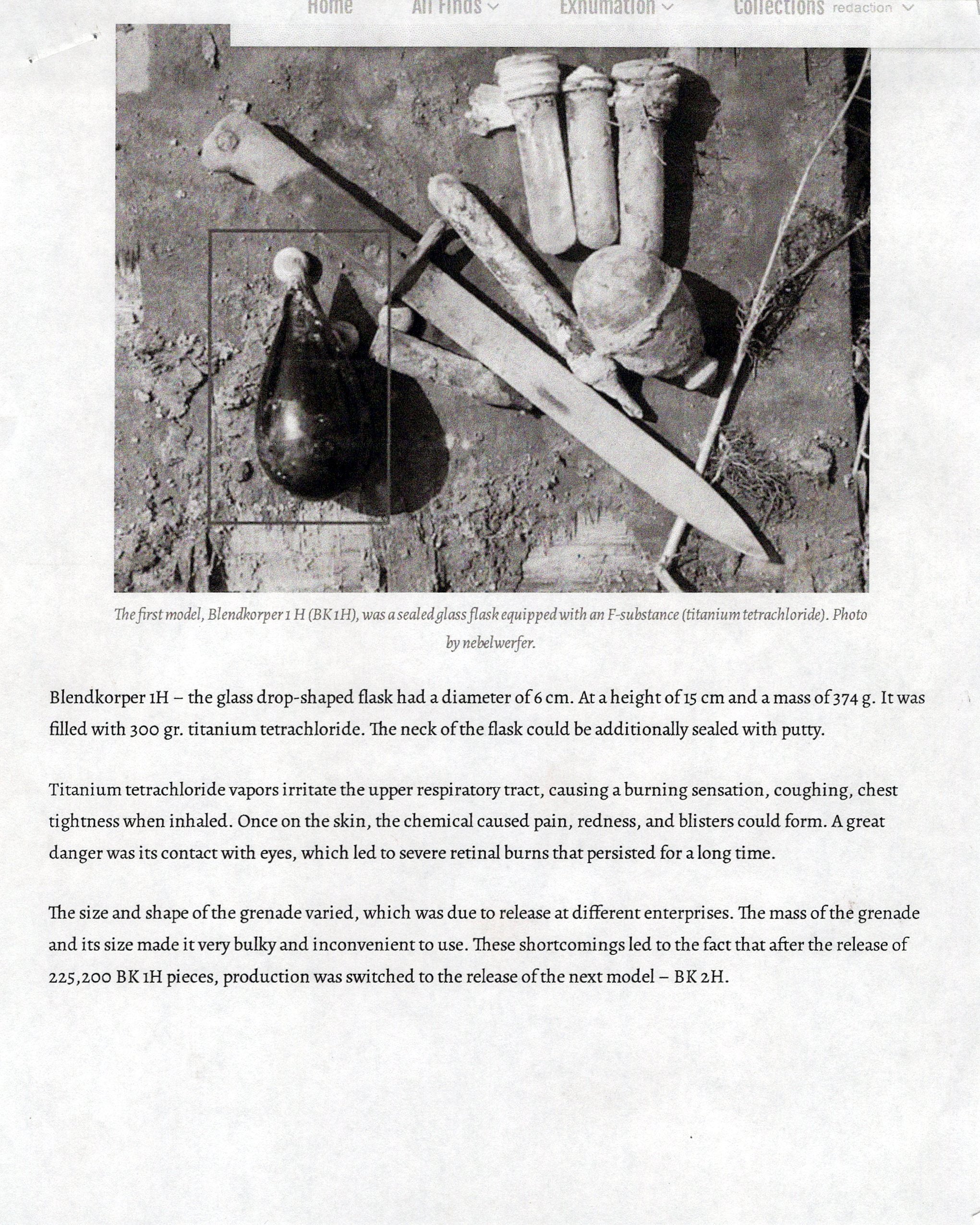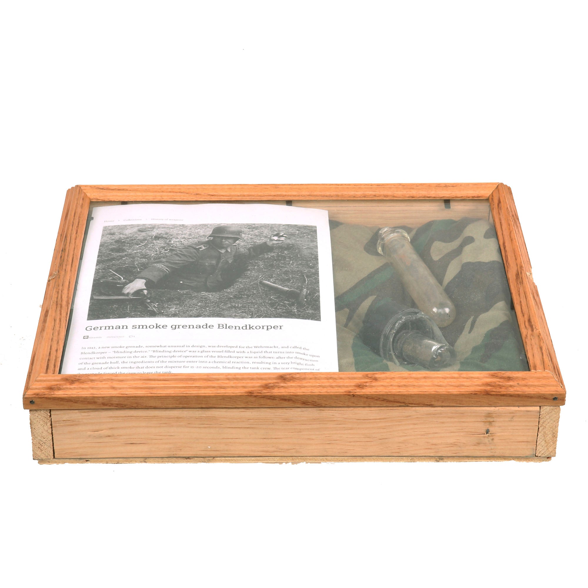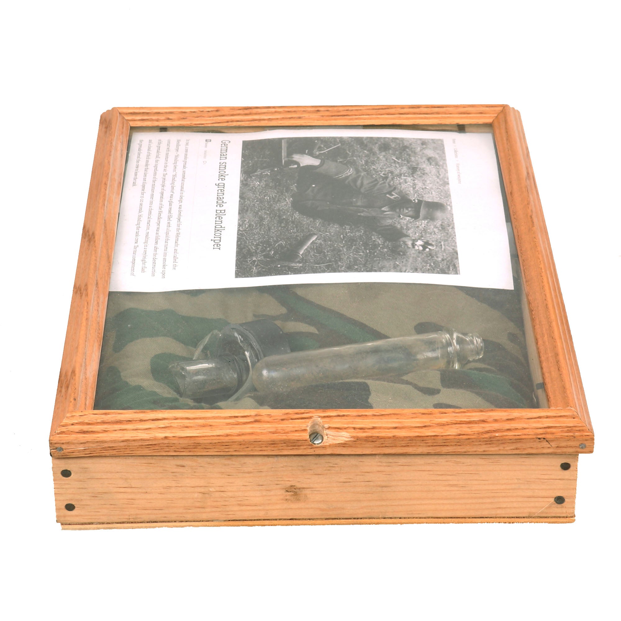Original Item: Only One Available. This is an incredibly rare set of pieces of the second model Blendkörper (Blinding Device) BK-2H, introduced in 1943 as an anti tank weapon. It consists of a heavy glass bottle with a smaller glass vial nested inside. The dual bottle arrangement kept two chemical solutions separated. As with all deactivated ordnance, this is Not Available for Export.