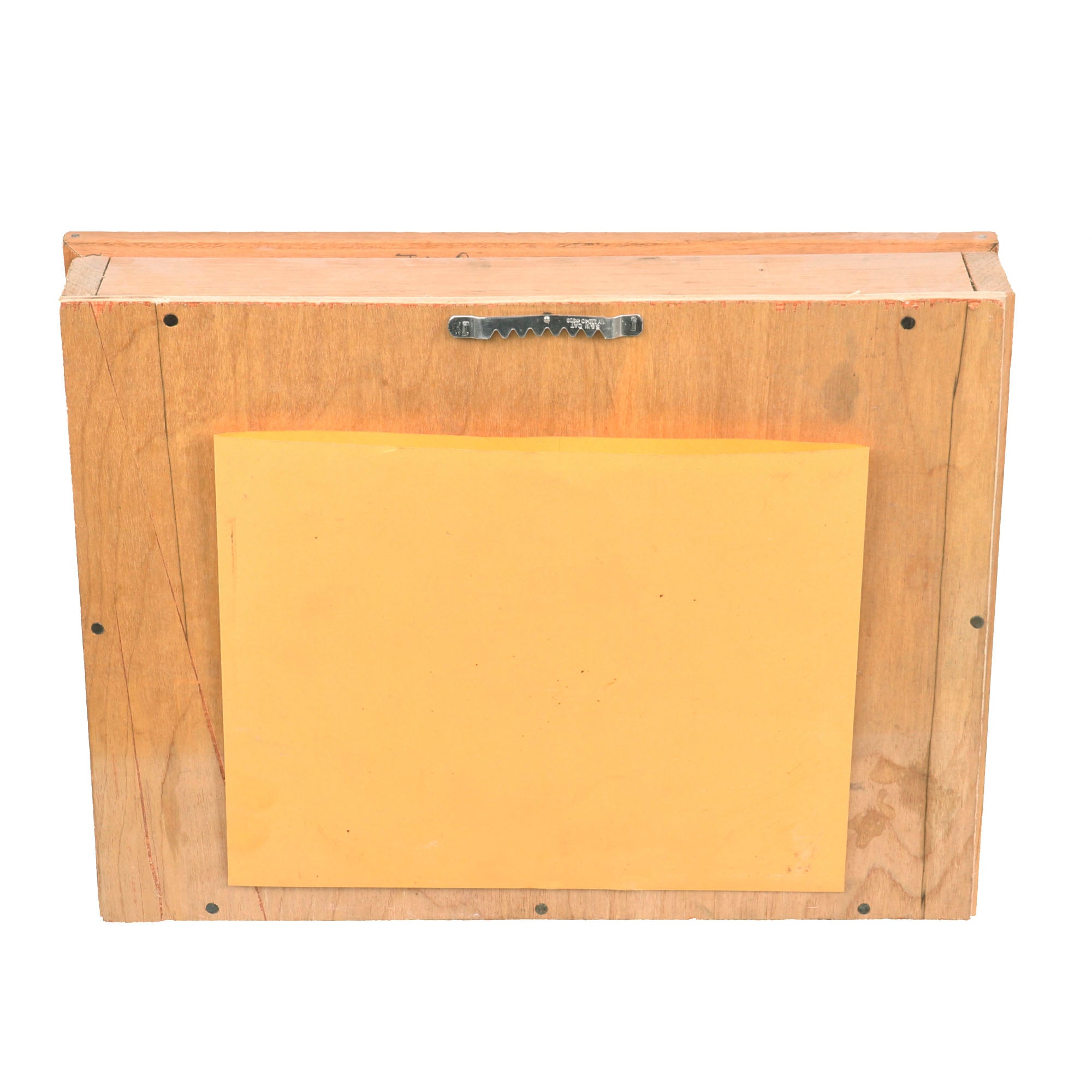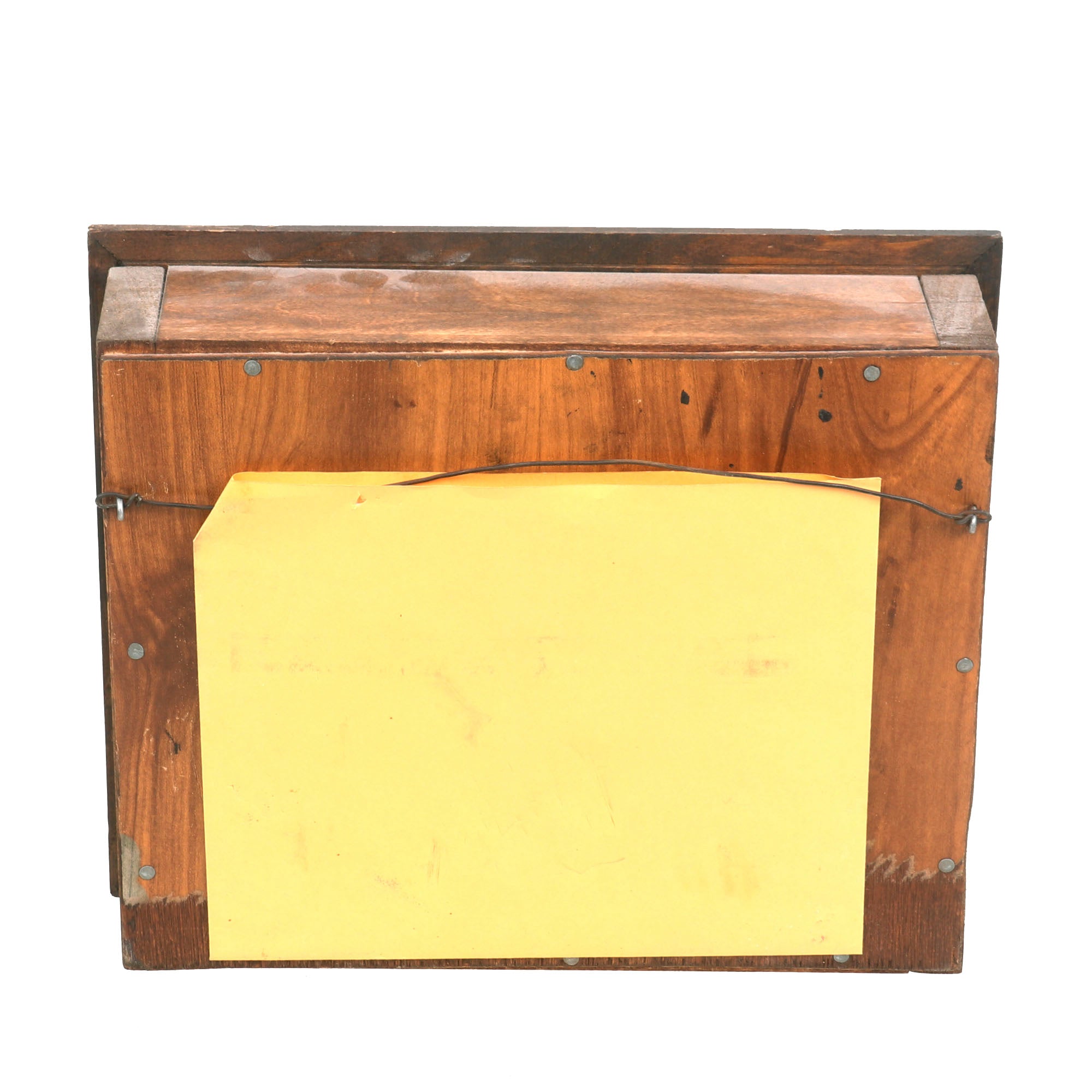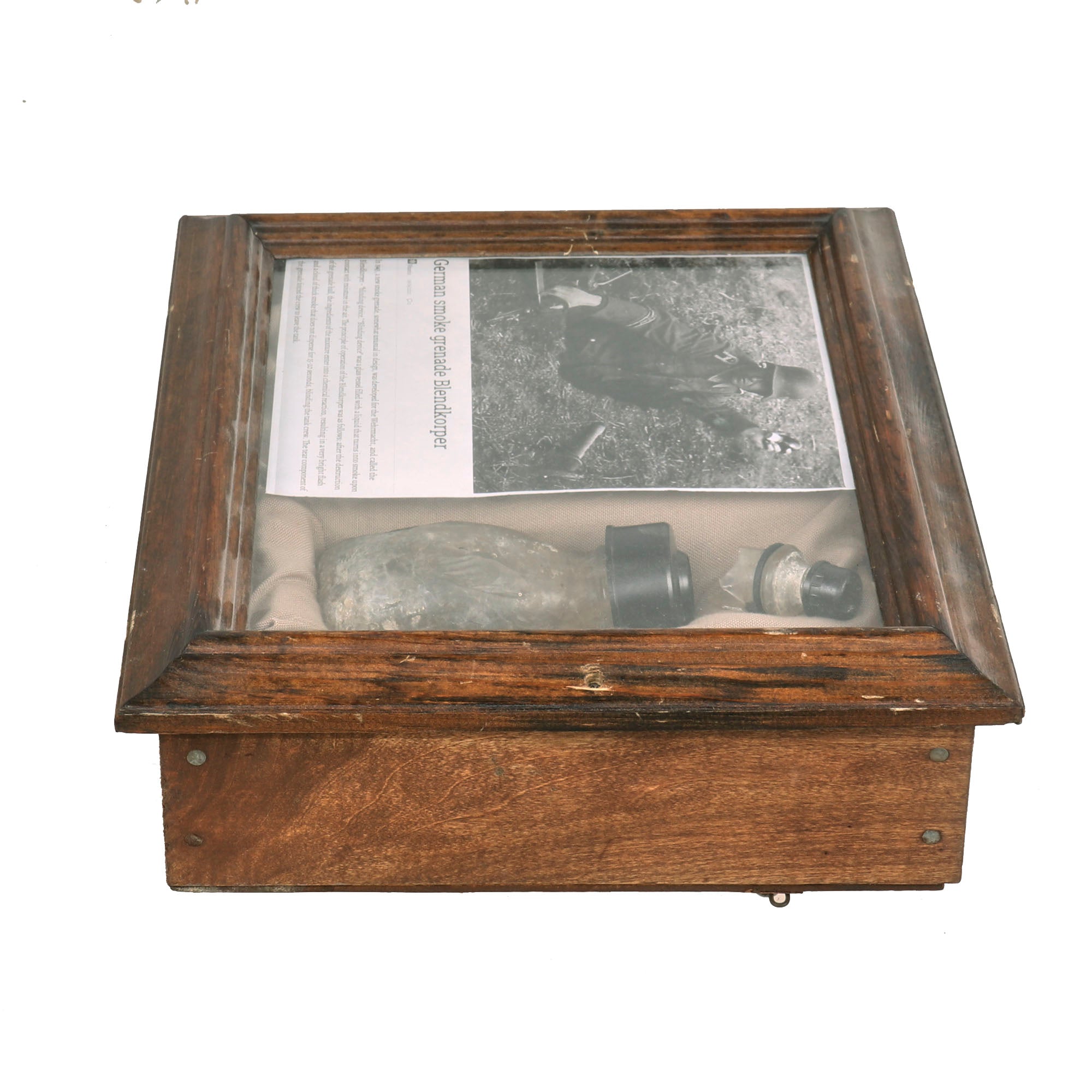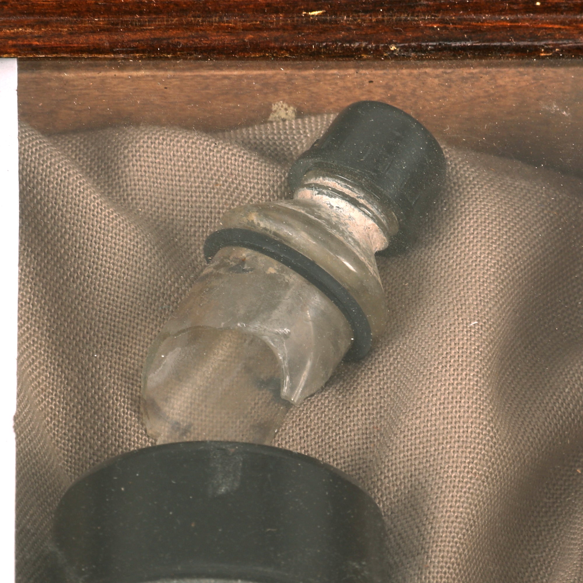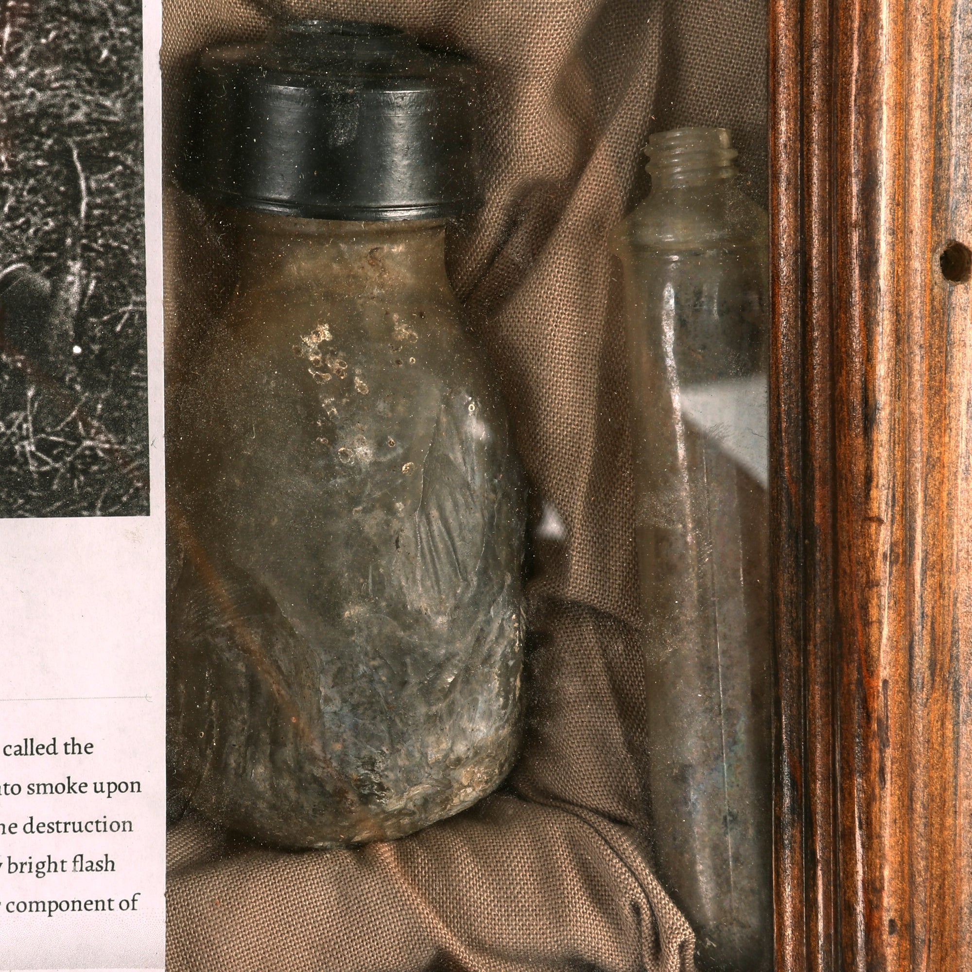 This set includes two separate wooden glass-top cases, measuring 12½ x 10½ x 3½” and 13¼ x 10¼ x 3¼”. The first case contains one very cloudy shell body with the cap, one separate interior tube, and the interior cap for another body. The second case contains one interior tube and one broken-off cap for a body. Both cases are lined with fabric to keep the pieces from breaking, with a small printed blurb about the grenades in each.