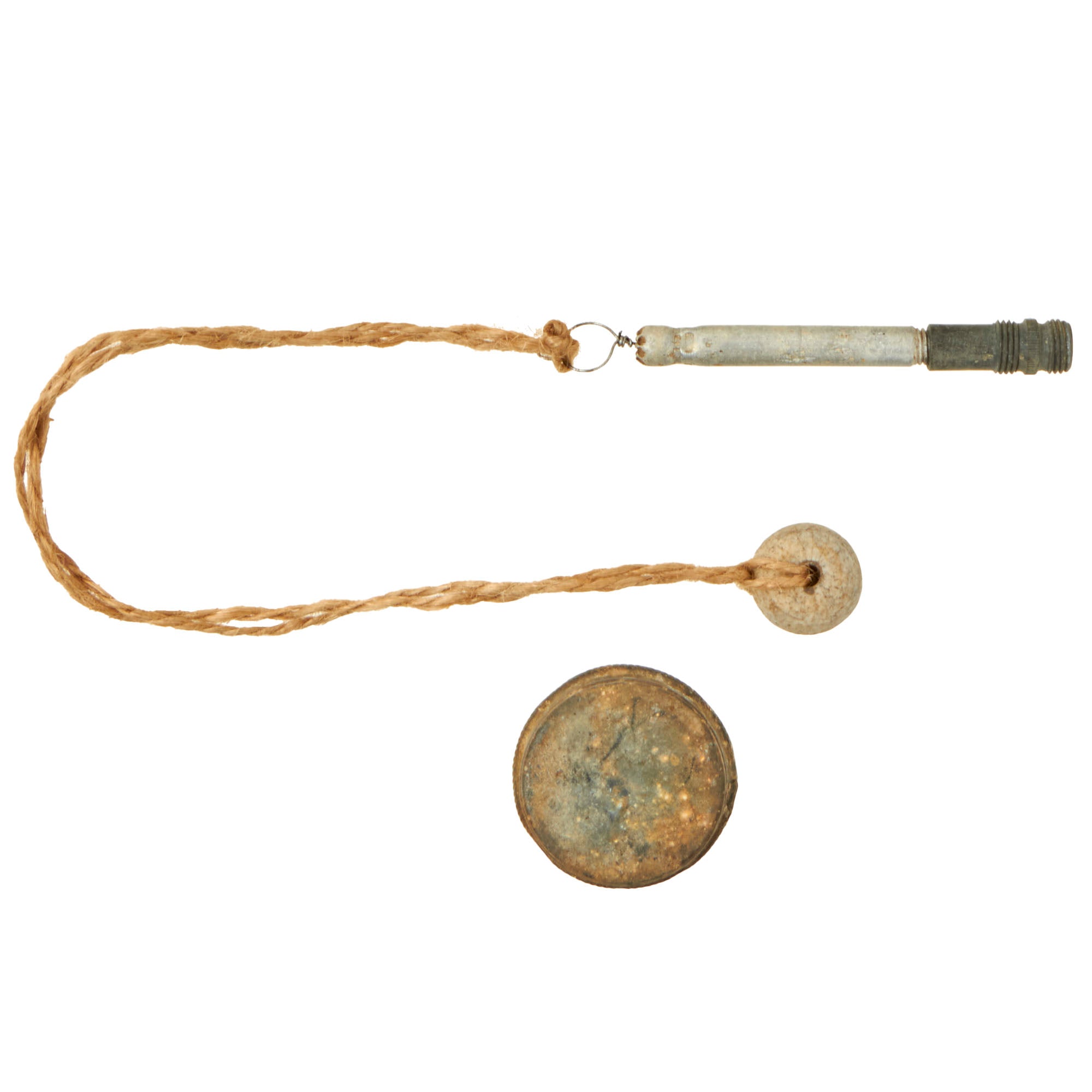 The Riker case measures roughly 12 x 16 x 2” and doesn’t have a lid, as it’s meant to display as is, with the grenade pieces bulging out. The shaft of the grenade is in rough shape with the top piece heavily oxidized with two of the screws loose, which are in a small plastic bag in the display. There are no visible markings left on the shaft or on the head. The head of the grenade has lost a great deal of its threading, so it will no longer screw onto the body. The head also appears to have been repainted its original green color. The full original pull-cord, bead, and fuze are retained and are displayed on their own in the case. The bead is still fully attached to the string, and the fuze is still fully connected to the string. The bottom cap of the grenade is also still intact and displayed off of the grenade.
