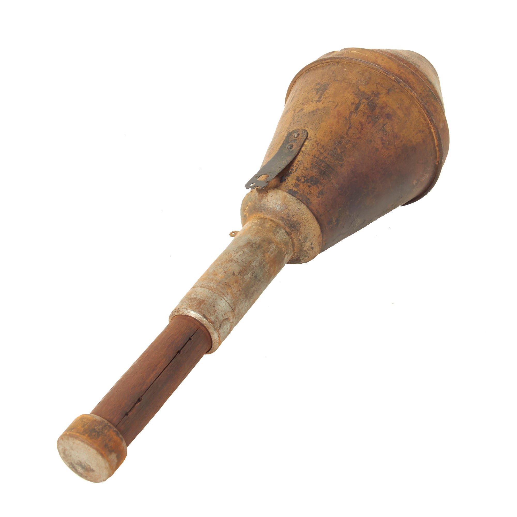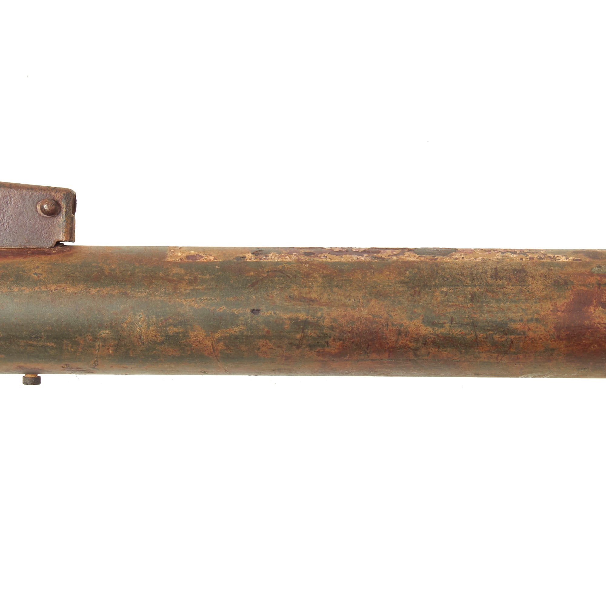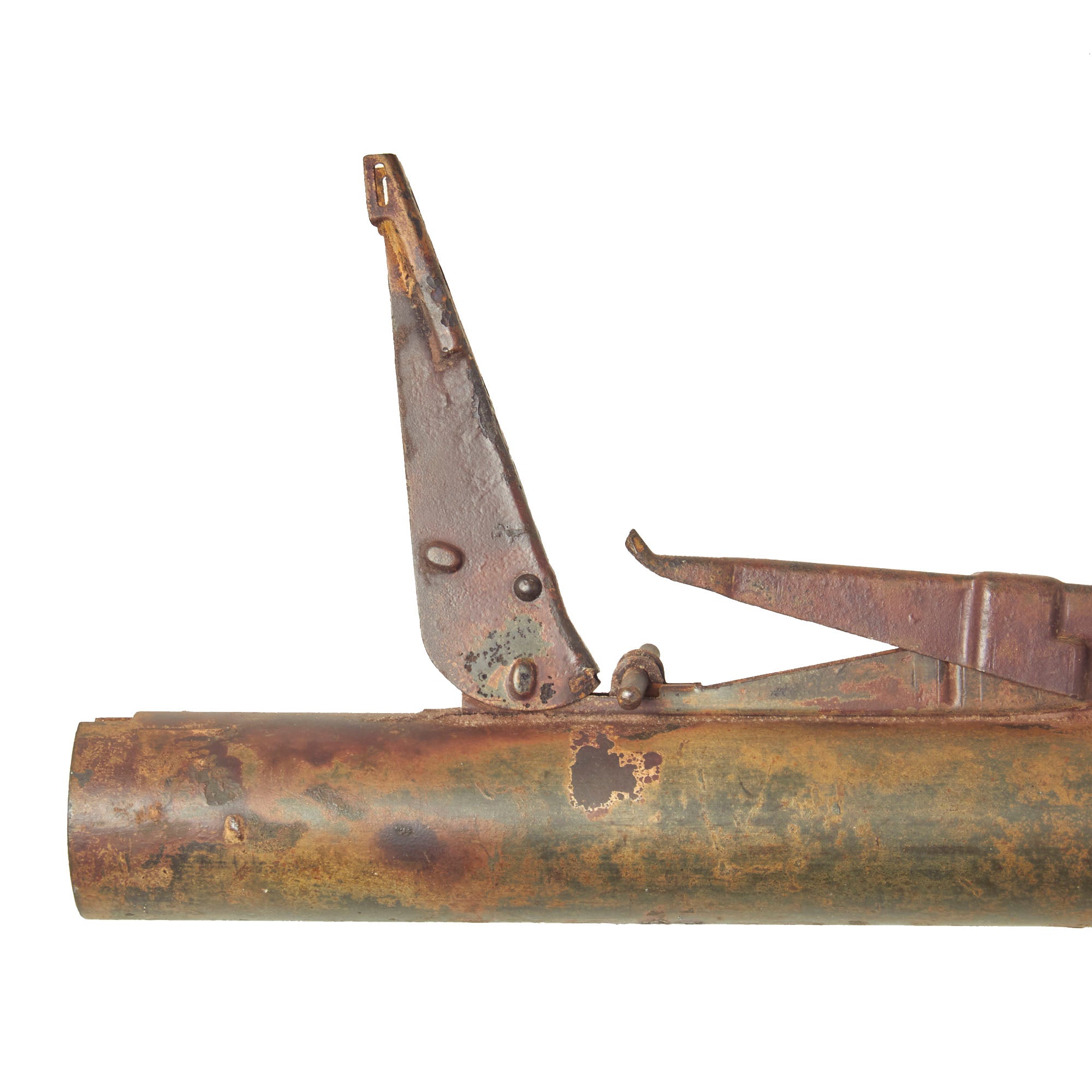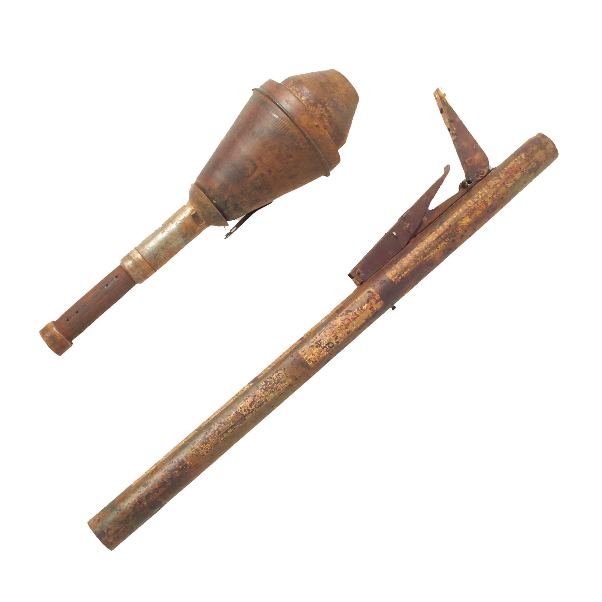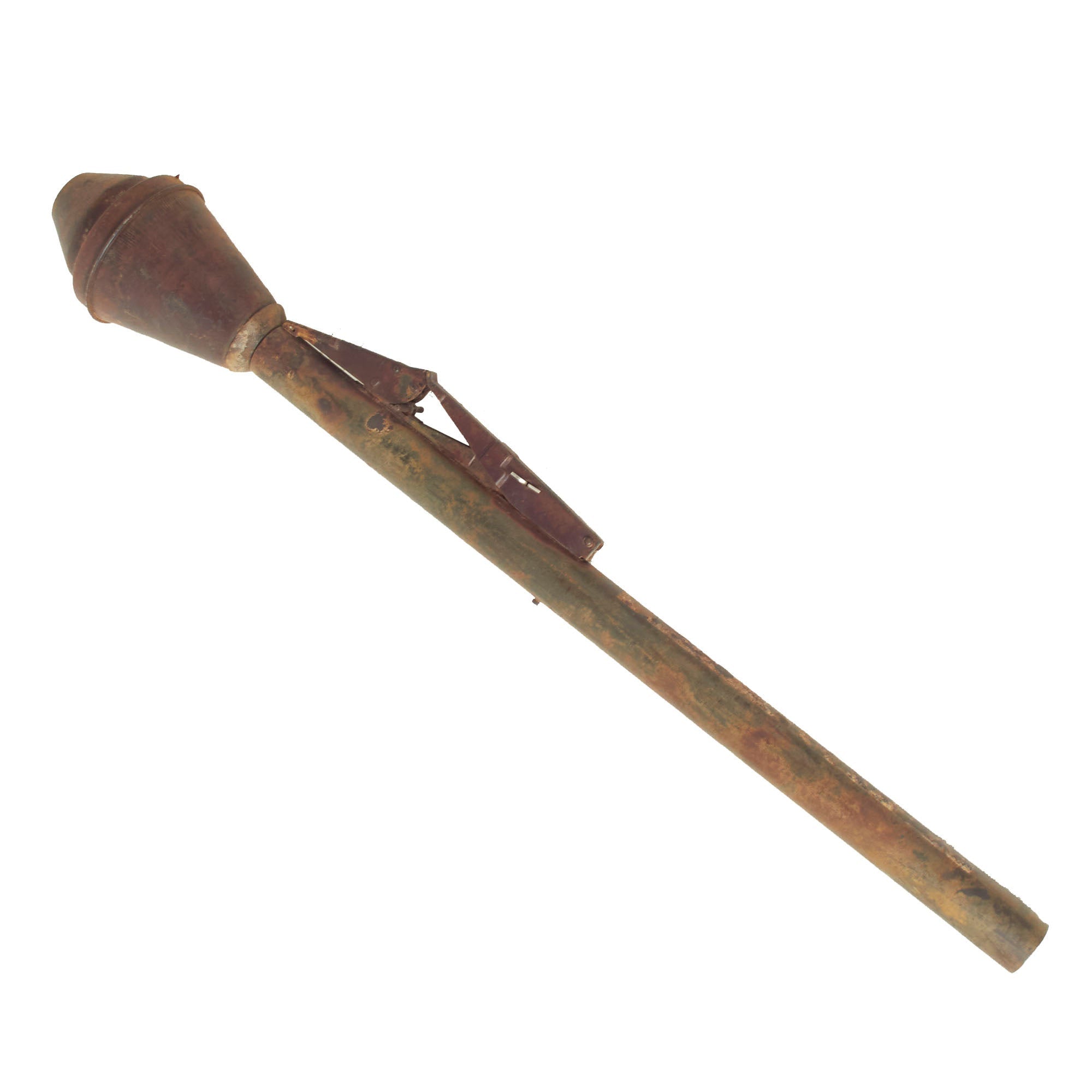 Original Item: Only One Available. The Panzerfaust 100 gross ("large") or Faustpatrone (Translated literally to mean: Tank Fist Large) was the fourth version of the Panzerfaust. This was the final version produced in quantity, and was completed in September 1944. However, it did not reach full production until November 1944. It had a nominal maximum range of 100 m (330 ft). 190 g (6.7 oz) of propellant launched the warhead at 60 m (200 ft) per second from a 6 cm (2.4 in) diameter tube. The sight had holes for 30, 60, 80 and 150 m (260 and 490 ft), and had luminous paint in them to make counting up to the correct one easier in the dark. This version weighed 6 kg (13 lb) and could penetrate 220 mm (8.7 in) of armor. This model was only produced for a few months before the war ended, so they are quite rare in ANY condition, even more so in this nice collectible state.