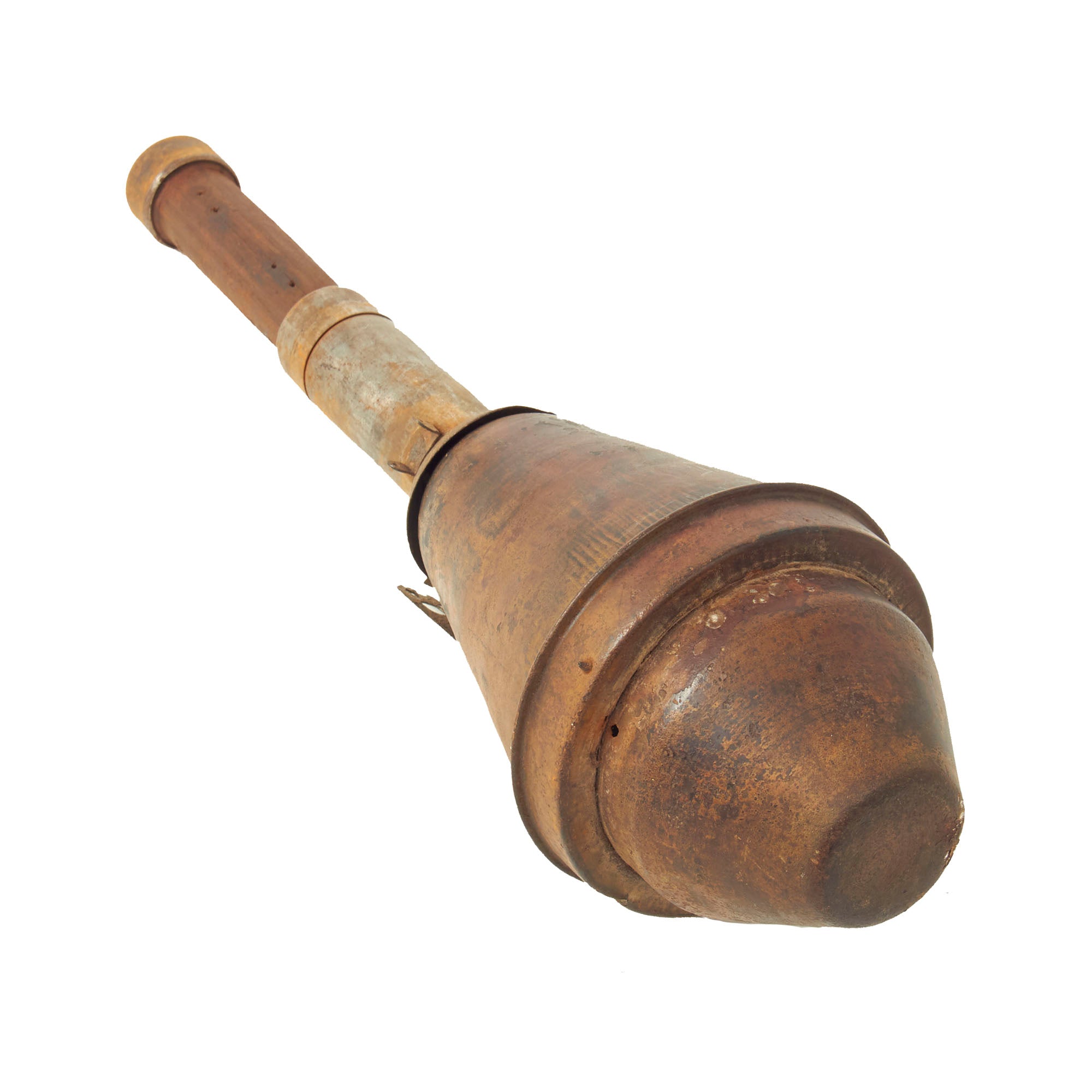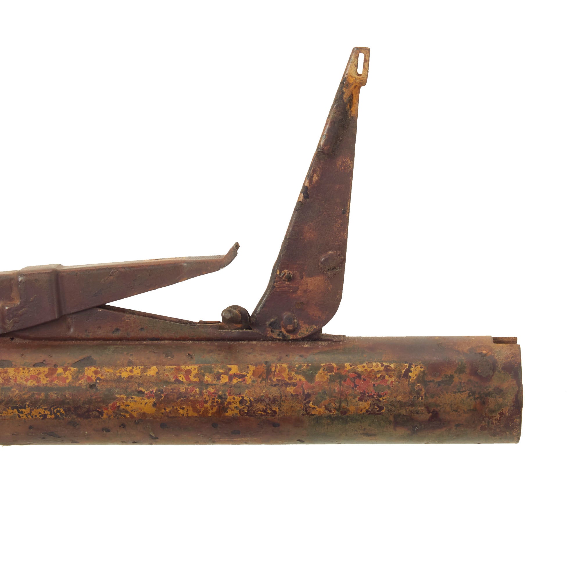 It still retains much of the original dunkelgelb paint with the extremely faint original red stenciling still visible! Original leaf sight and trigger assembly are also still present. The original rocket appears to be complete while inserted, but unfortunately the “fins” that would be present on the wood tail are missing. The warhead also still has remnants of the original label.