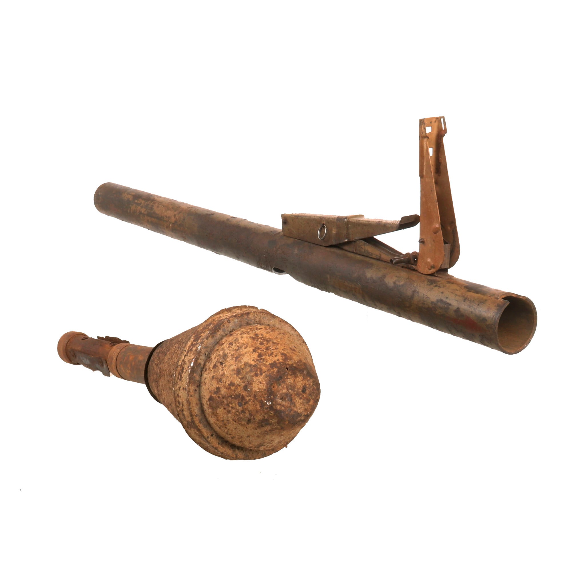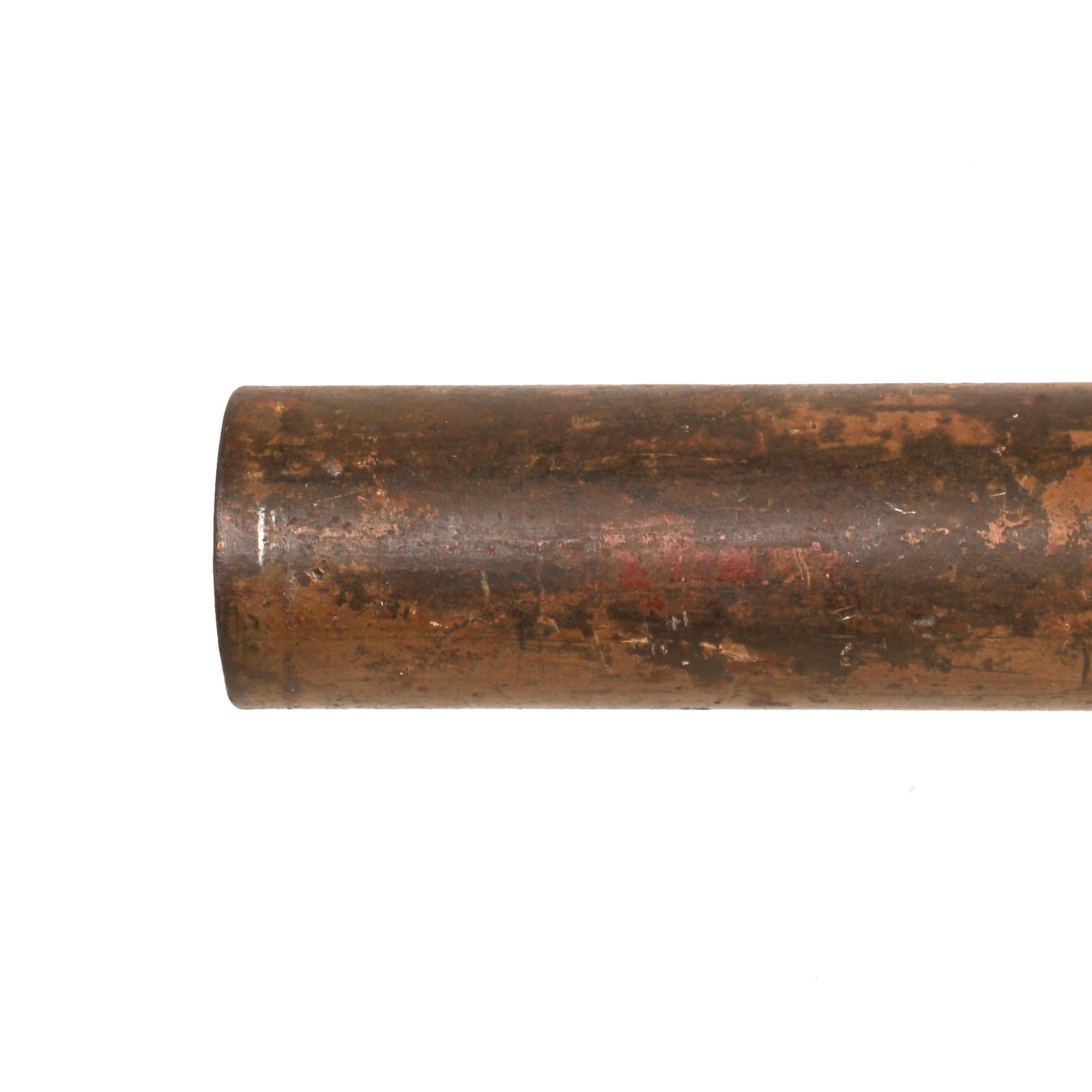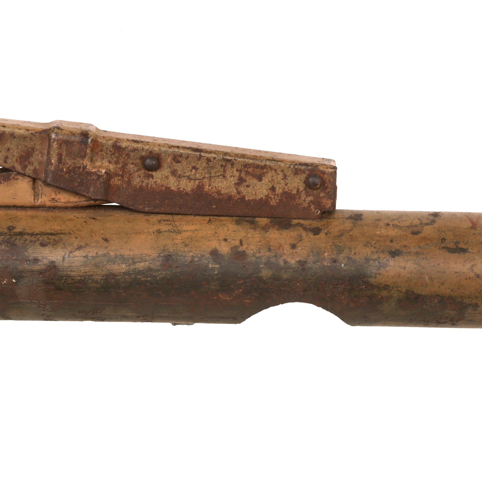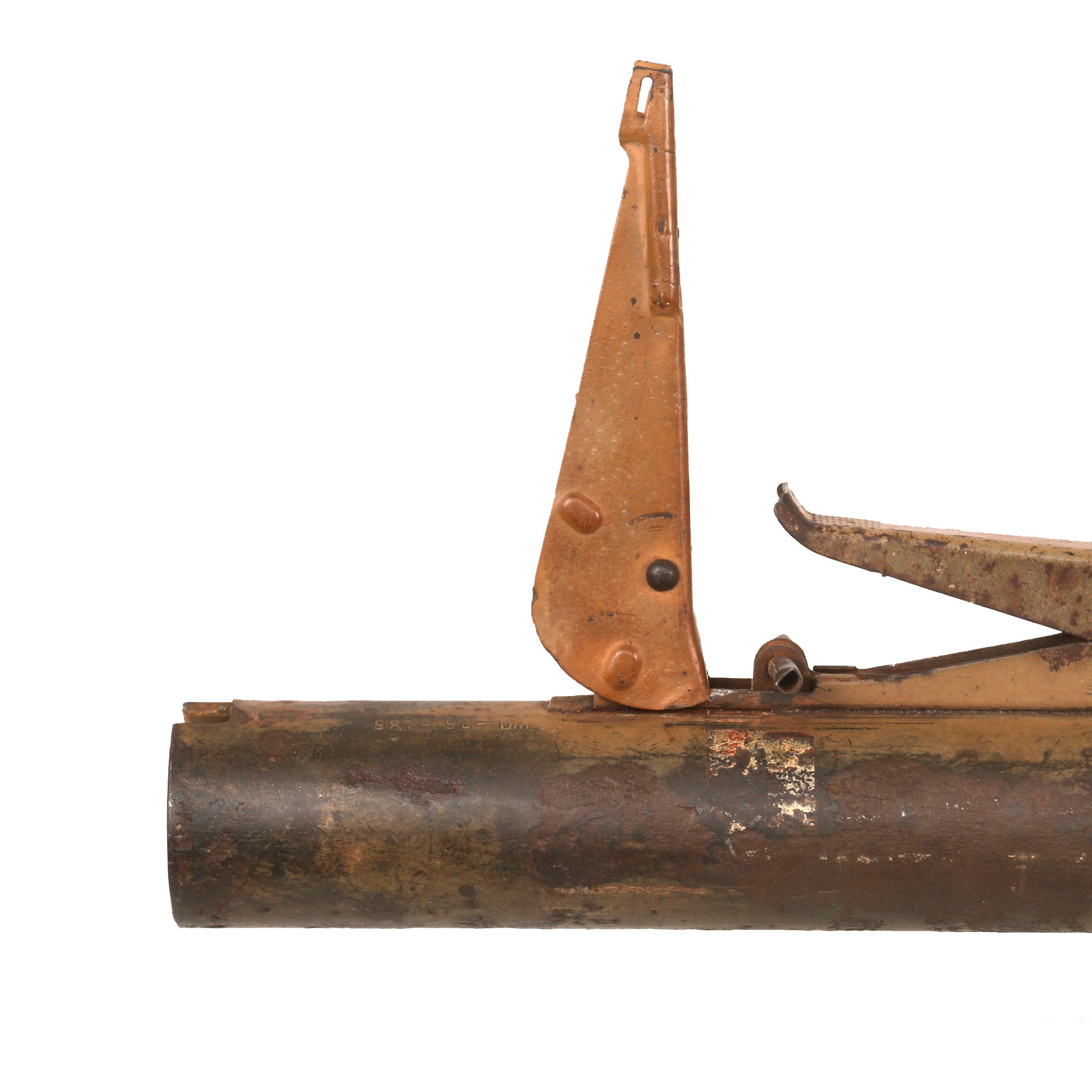 This example has been demilitarized according to specifications by the BATF, with a round bore-width hole drilled into the tube and a steel cross pins welded across the bore to prevent loading. It definitely looks to be a "battlefield pickup", probably found years after the war. This was long enough to cause corrosion and wear to the paint and markings, however not enough to remove them completely, and gives it a great look. It still has the original warhead and the base with the original wooden tail and some of the original fins remaining. The original label on the warhead is no longer present due to oxidation, but some of the original paint is retained. The top portion of the head is partially coming off, but it is still intact.