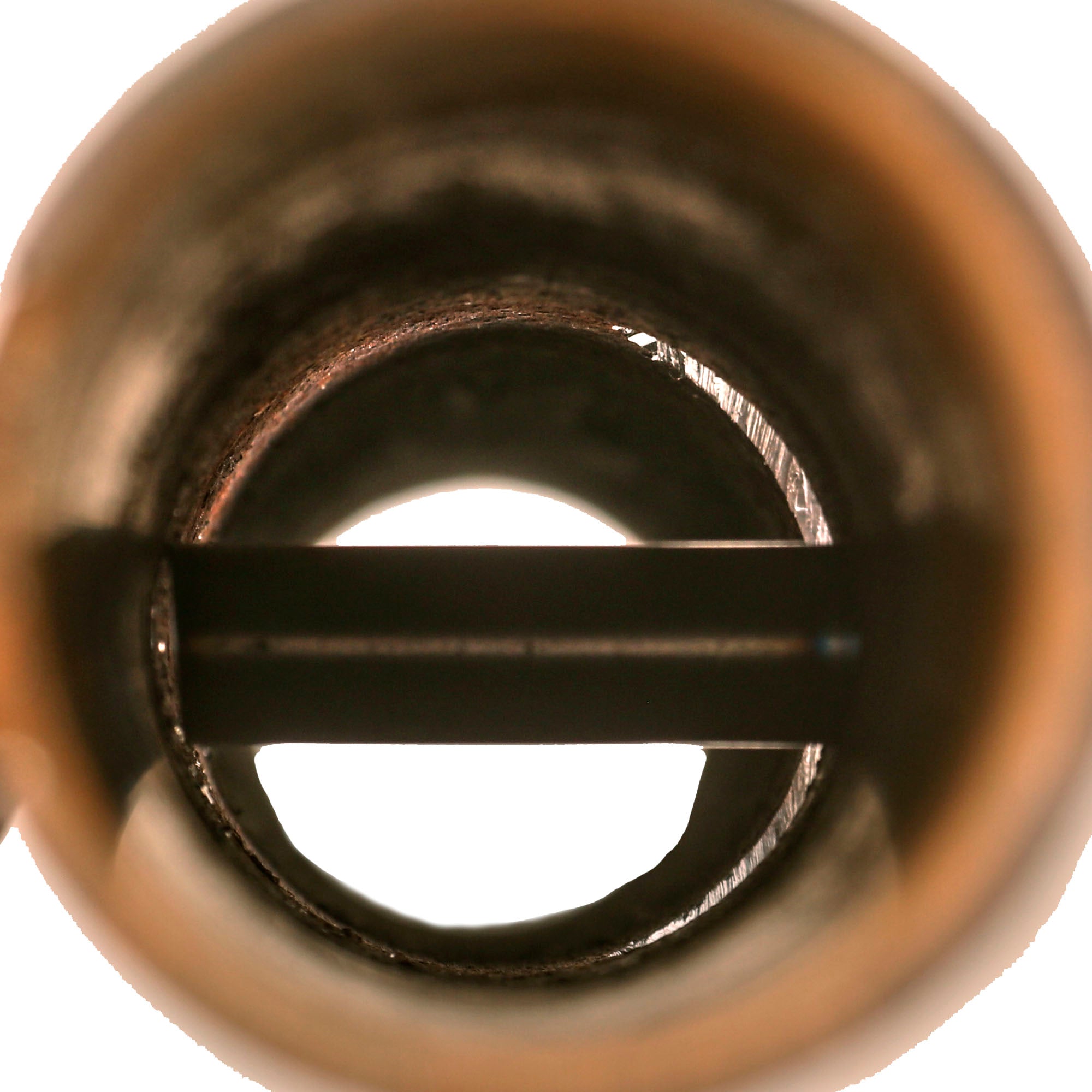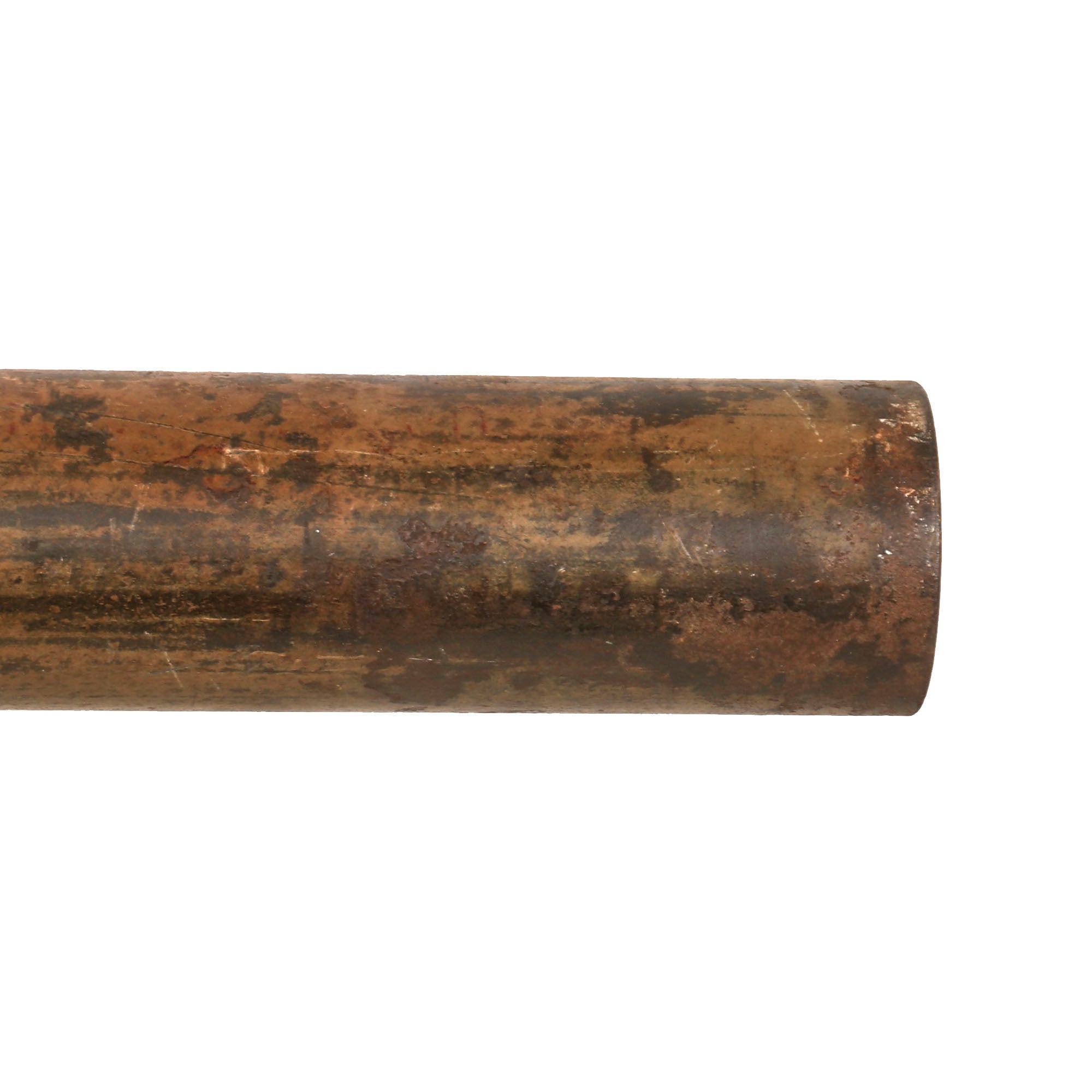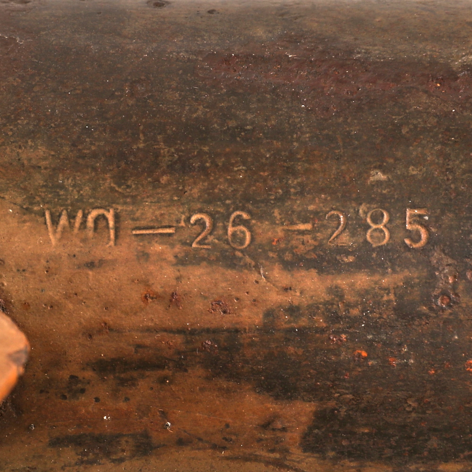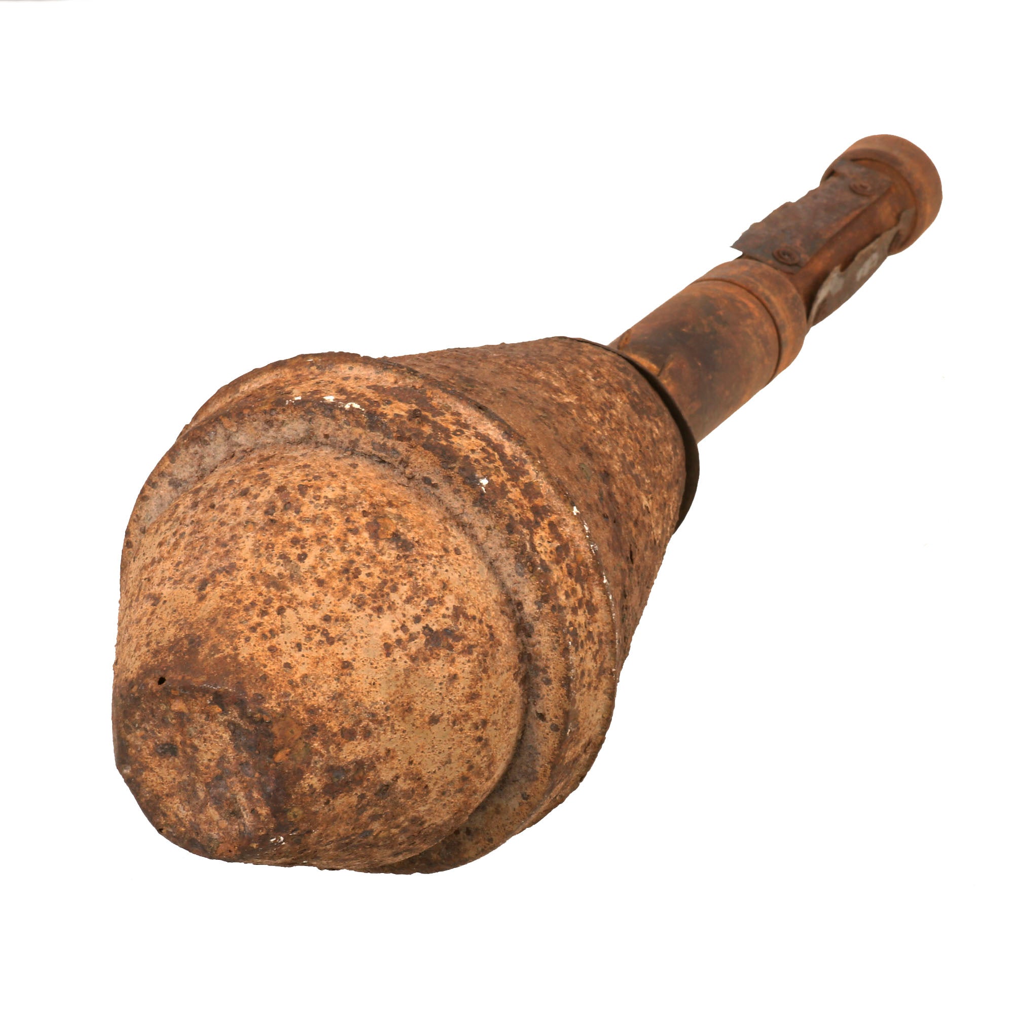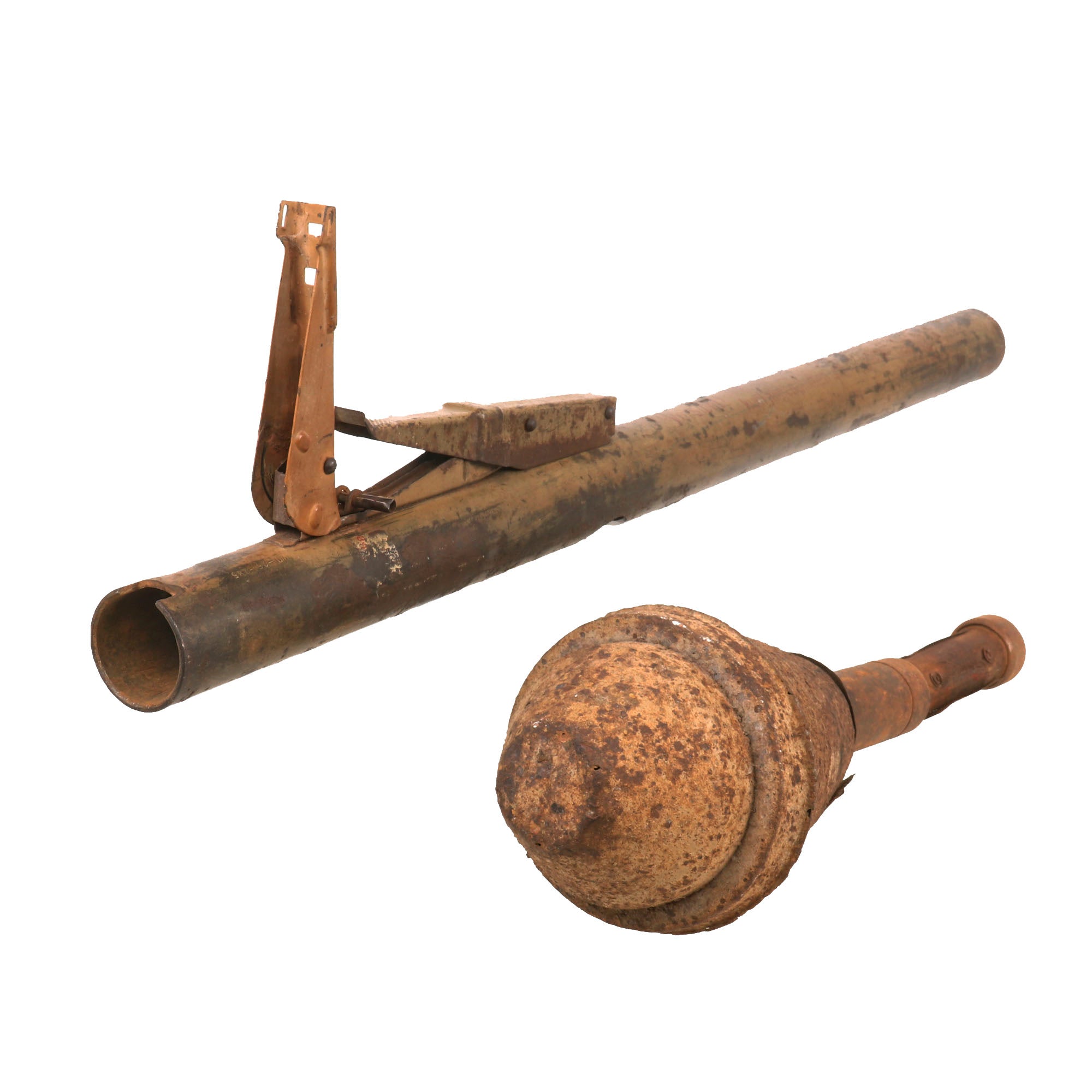 This example has been demilitarized according to specifications by the BATF, with a round bore-width hole drilled into the tube and a steel cross pins welded across the bore to prevent loading. It definitely looks to be a "battlefield pickup", probably found years after the war. This was long enough to cause corrosion and wear to the paint and markings, however not enough to remove them completely, and gives it a great look. It still has the original warhead and the base with the original wooden tail and some of the original fins remaining. The original label on the warhead is no longer present due to oxidation, but some of the original paint is retained. The top portion of the head is partially coming off, but it is still intact.