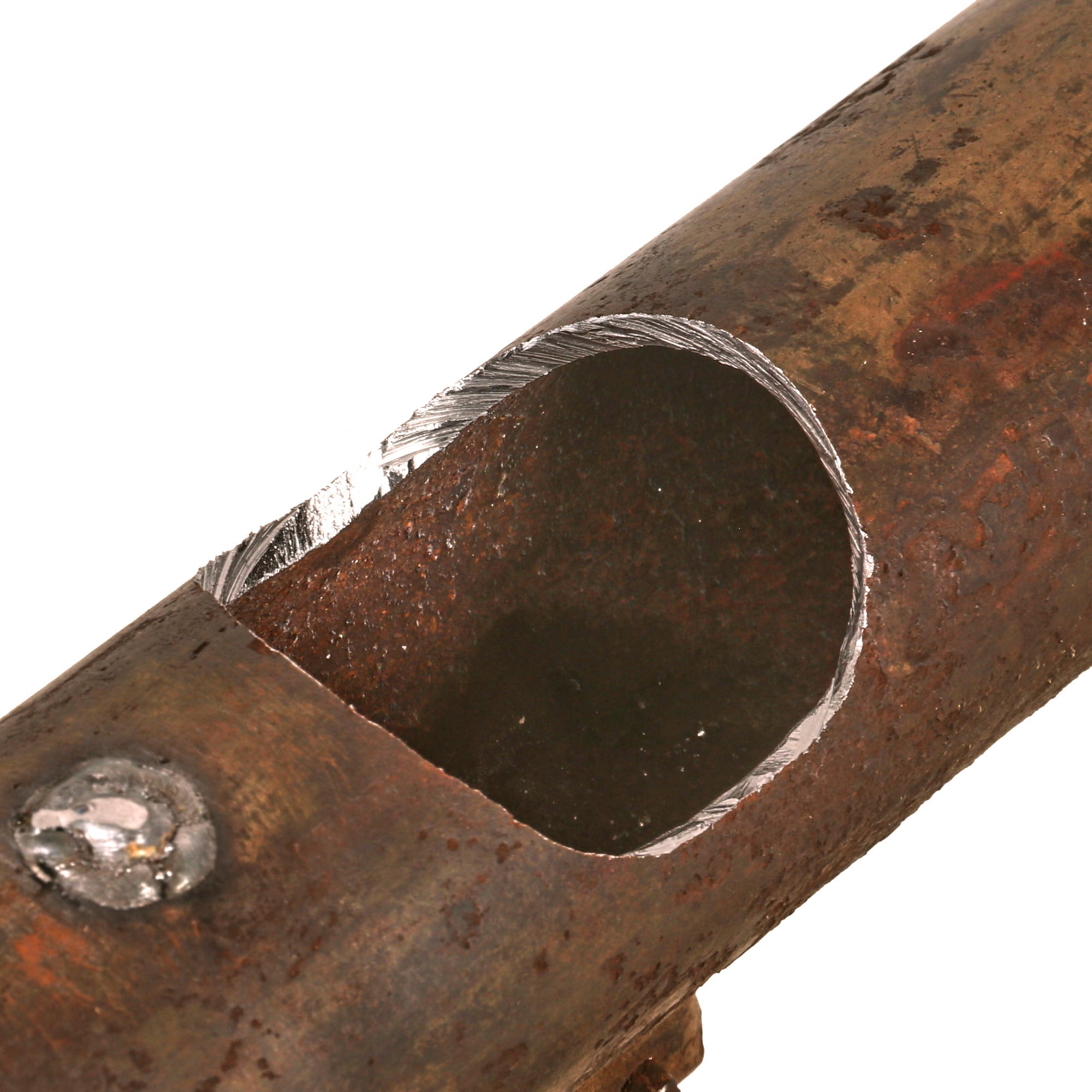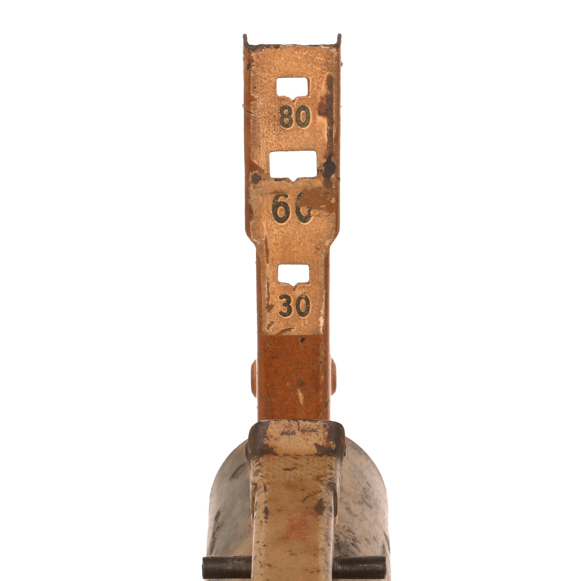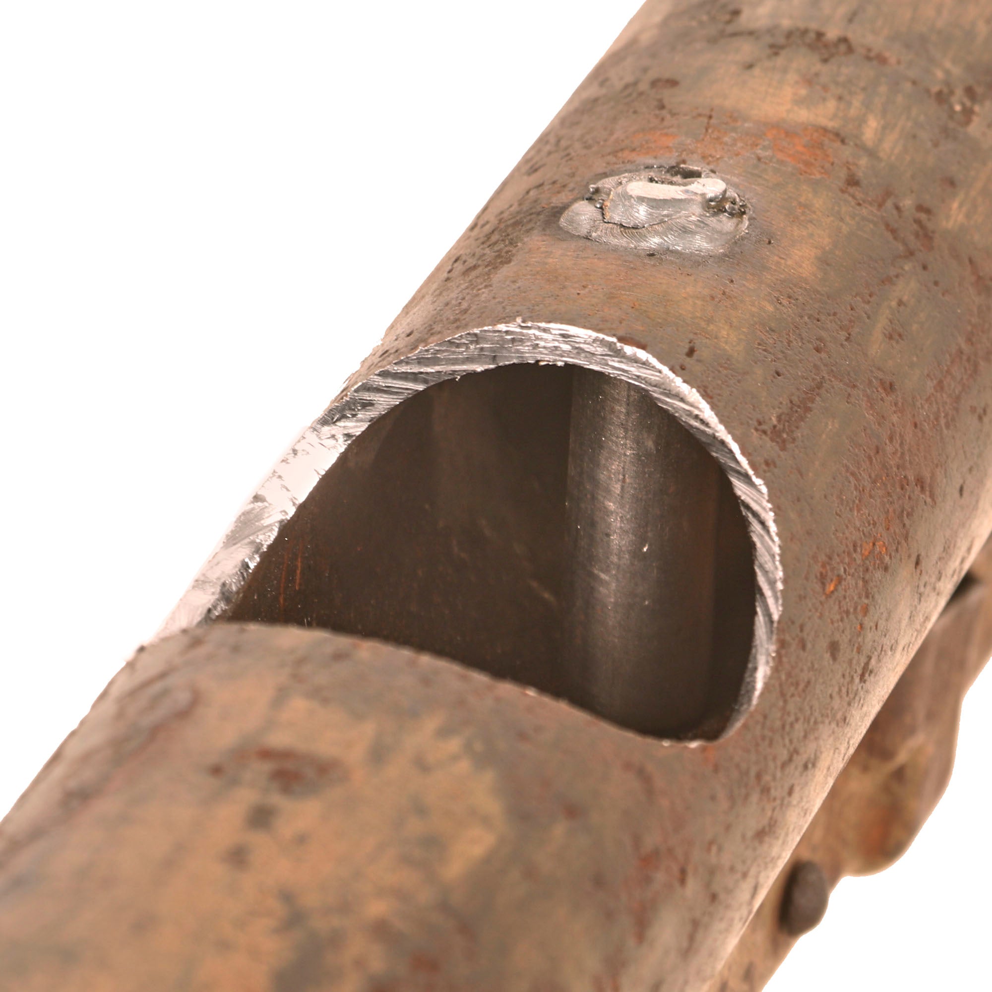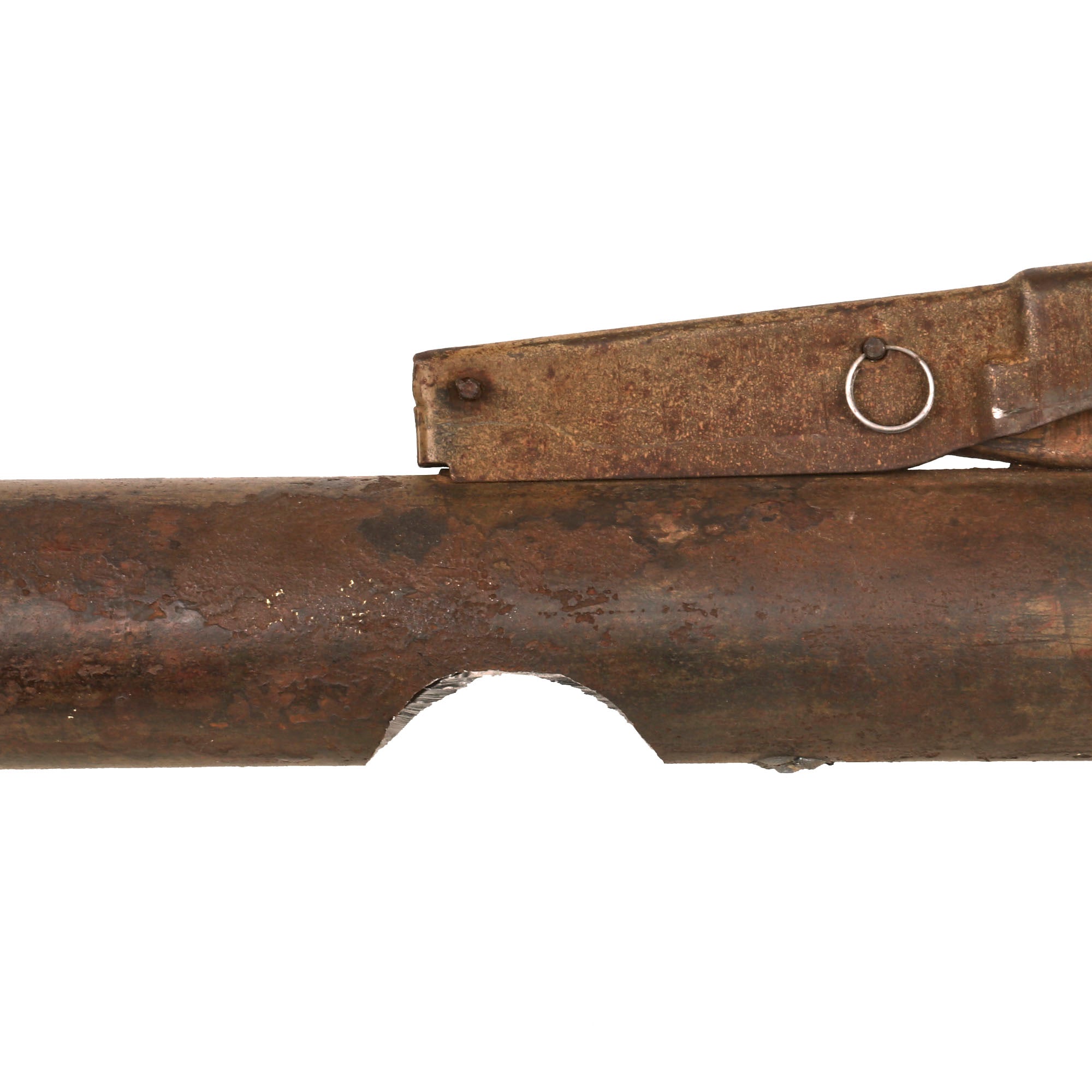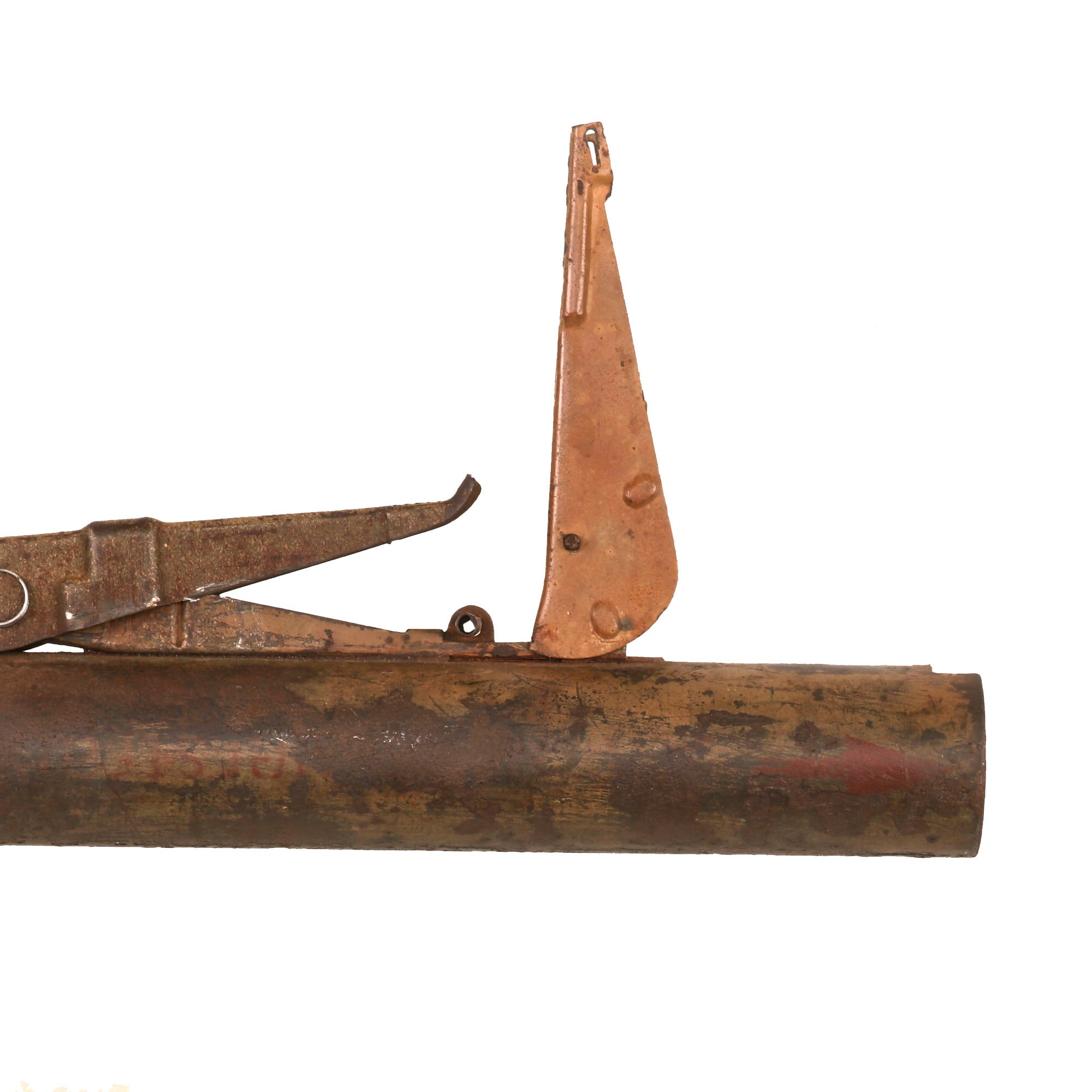 The original sight still flips up, and the trigger moves as well, though both did suffer some damage from oxidation. The trigger only pushes down a bit, as the internal components are rusted in place. Also please note the hole where the "charge retention screw" would have been at the center of the launcher, which is opposite the trigger. If this was a Panzerfaust 100 m, the charge retention screw would be roughly 7 inches below the trigger. Only with the 60 m with the smaller charge was this screw at the same level as the trigger. It is not present due to the hole being drilled in the shaft, but it would have been there before.