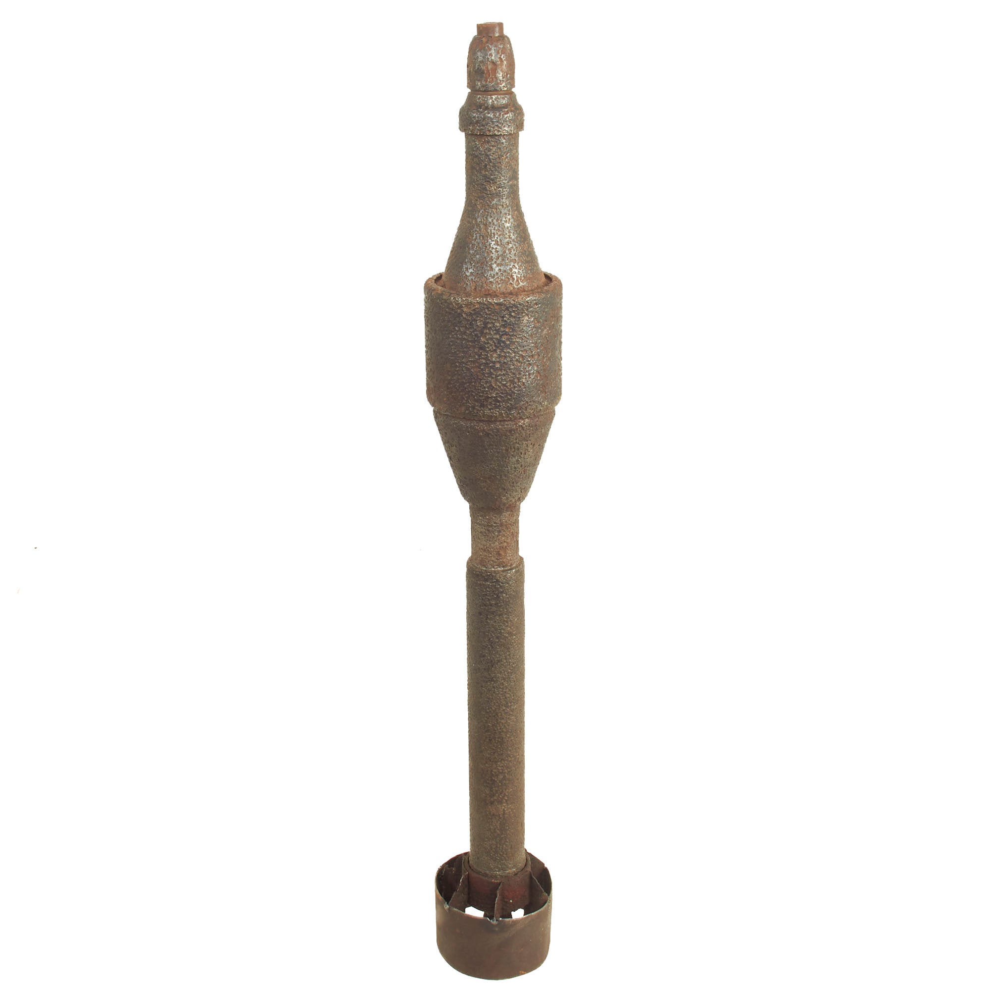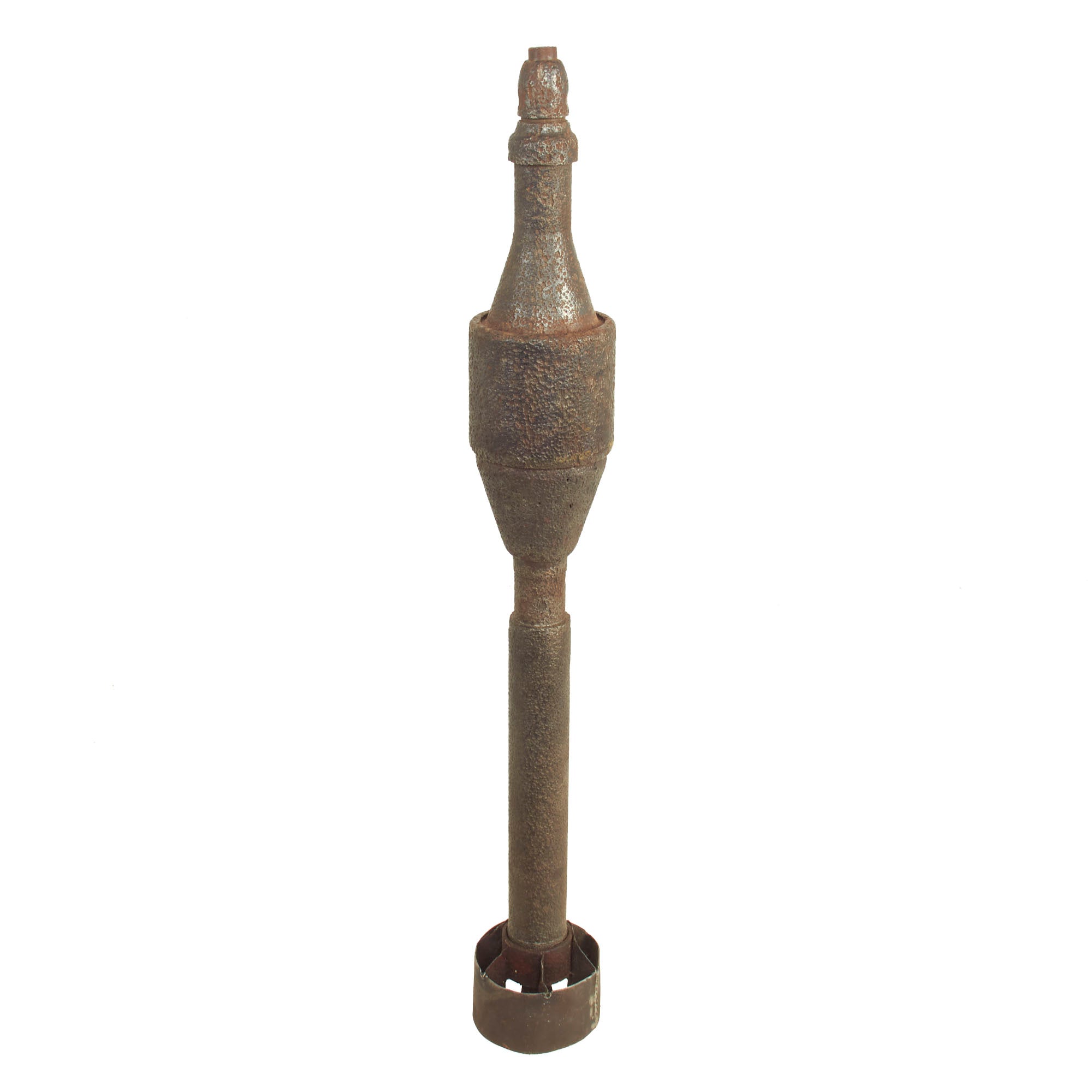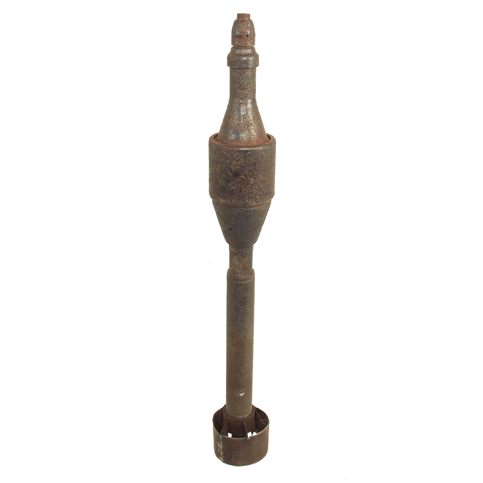Original Item: Only One Available. This is a genuine inert Panzerschreck RPzB.54 rocket offered in very good relic condition. The exterior shows pitting but all the rocket body details are complete and solid such as the tail fin and head, it even has the original bakelite fuse cap top. The rocket measures 26 inches overall. Due to the condition the rocket does not unscrew. Panzerschreck rockets are much harder to find than the launchers and this original; wartime example is sure to fill a hole in many collections.