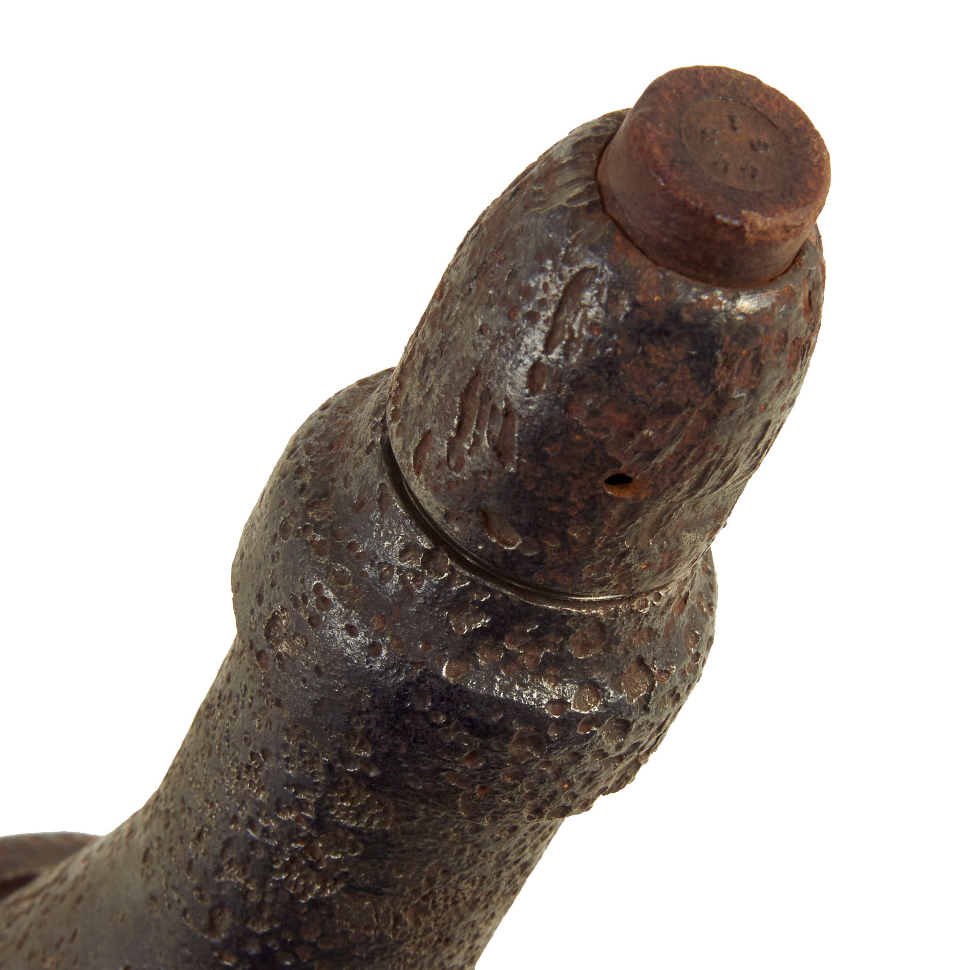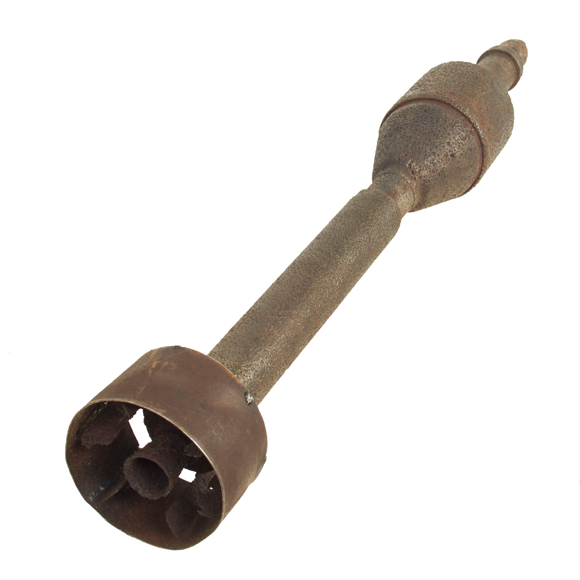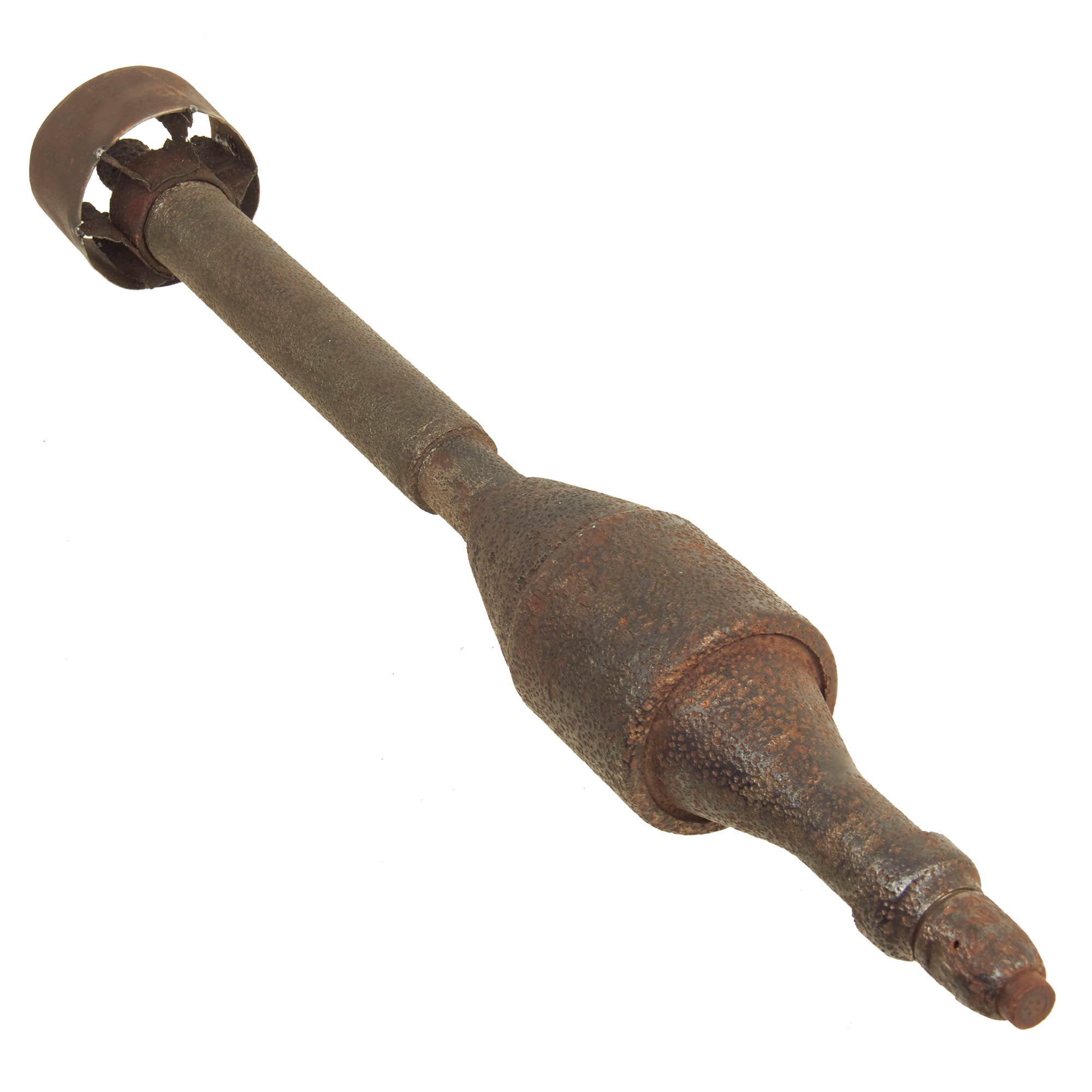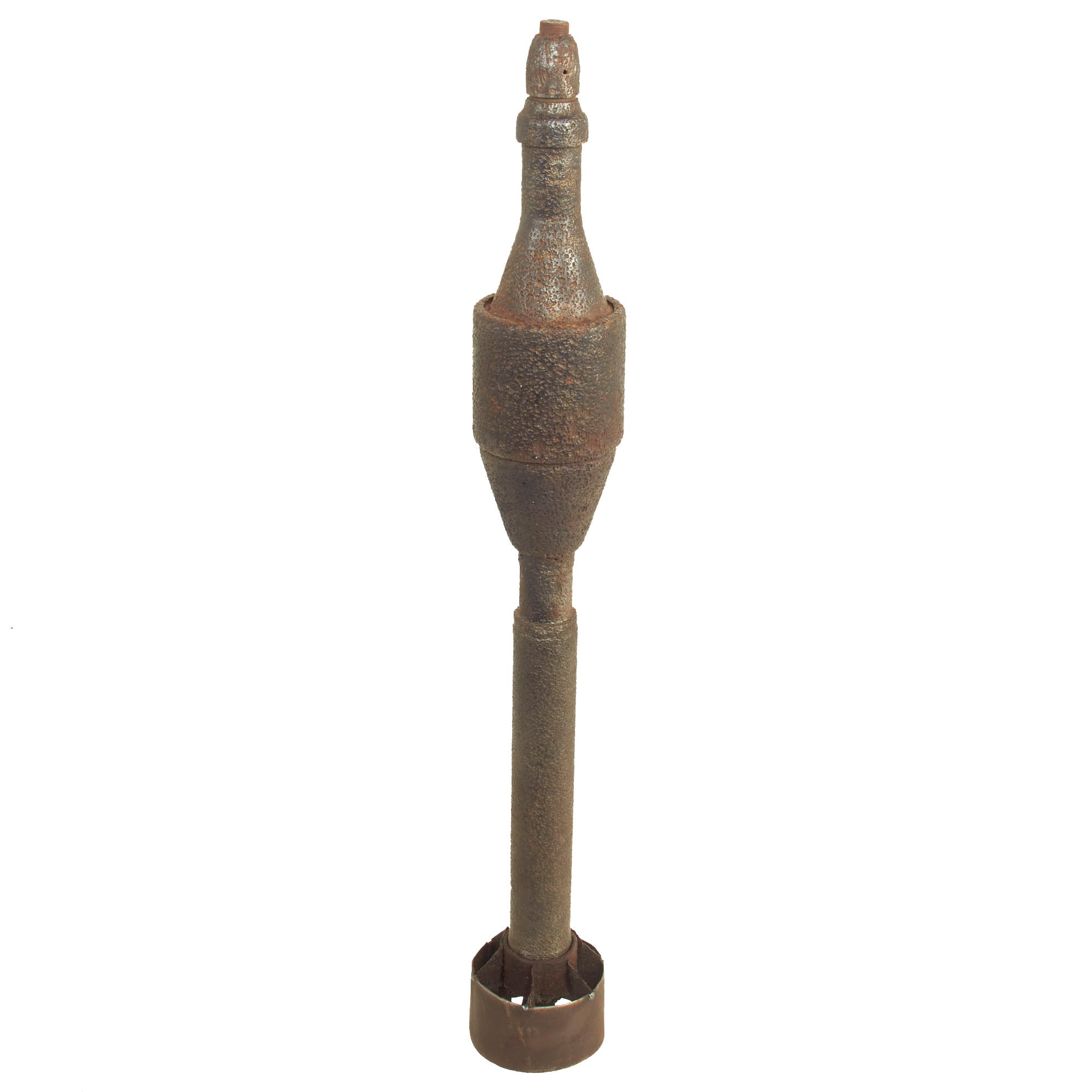 Original Item: Only One Available. This is a genuine inert Panzerschreck RPzB.54 rocket offered in very good relic condition. The exterior shows pitting but all the rocket body details are complete and solid such as the tail fin and head, it even has the original bakelite fuse cap top. The rocket measures 26 inches overall. Due to the condition the rocket does not unscrew. Panzerschreck rockets are much harder to find than the launchers and this original; wartime example is sure to fill a hole in many collections.