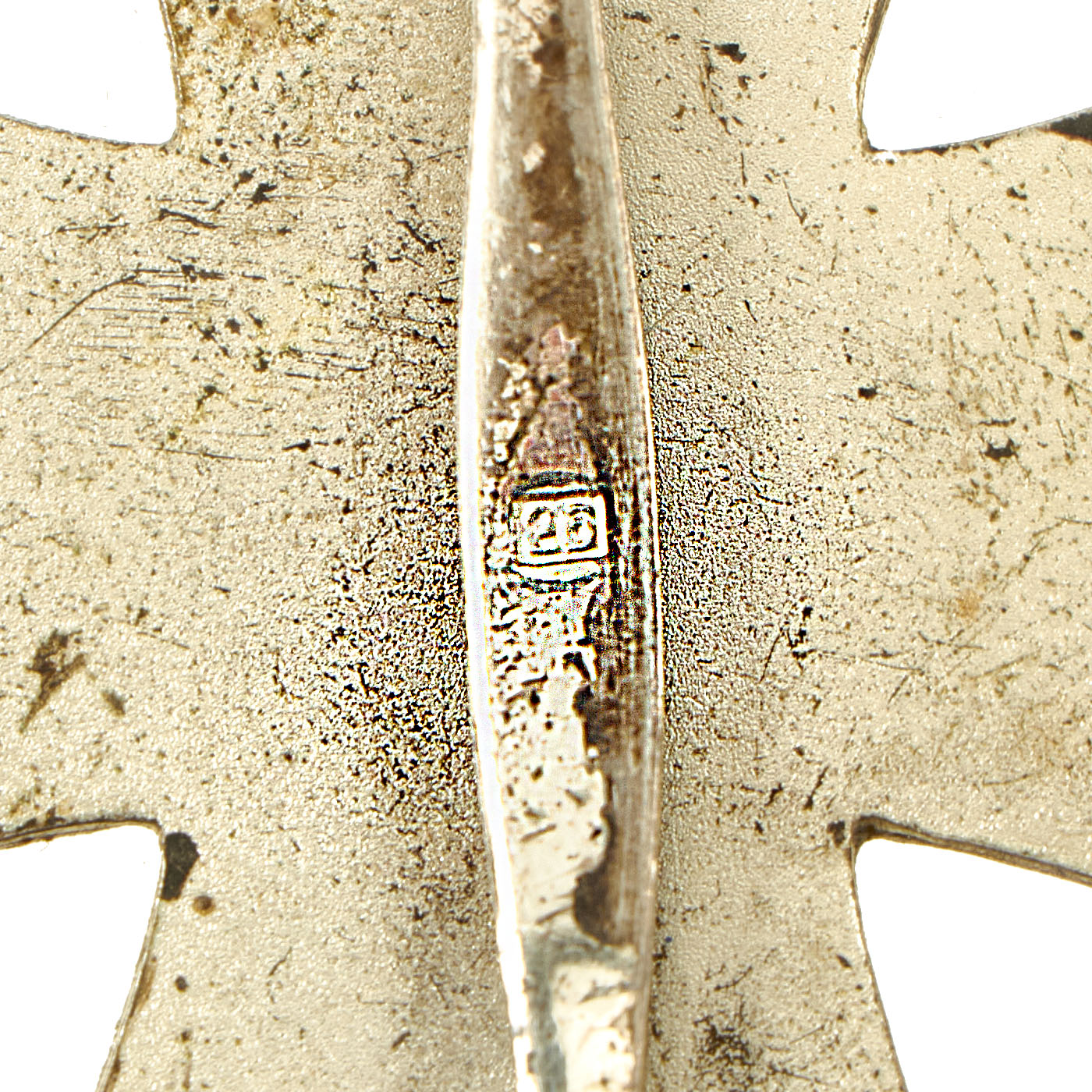 The basic design of the WWII crosses is a central cross pattée struck from iron and mounted in a silver frame which has a raised crenulated decorative border. The obverse of the cross bears the date 1939 under a "mobile" swas. Second class crosses would have a ring at the top where a ring was attached, and had more markings on the back. The first class award, however, was meant to attach directly to the front of the uniform.