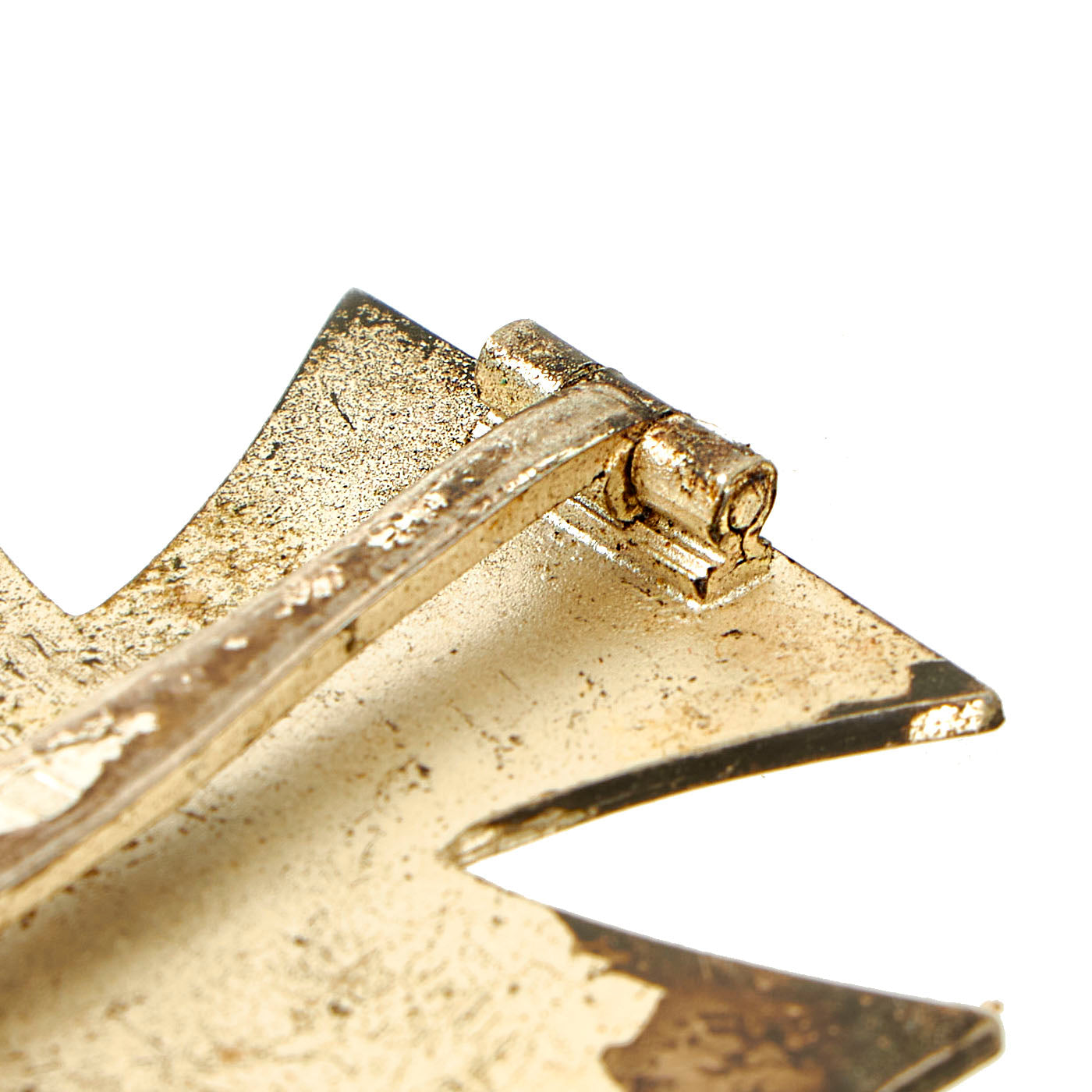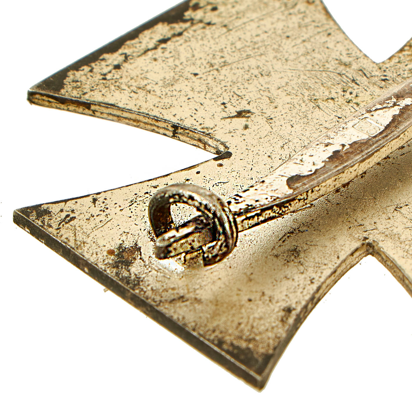 The medal is in good overall condition, and the silver plate is retained well, showing minor tarnishing or patination. It does appear to have either been refinished at some point or suffered moisture damage, regardless it still looks very nice. The black paint on the central cross does show some flaking and oxidation, but overall it still presents very well. The paint on the central swas and date is still intact. The pin and hook catch are in good functional condition