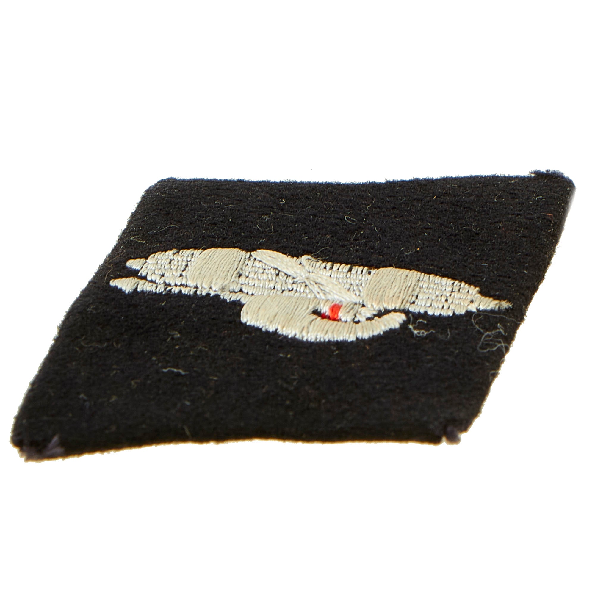 Known as Kragenpatte in German, the collar tab measures approximately 2 1/2" x 1 1/2", and in the SS the Right side would indicate the particular unit of the wearer. The German runic symbols were reserved for ethnic German / Aryan units, so the foreign volunteer units would have insignia related to their home country. This example shows the Fasces emblem with an axe next to it, the insignia of the Italian Fascist party. It is made of black fabric with silver thread and an internal lacquered buckram fabric stiffener. Ther eis the correct small red stitch on the blade top of the axe.