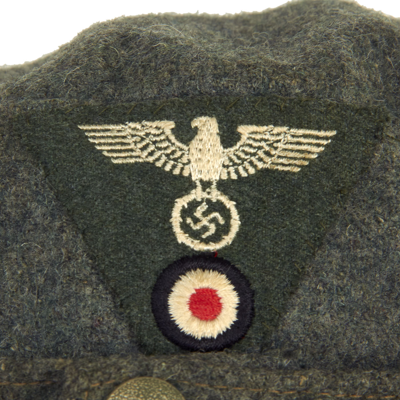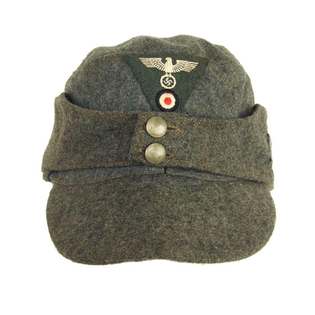 The cap is constructed of Heer Feldgrau (Field Gray) wool, and has the correct "fold down" skirt for colder weather. It features a two magnetic pebbled buttons button to the front, securing the skirt, though there are no loops on the underside, as there would be on a German M43 mountain cap. The fabric is relatively thick for use by a mountain trooper.