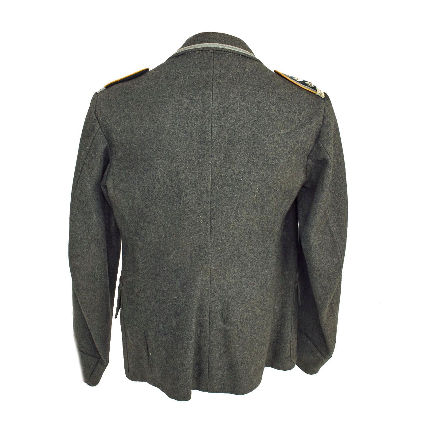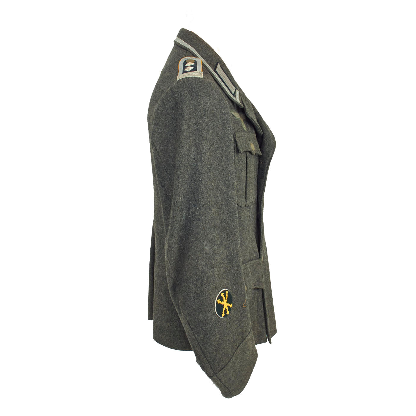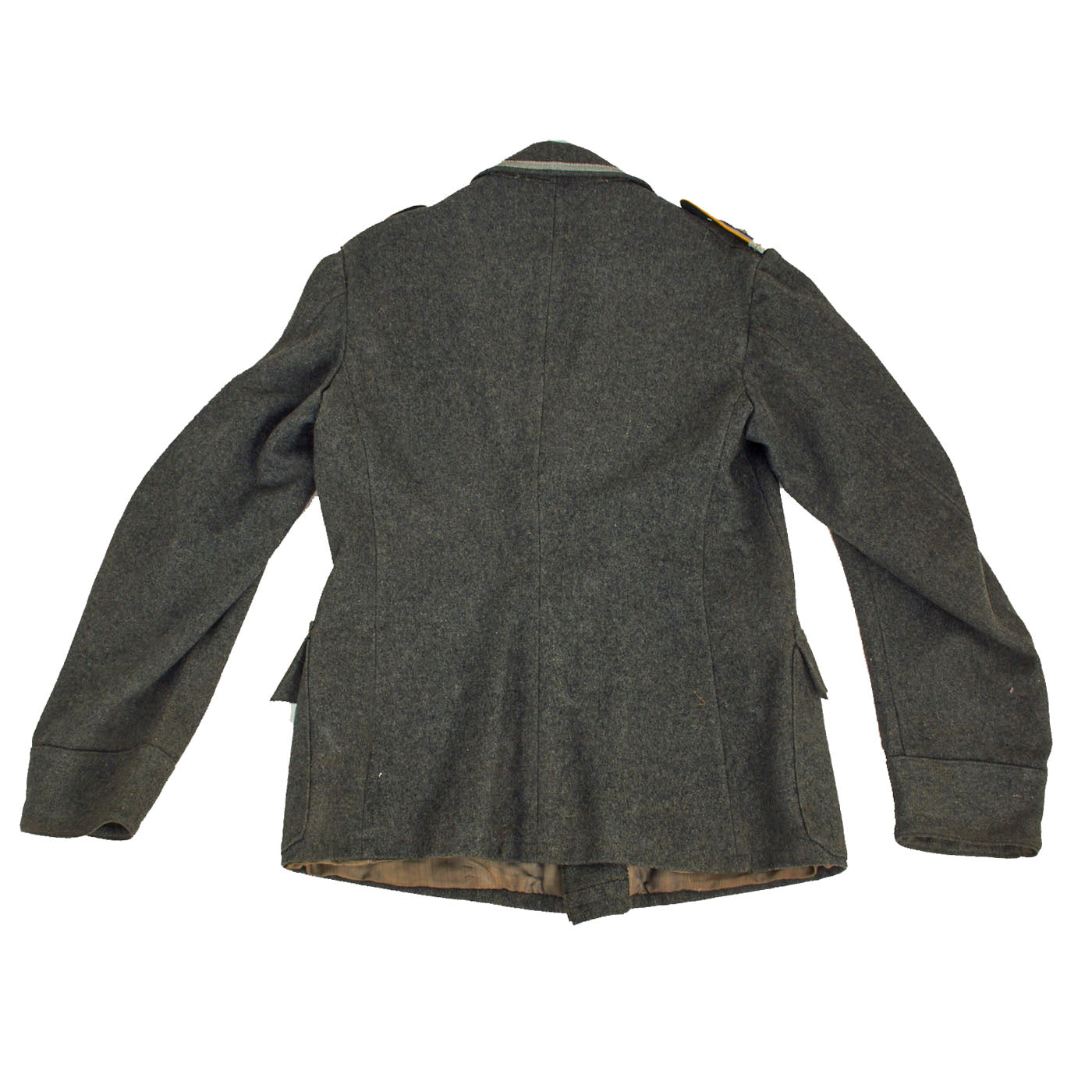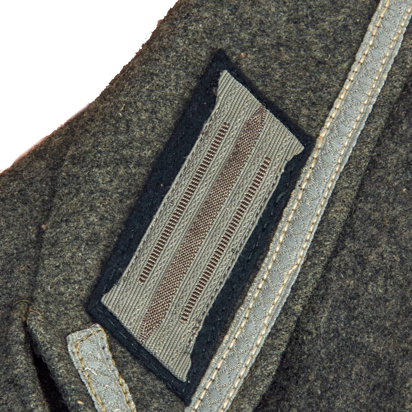 The collar does not have any wrapping as would be seen on a German-made tunic, and is decorated a strip of 9mm flat silver-grey woven rayon braid (Unteroffoziers-Tressen), sewn around the collar border. There are EM/NCO litzen collar patches on each side, which are woven from silver-gray thread with a dark green "badge cloth" background. They do not have Corps Color stripes, as in 1938 they were removed from EM/NCO collar insignia to save time. The collar, and its insignia, are without any noticeable damage or mothing.