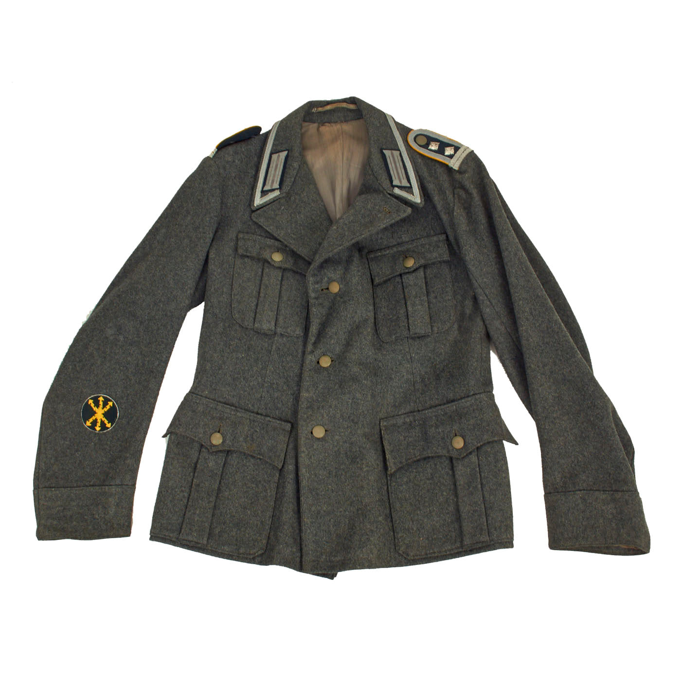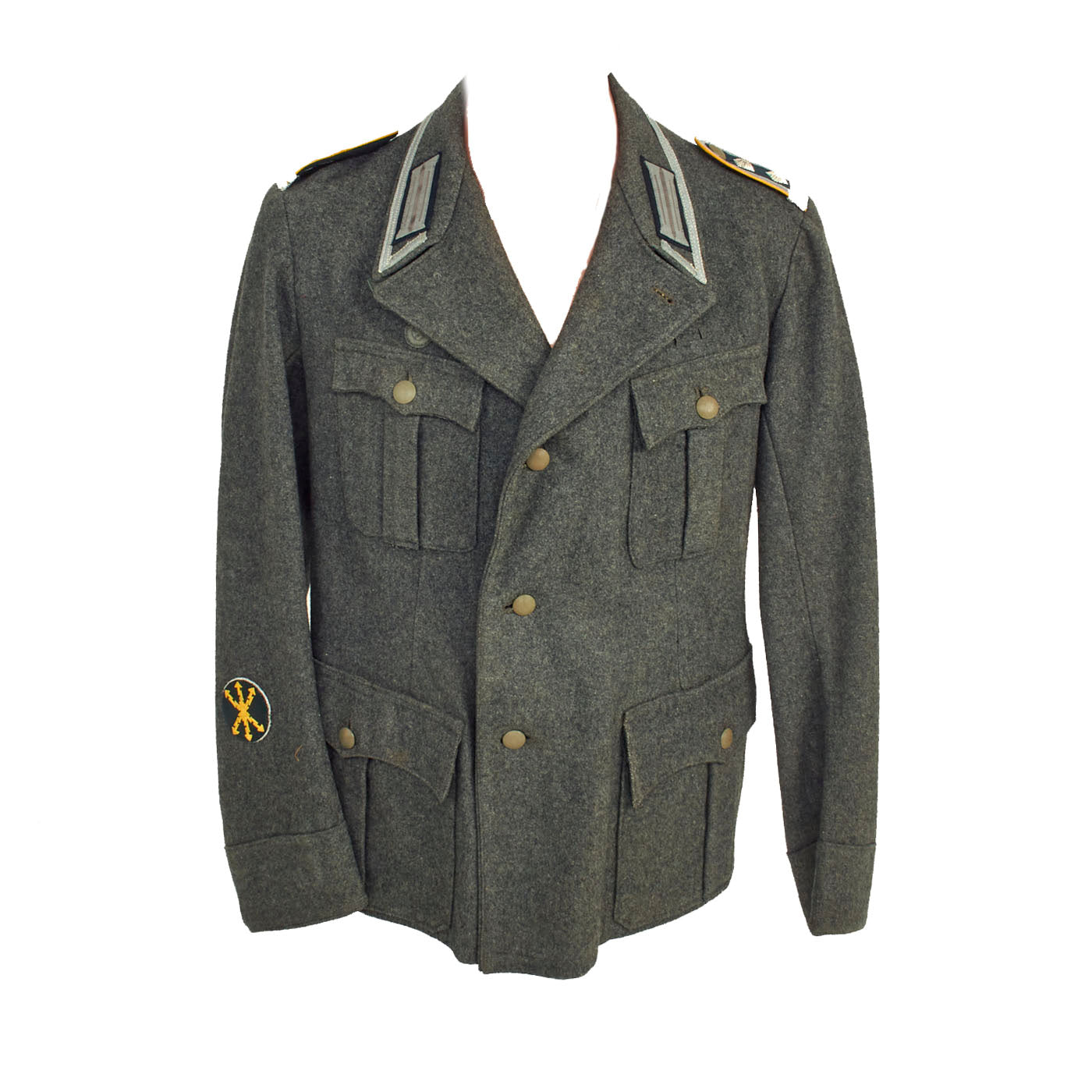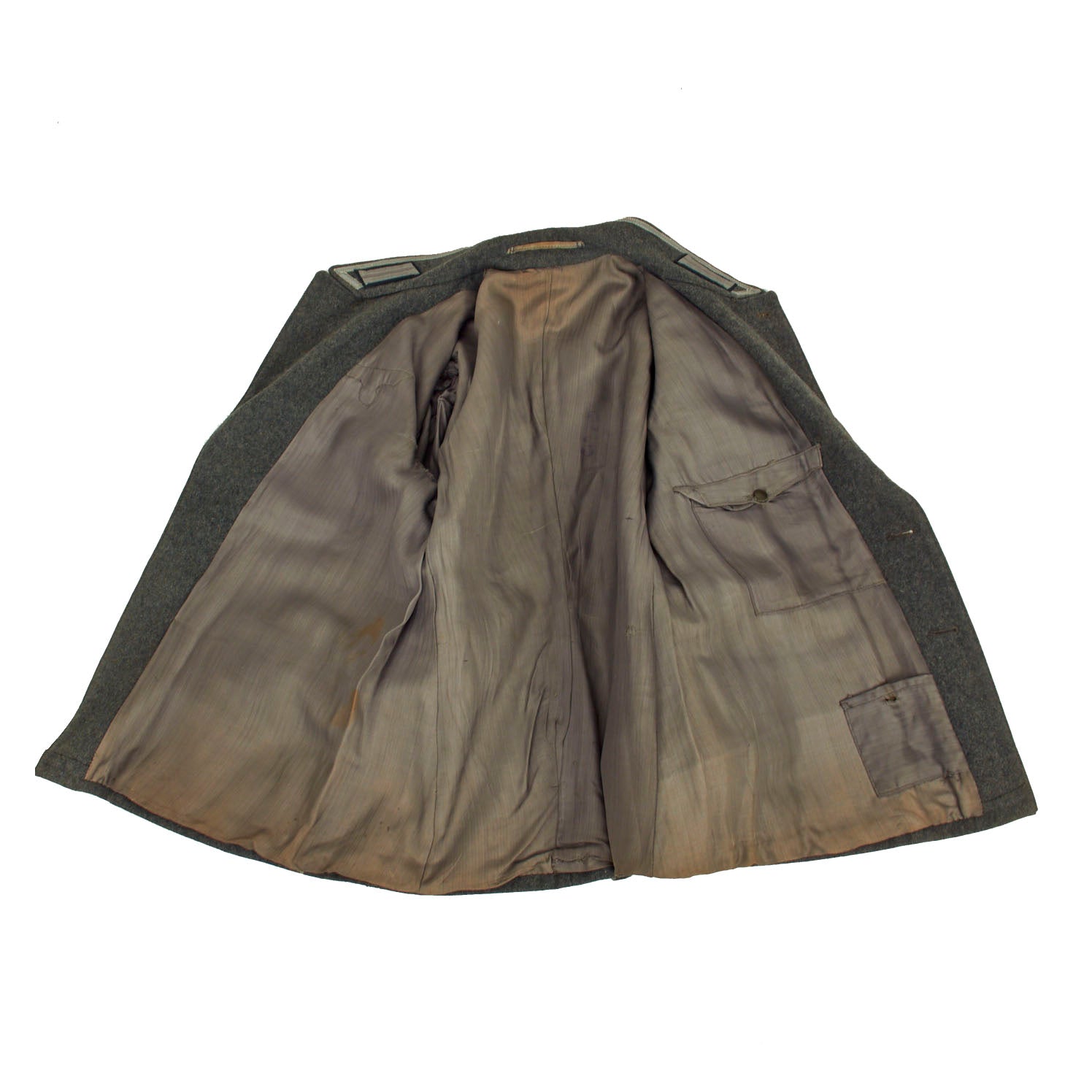 The collar does not have any wrapping as would be seen on a German-made tunic, and is decorated a strip of 9mm flat silver-grey woven rayon braid (Unteroffoziers-Tressen), sewn around the collar border. There are EM/NCO litzen collar patches on each side, which are woven from silver-gray thread with a dark green "badge cloth" background. They do not have Corps Color stripes, as in 1938 they were removed from EM/NCO collar insignia to save time. The collar, and its insignia, are without any noticeable damage or mothing.