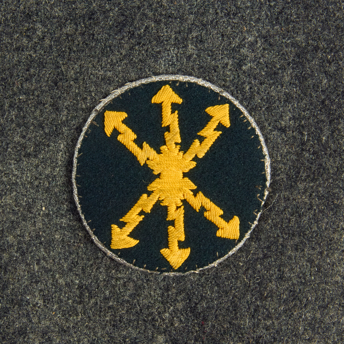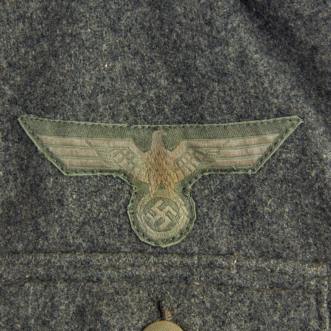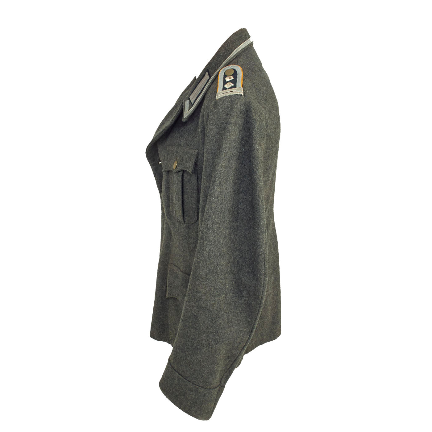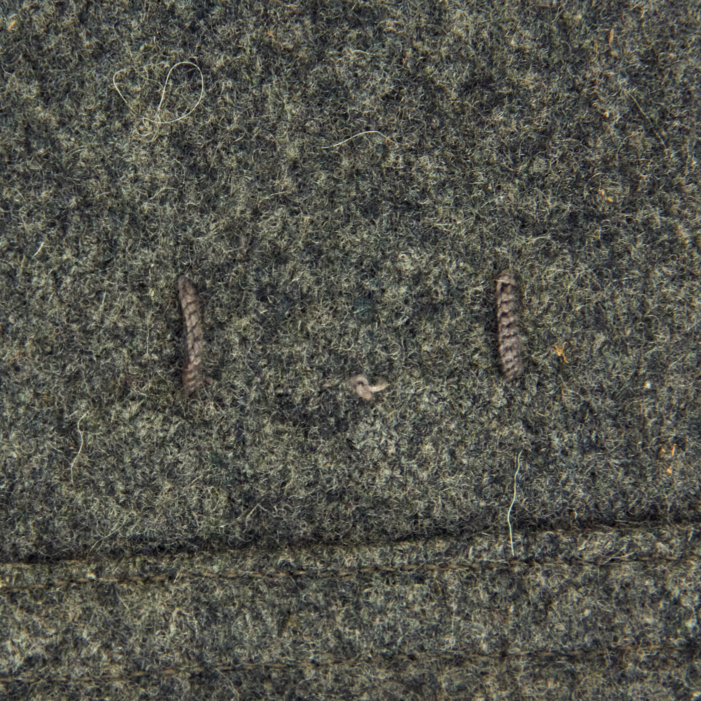 The collar does not have any wrapping as would be seen on a German-made tunic, and is decorated a strip of 9mm flat silver-grey woven rayon braid (Unteroffoziers-Tressen), sewn around the collar border. There are EM/NCO litzen collar patches on each side, which are woven from silver-gray thread with a dark green "badge cloth" background. They do not have Corps Color stripes, as in 1938 they were removed from EM/NCO collar insignia to save time. The collar, and its insignia, are without any noticeable damage or mothing.