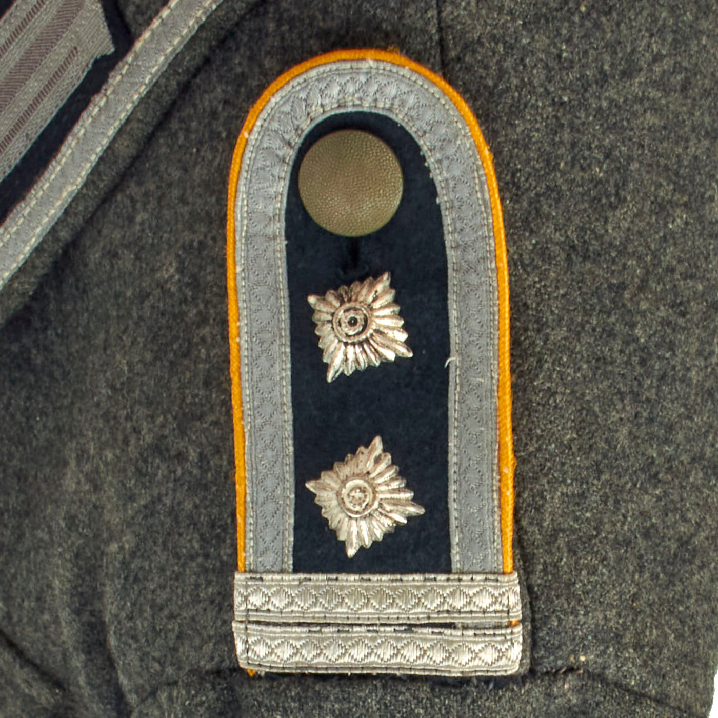 The "sew-in" style shoulder straps (Schulterklappen) attached to the tunic have a dark green base wool, with silver diamond-woven tress border and TWO tress loops, indicating an NCO Officer Candidate. TWO rank pips are present on the shoulder boards, indicating the cavalry rank of Fahnenjunker-Oberwachtmeister, a cavalry Cadet Officer candidate equivalent to a U.S. Army Master Sergeant. The piping around the shoulder straps is Goldgelb (Golden-Yellow), the Waffenfarbe (corps color) for Cavalry, as well as reconnaissance and armored reconnaissance units with cavalry traditions.