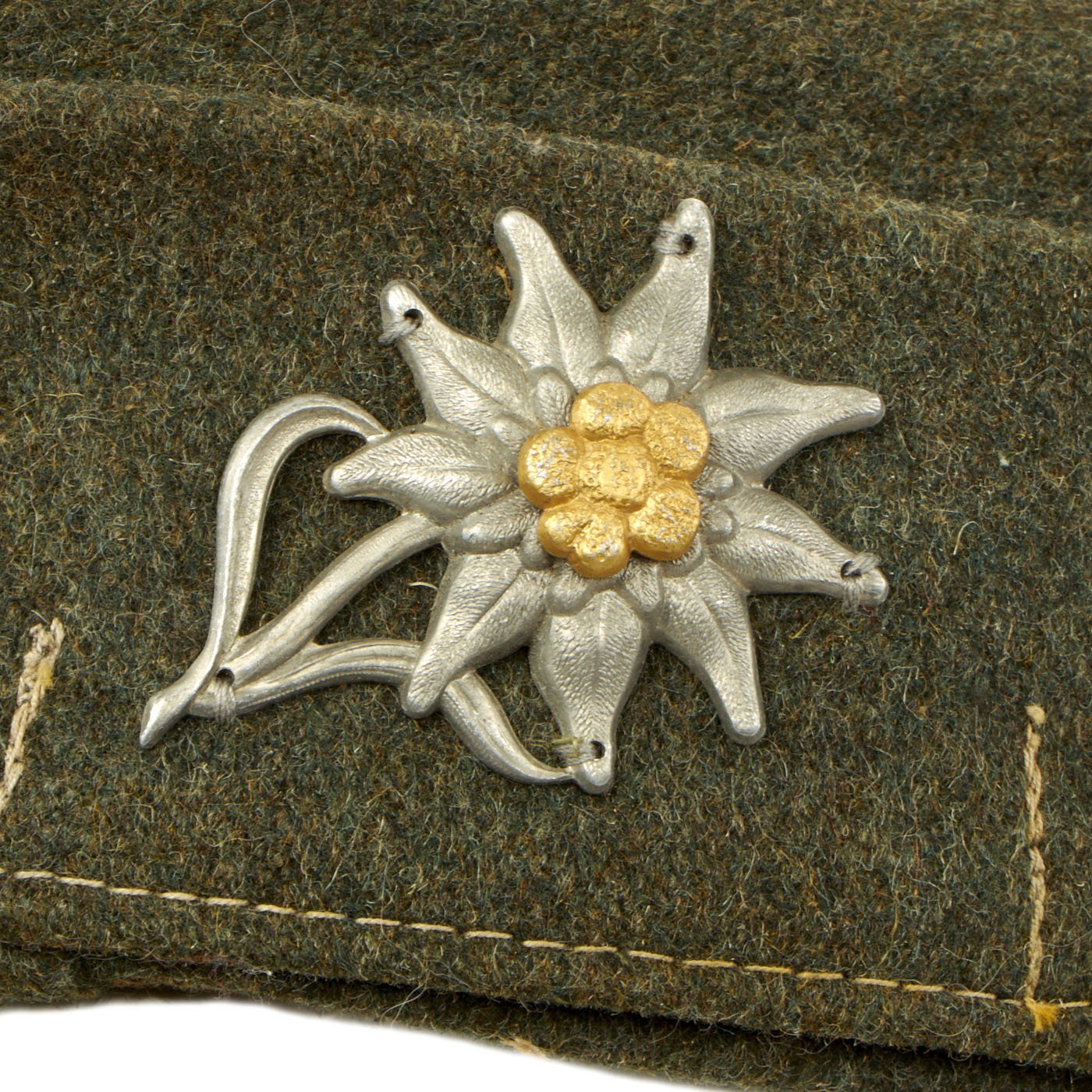 The peak of the cap has a very nice combined Eagle and cockade BEVO insignia on the front. There is a non-magnetic metal Edelweiß badge stitched in place on the left flap. This flower, found in the mountains of Southern Germany and Austria, is the symbol used by Gebirgsjäger mountain troops.