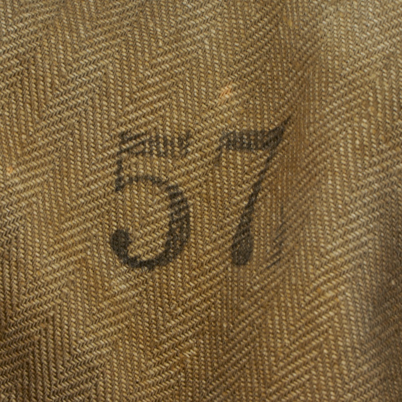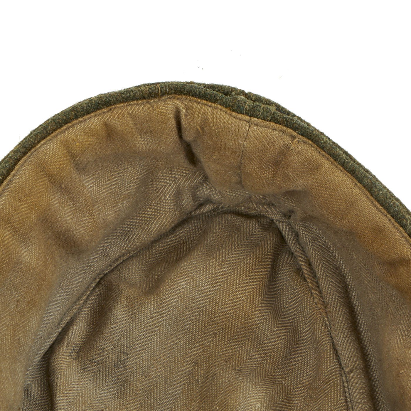 The interior of cap is a light gray HBT fabric, stamped 57 on the top for the size. This lining style is common with Italian made caps. It has sweat and oil stains ;around the edge, indicating light to moderate use. The visor is still in good condition, though it does have a fold in it, and ripples as well, very common in the field, as these often would get wet. The stiffener in these caps is made from pressed paper, so they easily deform with use and especially moisture.