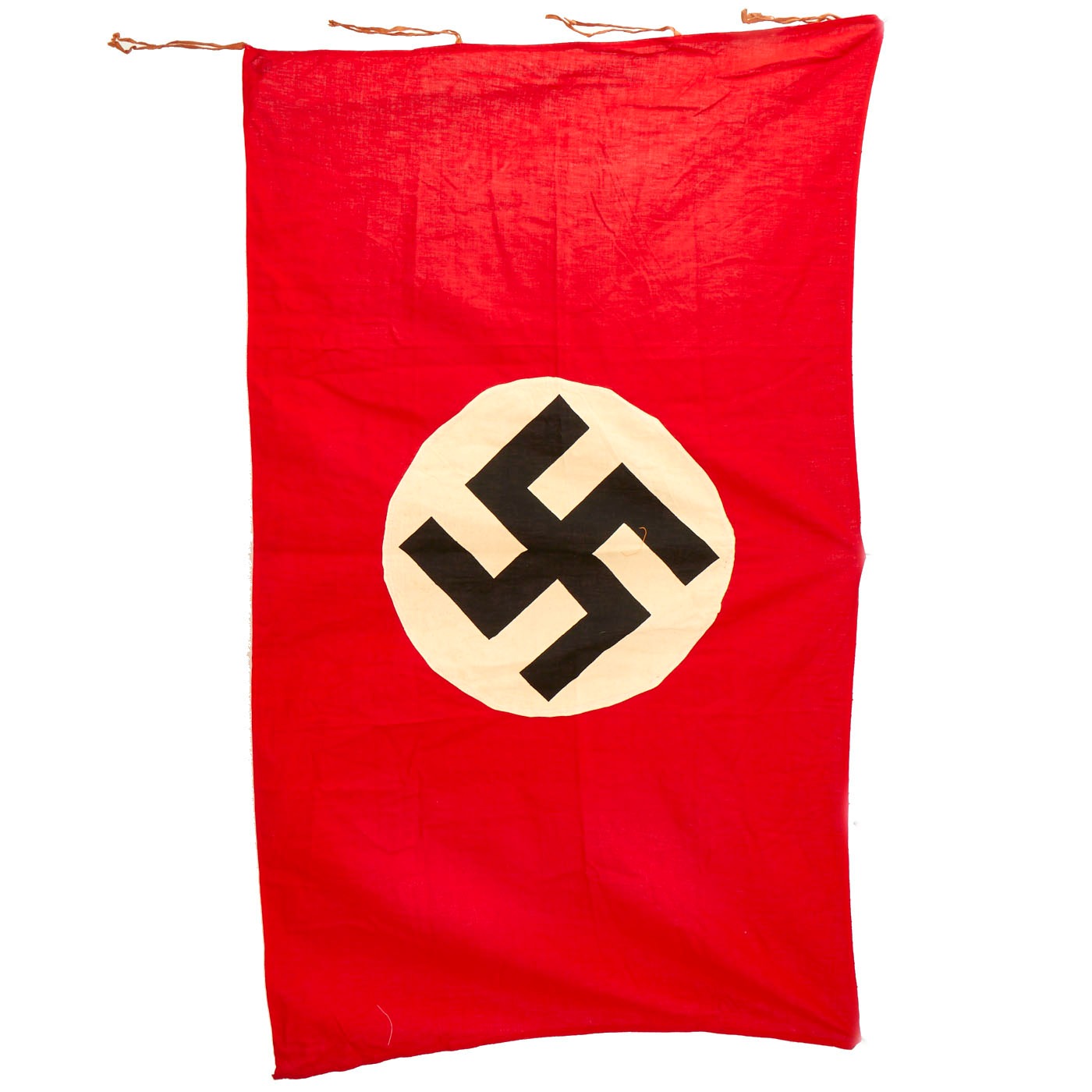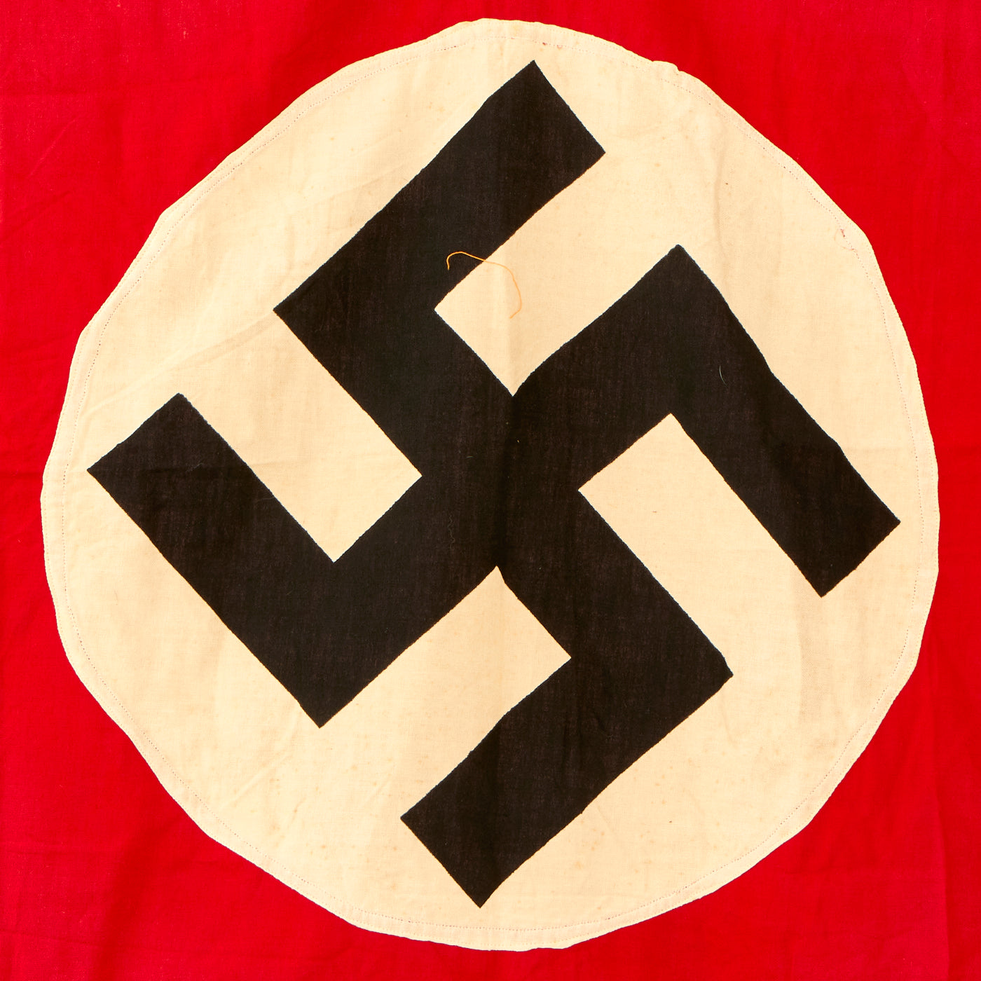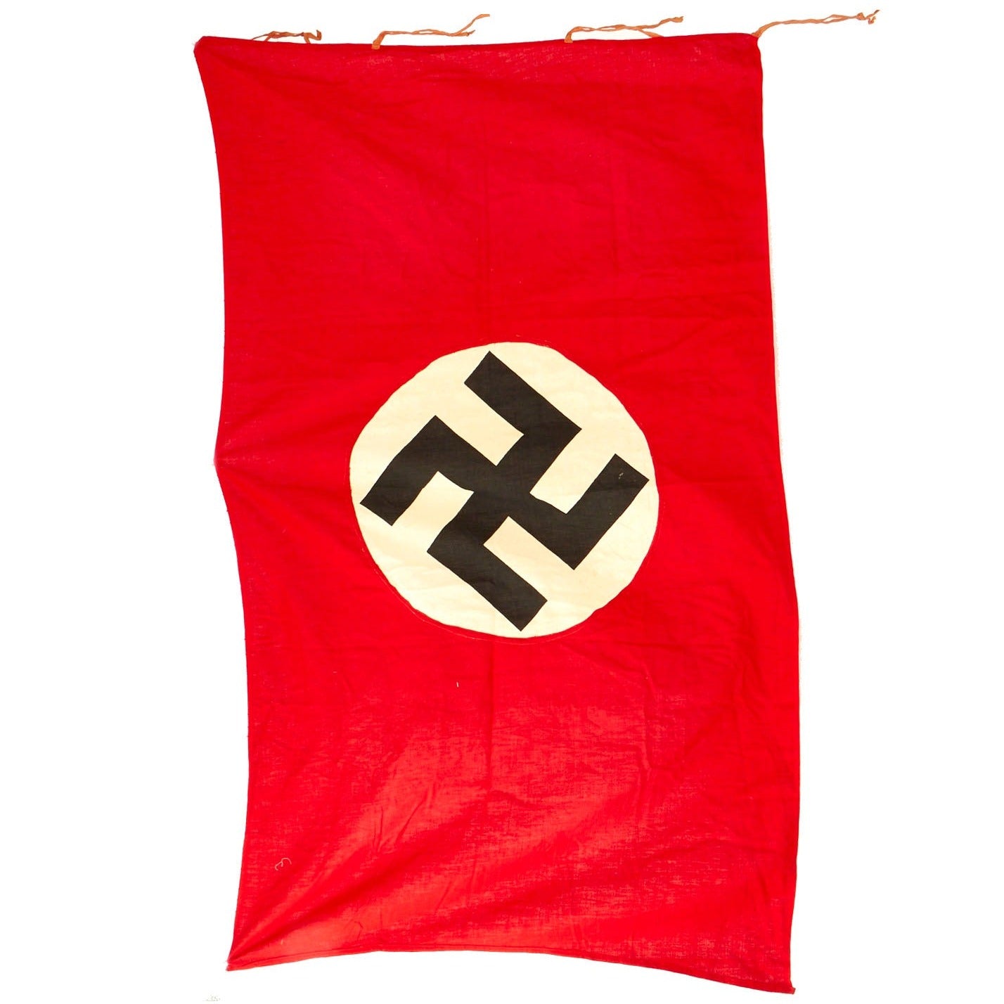 Original Item: Only One Available. This is a very interesting Italian Made WWII German National Socialist Political banner or possibly flag (Nationalflagge/Parteiflagge 1933-45), which measures a very displayable 39" x 64". These could be hung vertically or horizontally, and were displayed on buildings, on podiums during speeches, or sometimes even hung up at camps. It looks to be of all cotton construction with a single piece red field, and is single-sided, with a single piece cotton white circle in the center with a dyed on black Swas (Hook Cross) on each side. It is visible from both sides as there is a hole in the red field, but is reversed when viewed from one side.