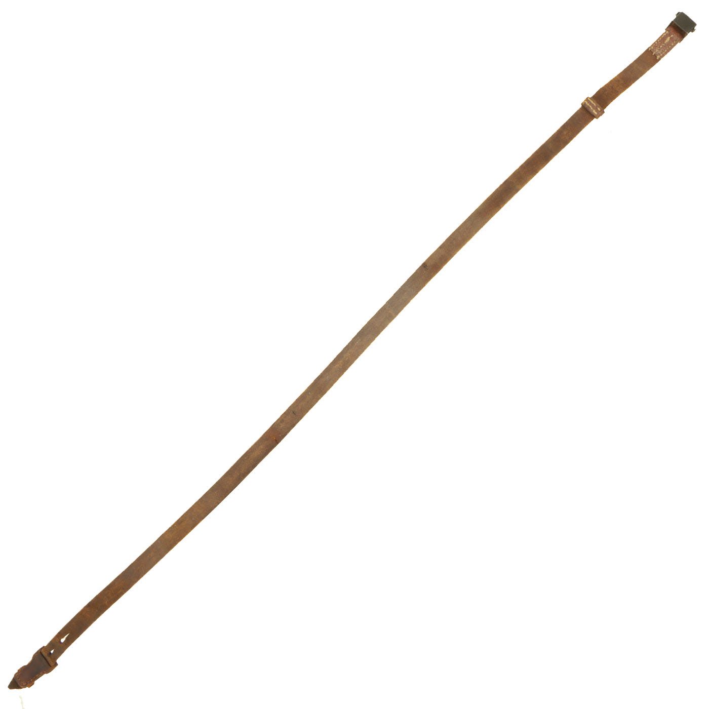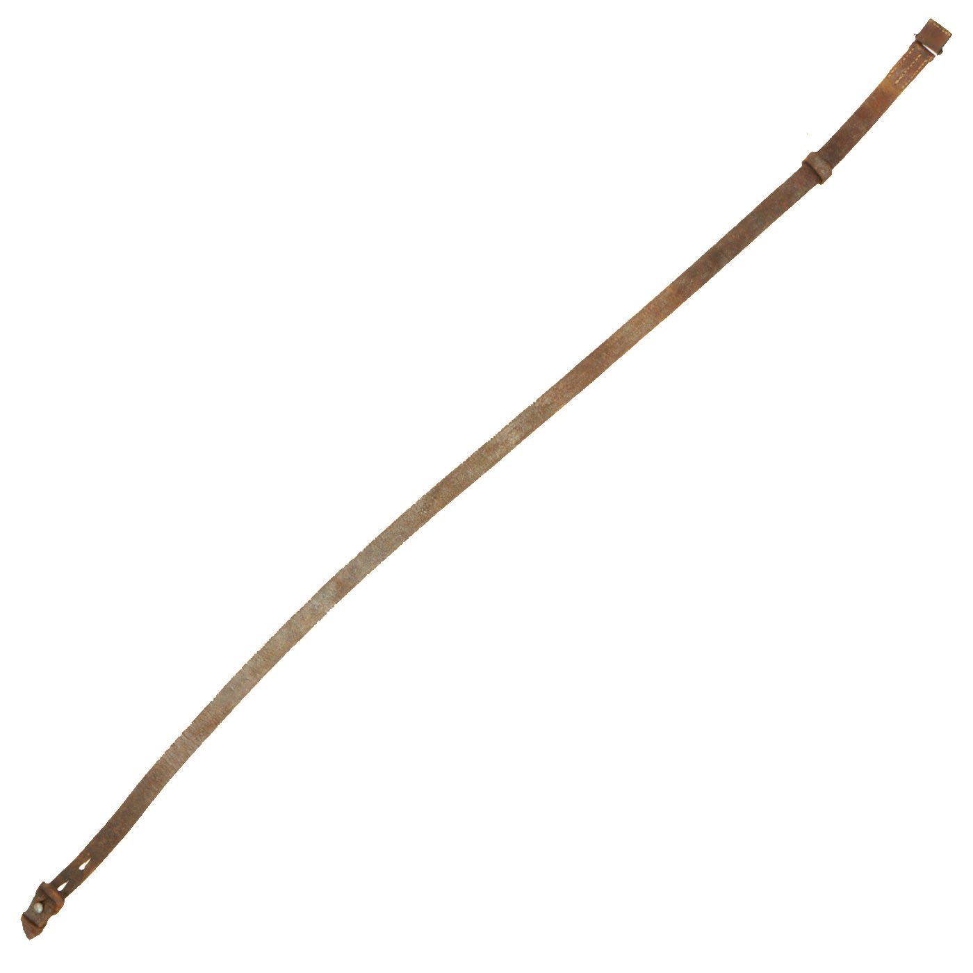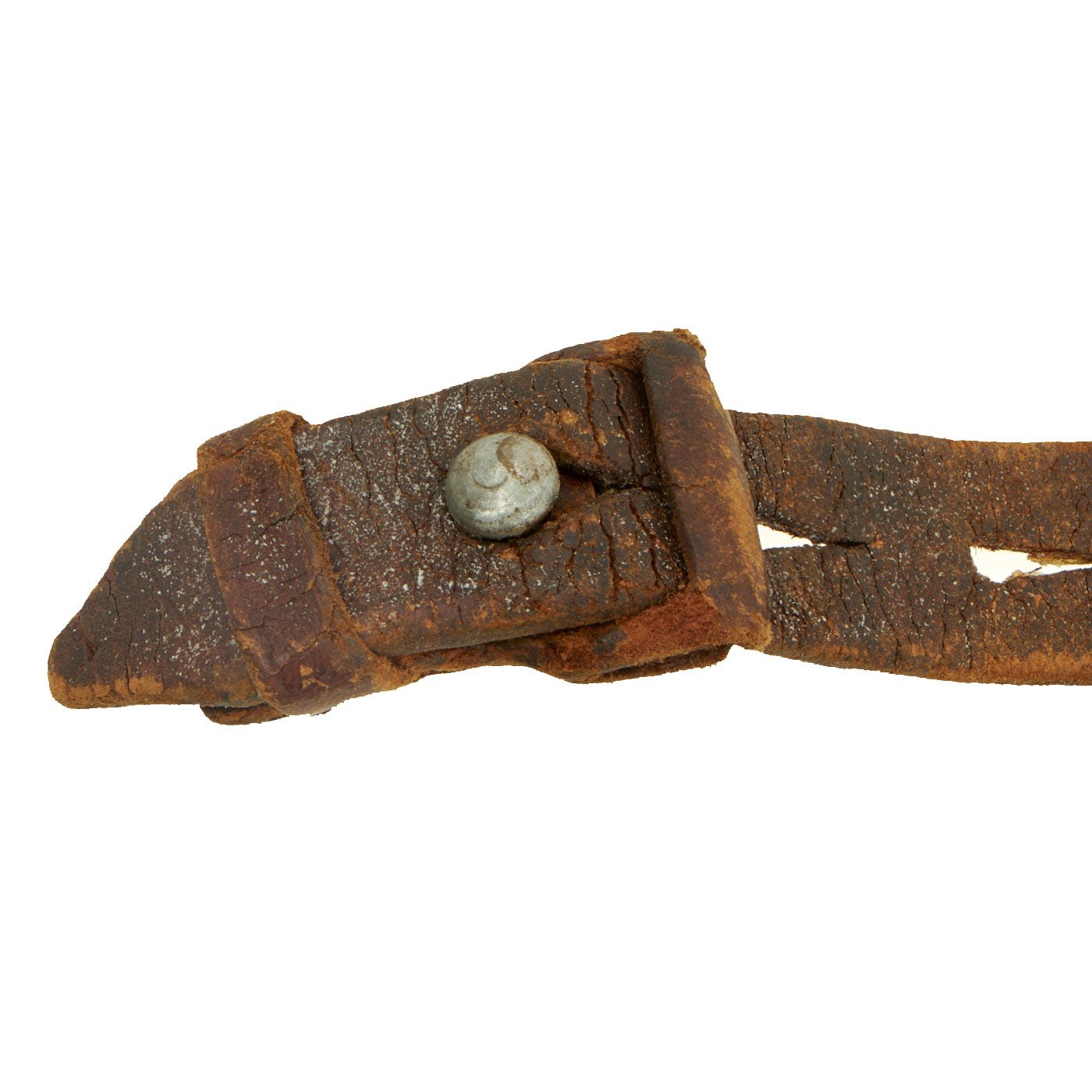 The leather on this example does show some surface degradation from years of storage. It does not show much sign of actually being used, which would make the embossed texture on the leather faint, and usually cause the sling to darken in color as it got dirty and oil stained. The stitching is fully intact.