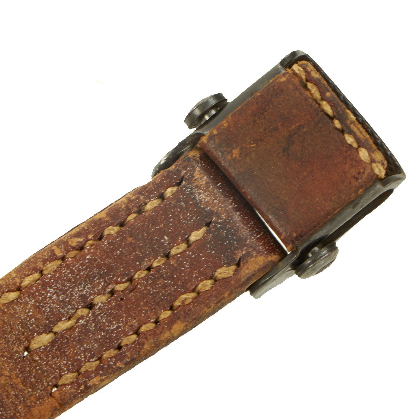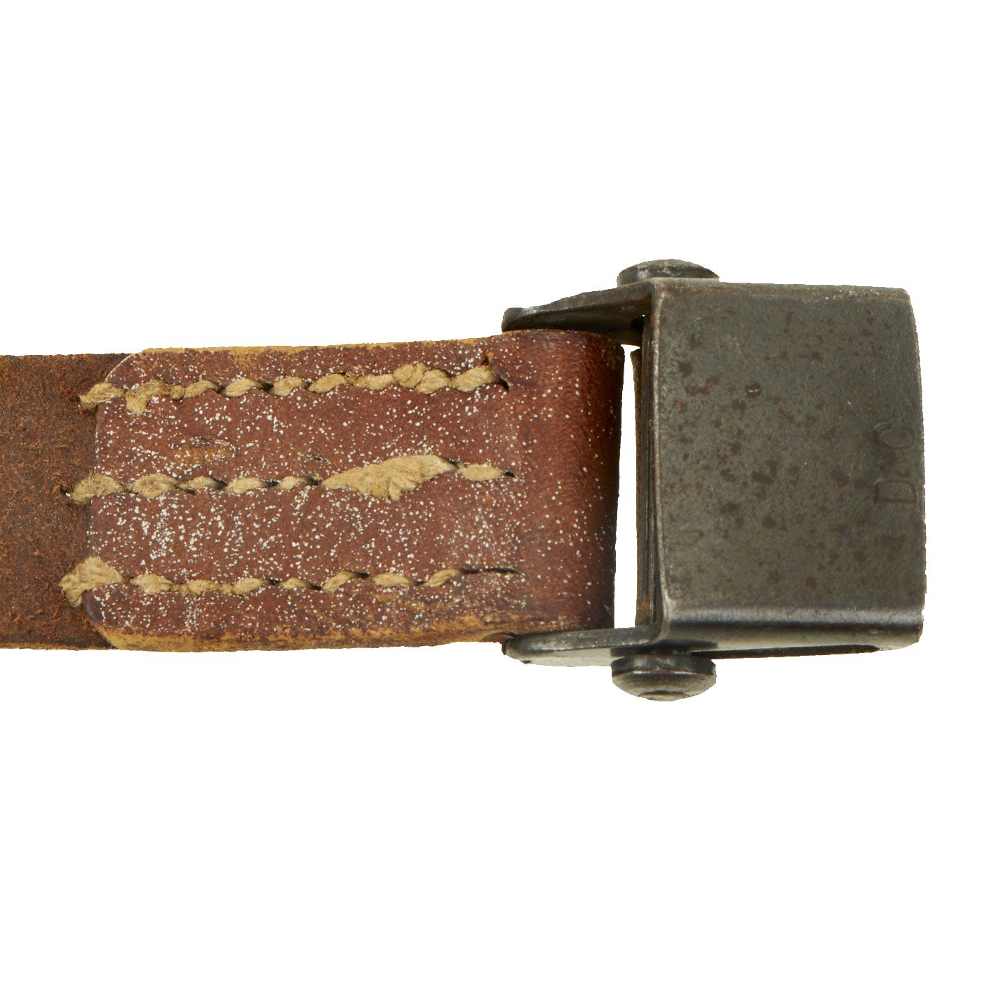 This is a very nice solid example that retains its steel buckle (Klemmstück), with the leather guard fully intact, and a great blued finish. The buckle pin (Klemmwaltze) is in good condition, and is the later war type with smooth ends. The inside of the buckle has the correct textured surface for a more secure length adjustment. The buckle is also maker marked D & C, for Dransfeld & Co in Menden/Sauerland, one of four known subcontractors. The sling end frog (frosch) is correct and made from leather covered steel. The sliding keeper loop is present, which are often lost over the years.