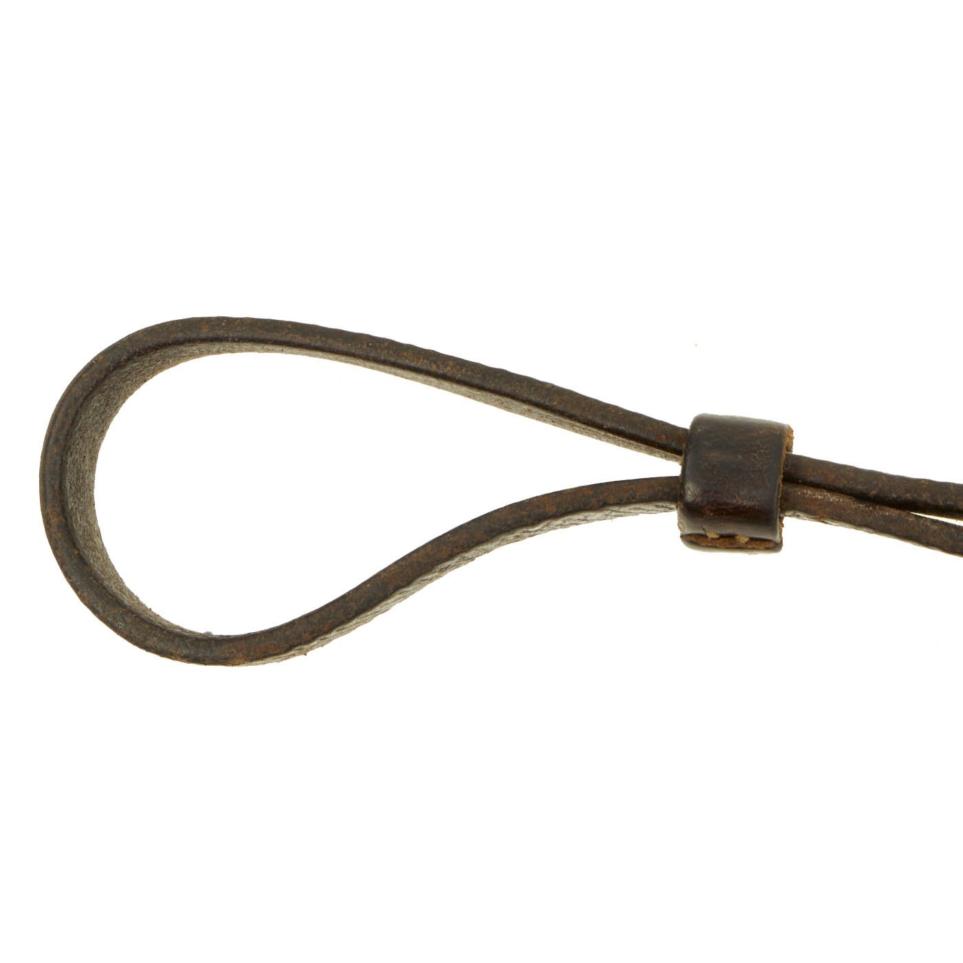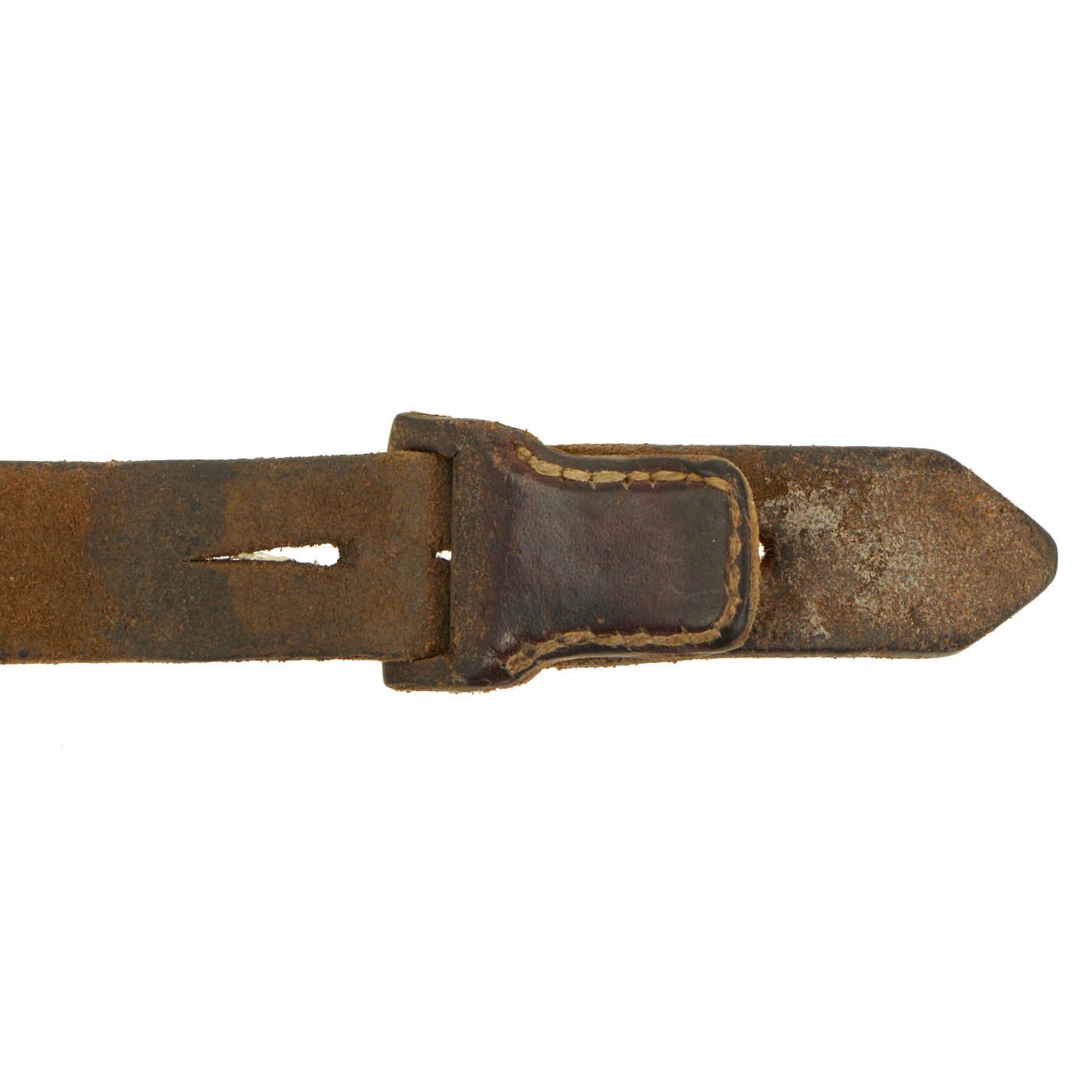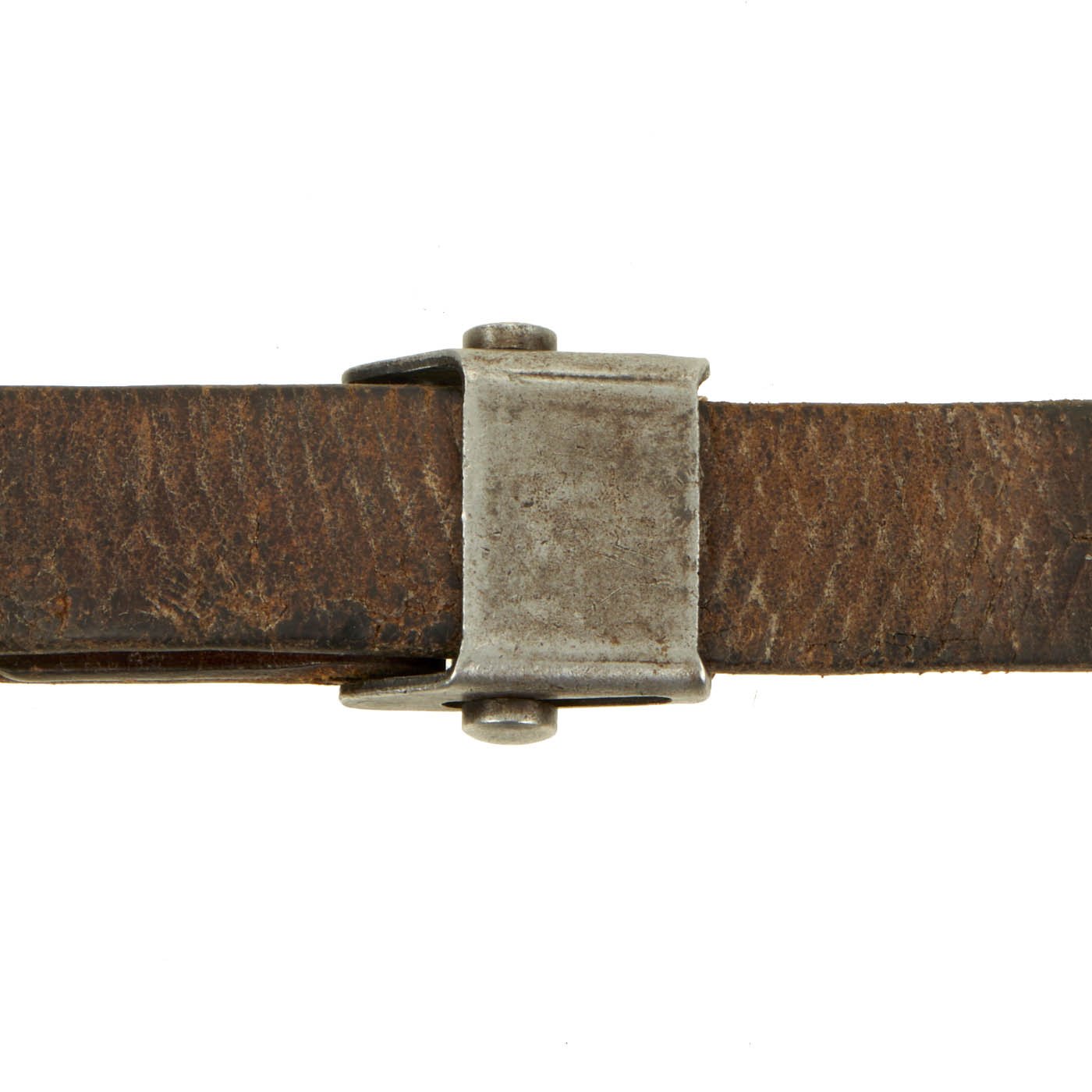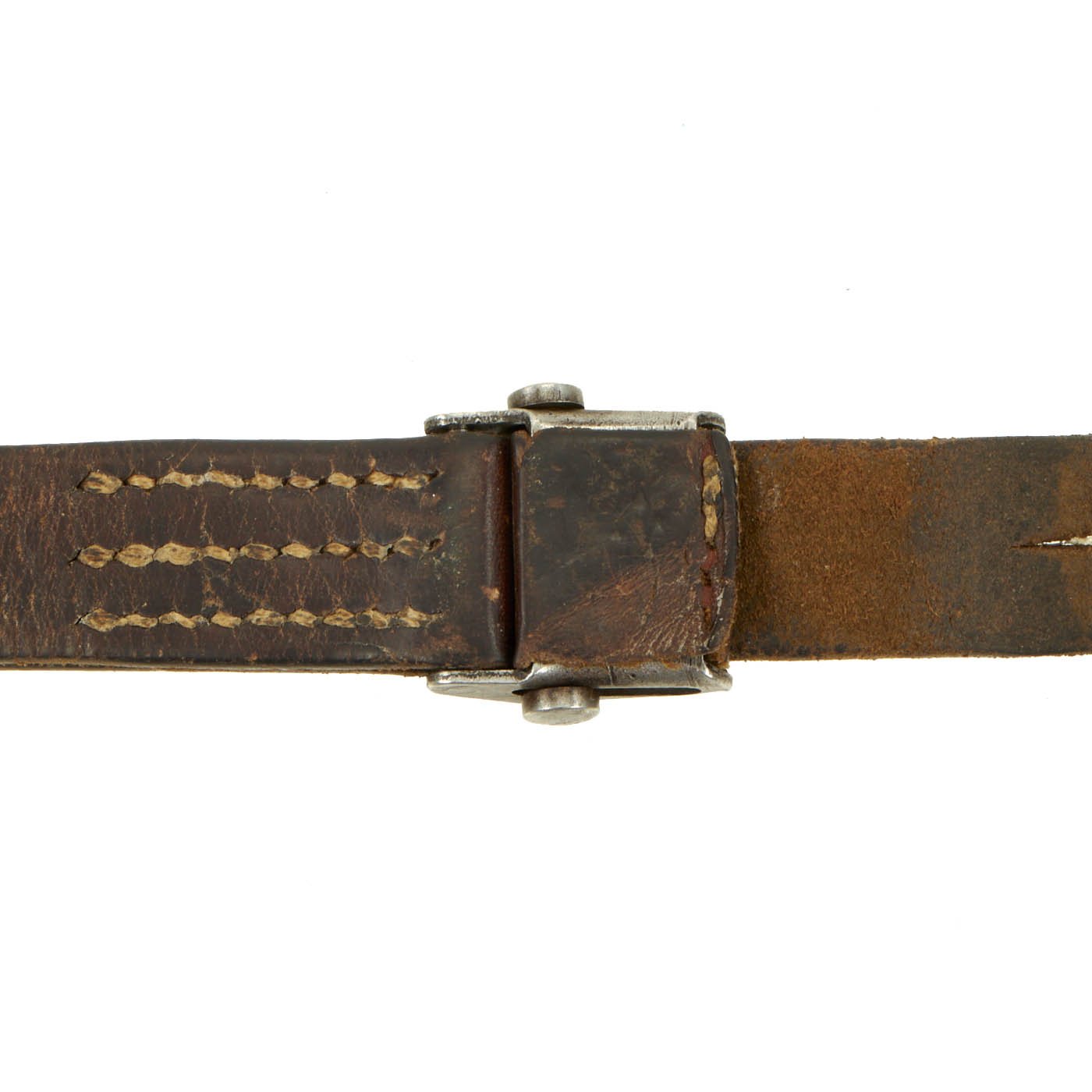 This is a very nice solid example that retains its steel buckle (Klemmstück), with the leather guard mostly intact, and a great worn finish. The buckle pin (Klemmwaltze) is in good condition, and is the later war type with welded ends ground smooth. The inside of the buckle has the correct textured surface for a more secure length adjustment. There is no maker mark on the buckle, however it is completely correct in style and form. The sling end frog (frosch) is correct and made from leather covered steel. The sliding keeper loop is present, which are often lost over the years.