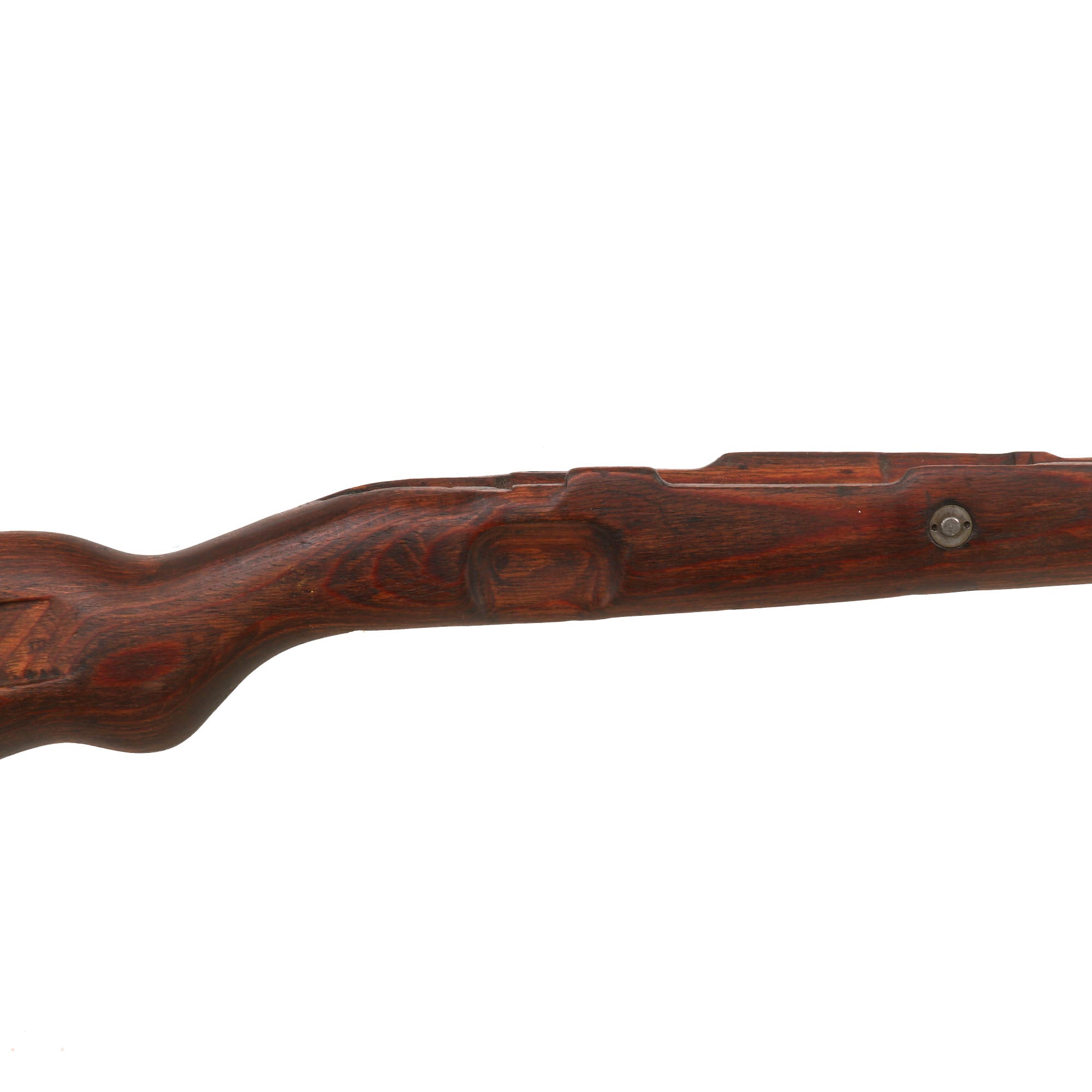This is a very nice 1941 dated Karabiner 98k butt stock, made with laminated wood and cup butt plates as is correct for production after 1940. It has the nose cap / bayonet fitting, receiver strengthening bolt, and the correct 30mm metal fitting through the butt stock that aided in bolt disassembly in the field during cleaning. It also has had the top of the left lower stock along the woodline inlet to the rear of the hand guard, indicating that it was set up to use the ZF41 Sniper Scope. This does look to have been modified in the field, and not a factory alteration, probably to replace a broken stock on a k98k Sniper Rifle.