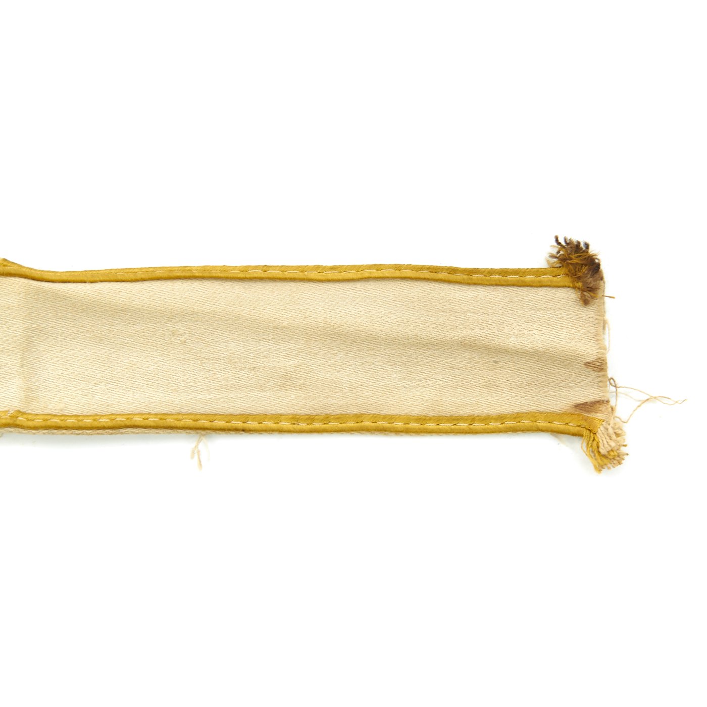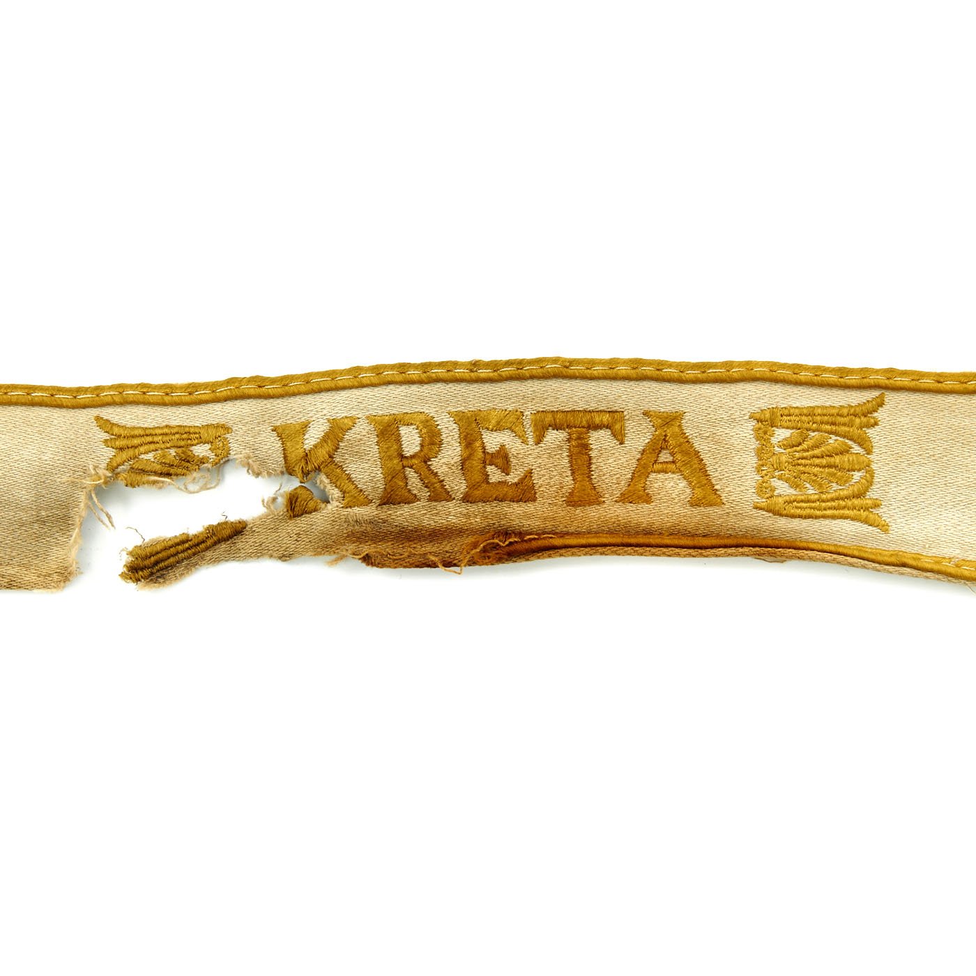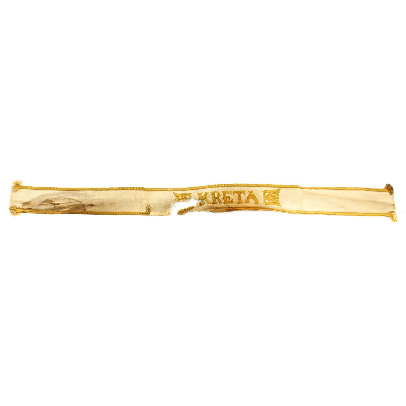 Original Items: Only One Available. This is a nice but well worm and slightly damaged Kreta Campaign Cuff title which was removed from a uniform. It is white cotton construction with machine embroidered Latin script "KRETA" in the center, flanked by acanthus leaves on both sides, the top and bottom edges trimmed in a yellow embroidered border, 1.5" x 17.5", interruptions in the fabric on the borders, soiled, torn and battle worn which appears to be a trophy war, most likely cut off in the battlefield.