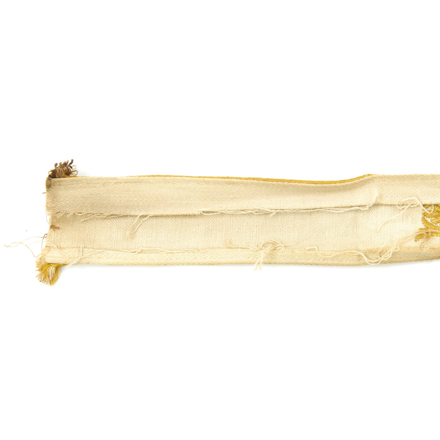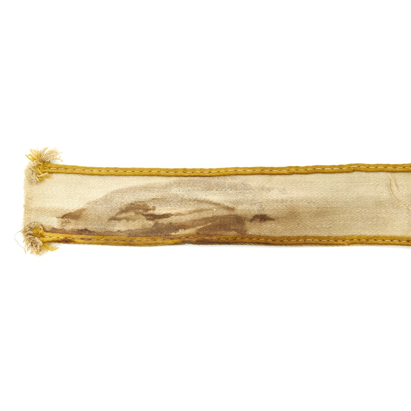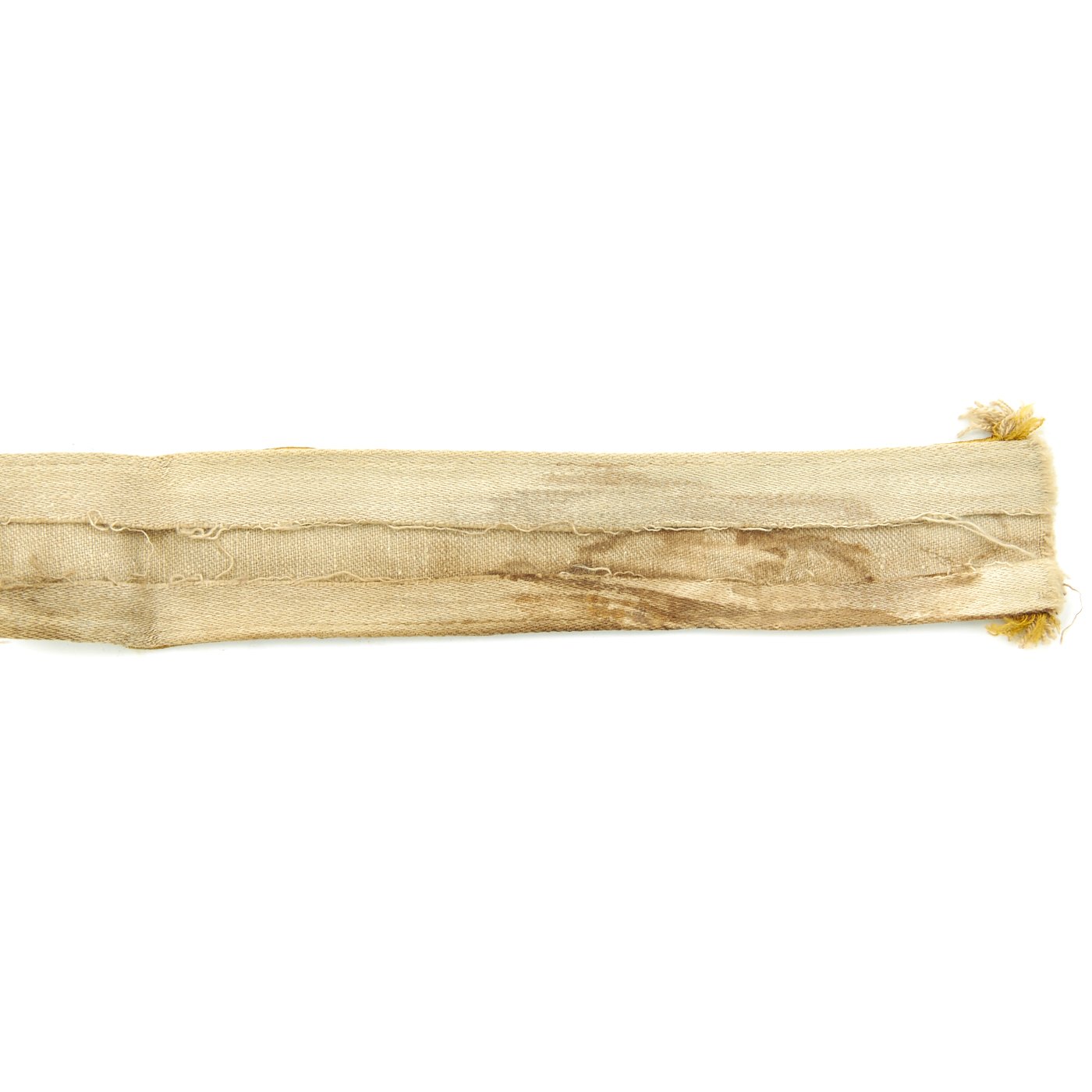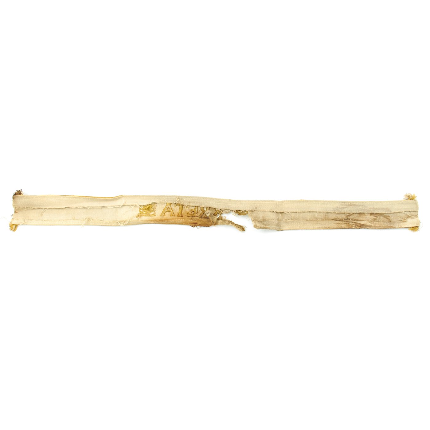 Original Items: Only One Available. This is a nice but well worm and slightly damaged Kreta Campaign Cuff title which was removed from a uniform. It is white cotton construction with machine embroidered Latin script "KRETA" in the center, flanked by acanthus leaves on both sides, the top and bottom edges trimmed in a yellow embroidered border, 1.5" x 17.5", interruptions in the fabric on the borders, soiled, torn and battle worn which appears to be a trophy war, most likely cut off in the battlefield.