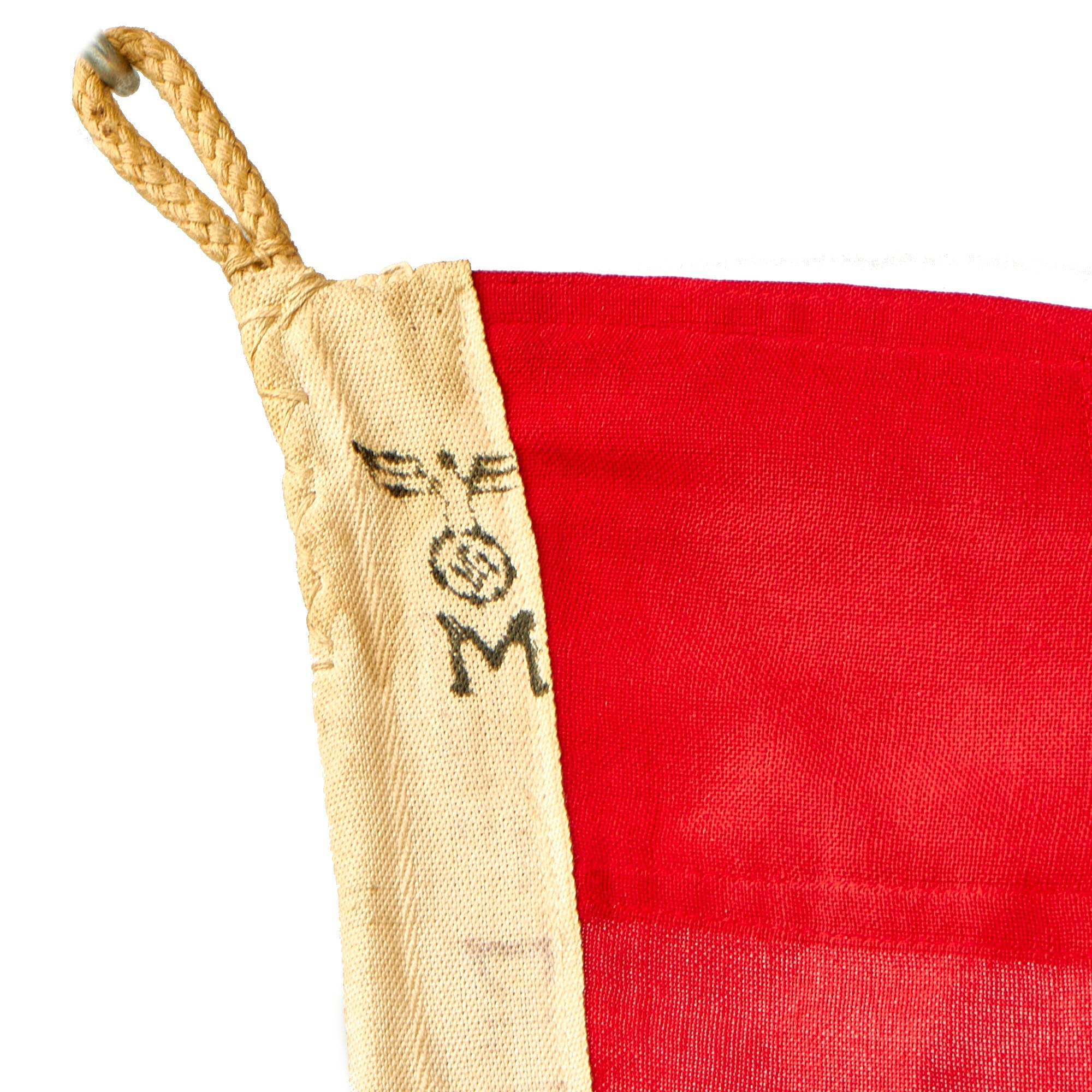 This Naval battle flag is totally original and is in very good service used condition, with the expected wear and damage due to age. It shows staining and holes from real use in the field. Most of these we see look like they got taken right from the factory, while this example has a fantastic "been there" look. The flag is marked on the header with an Eagle / M indicating German Kriegsmarine (Navy) acceptance. The header is also stamped with the correct naval designation and size number, along with the measurements: