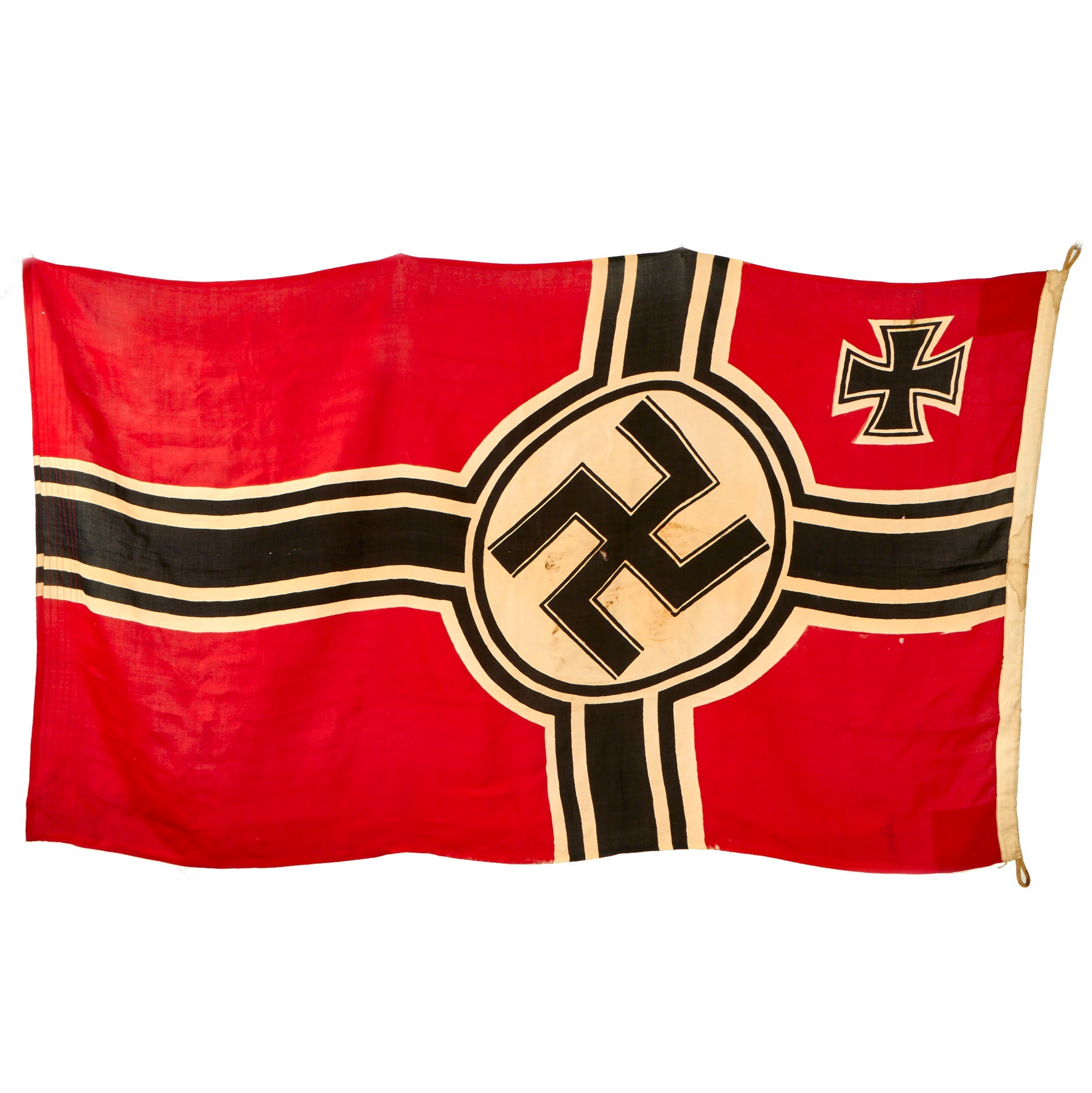 Original Item: Only One Available. The Reichskriegsflagge (Imperial War Flag) was the official name of the war flag and war ensign used by the German armed forces from 1933 to 1945. Recently acquired from a private collector, this is without a doubt the most impressive battle flag design of the German WWII era, in a nice medium size. It measures 39.4" x 66.9" or 100cm x 170cm, and would have been used on a smaller ship.