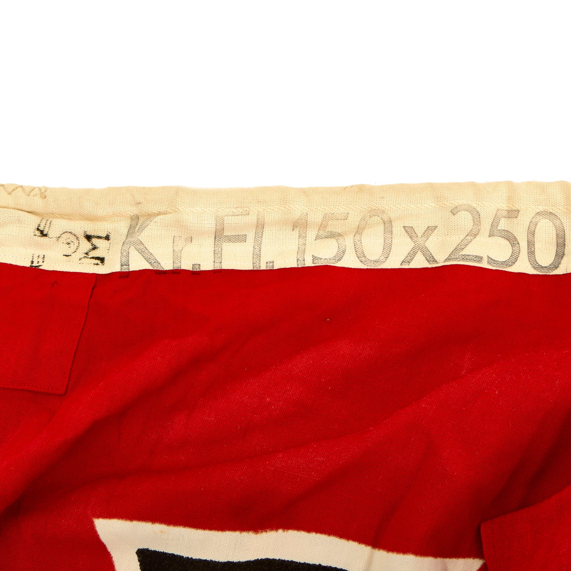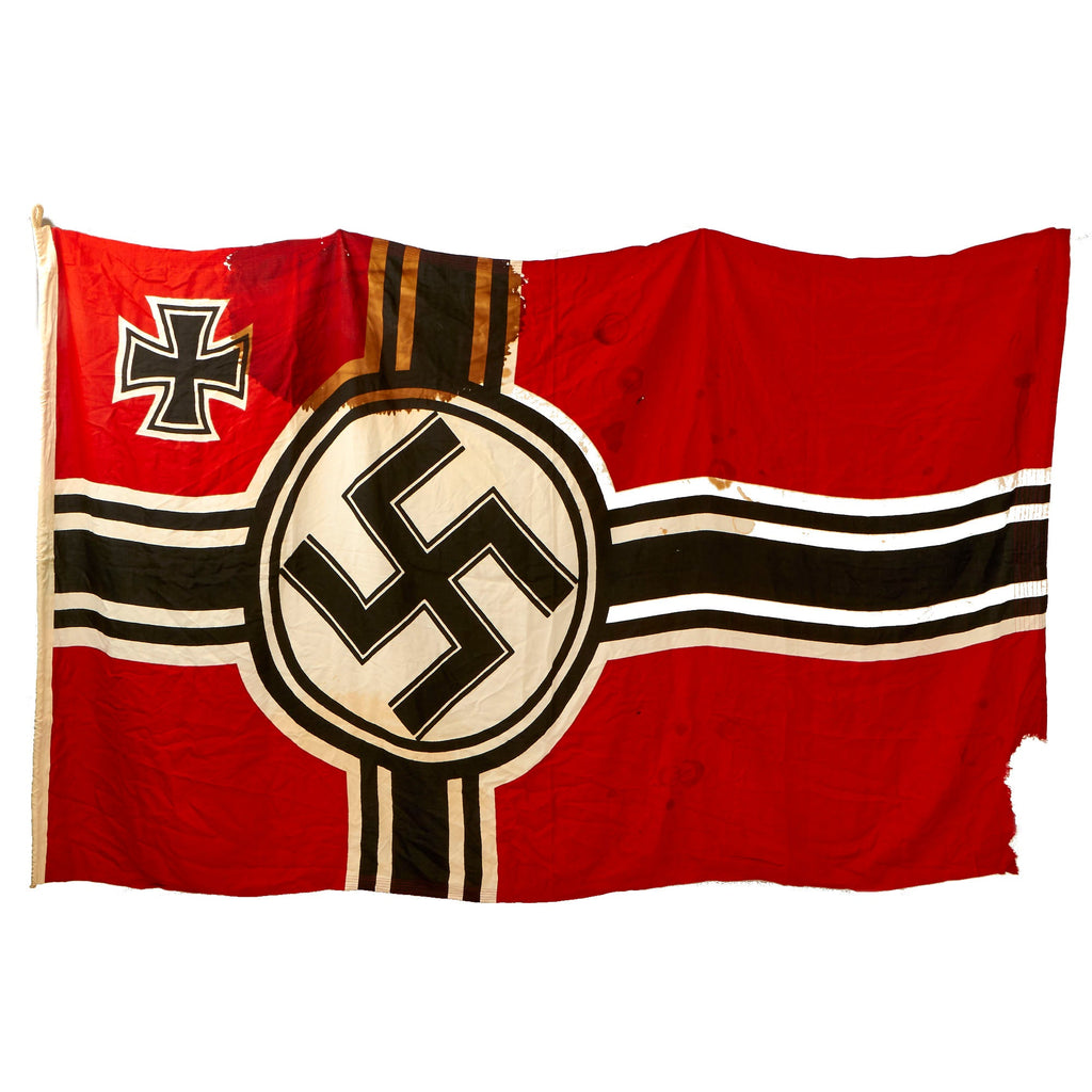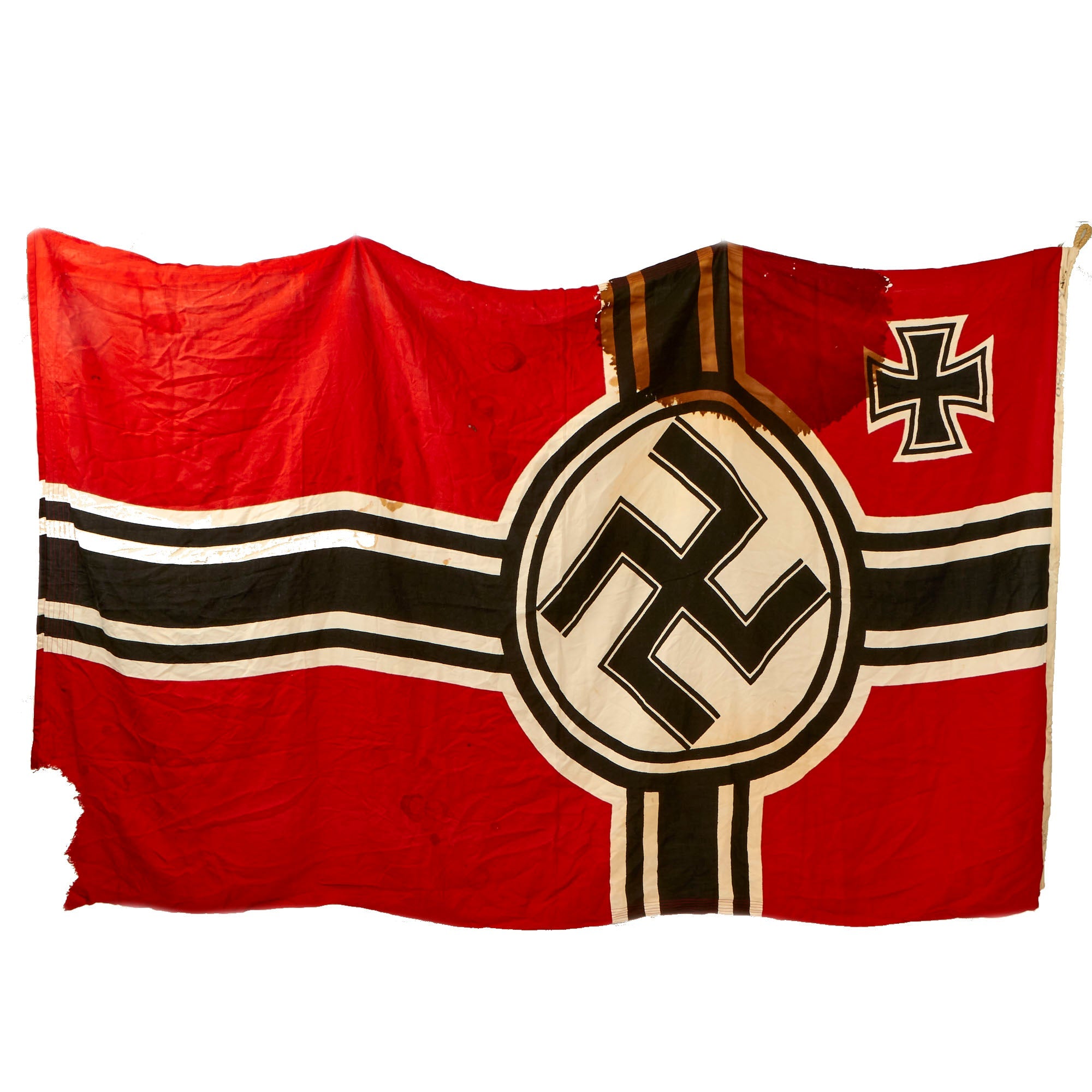 Original Item: Only One Available. The Reichskriegsflagge (Imperial War Flag) was the official name of the war flag and war ensign used by the German armed forces from 1933 to 1945. Recently acquired from a private collector, this is without a doubt the most impressive battle flag design of the German WWII era, in a nice medium large size. it measures 59.1" x 98.4", or 150cm x 250cm. This larger size indicates it would have been used on a sizable ship.