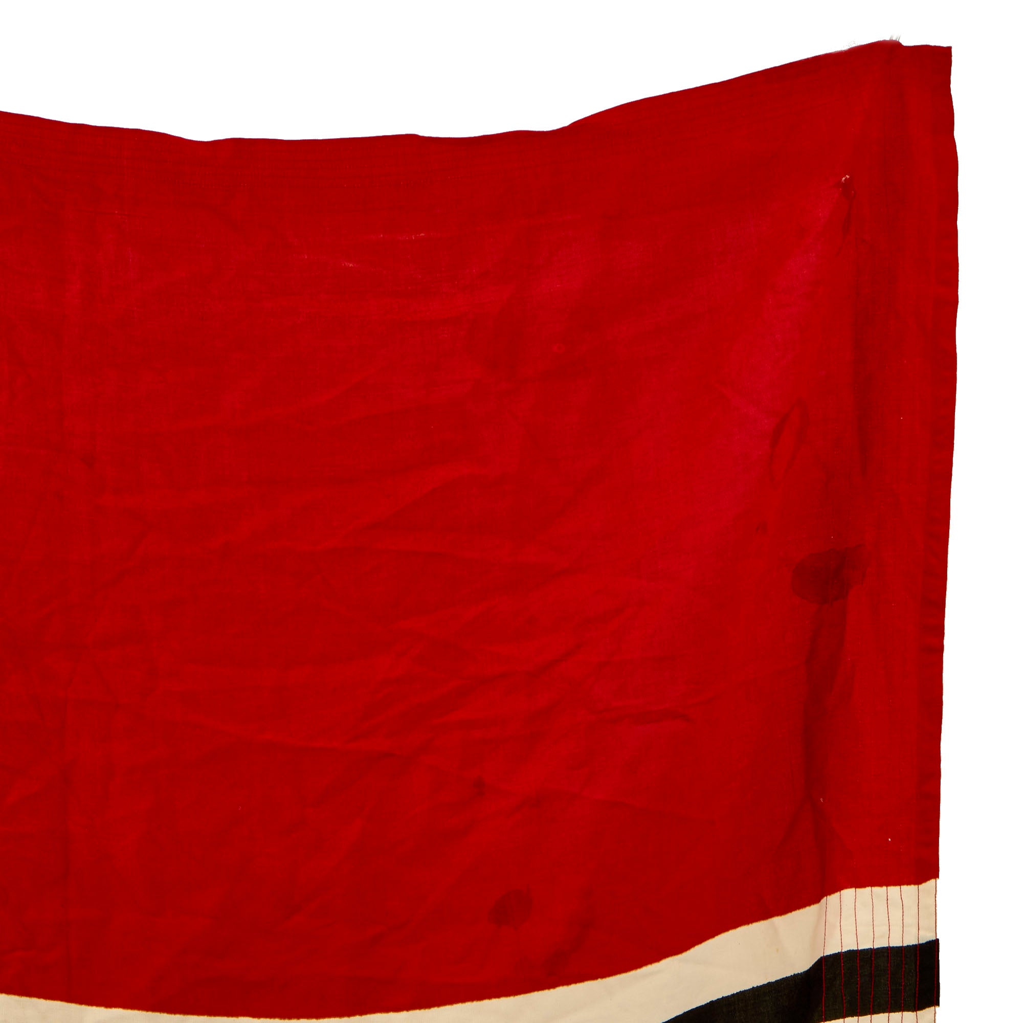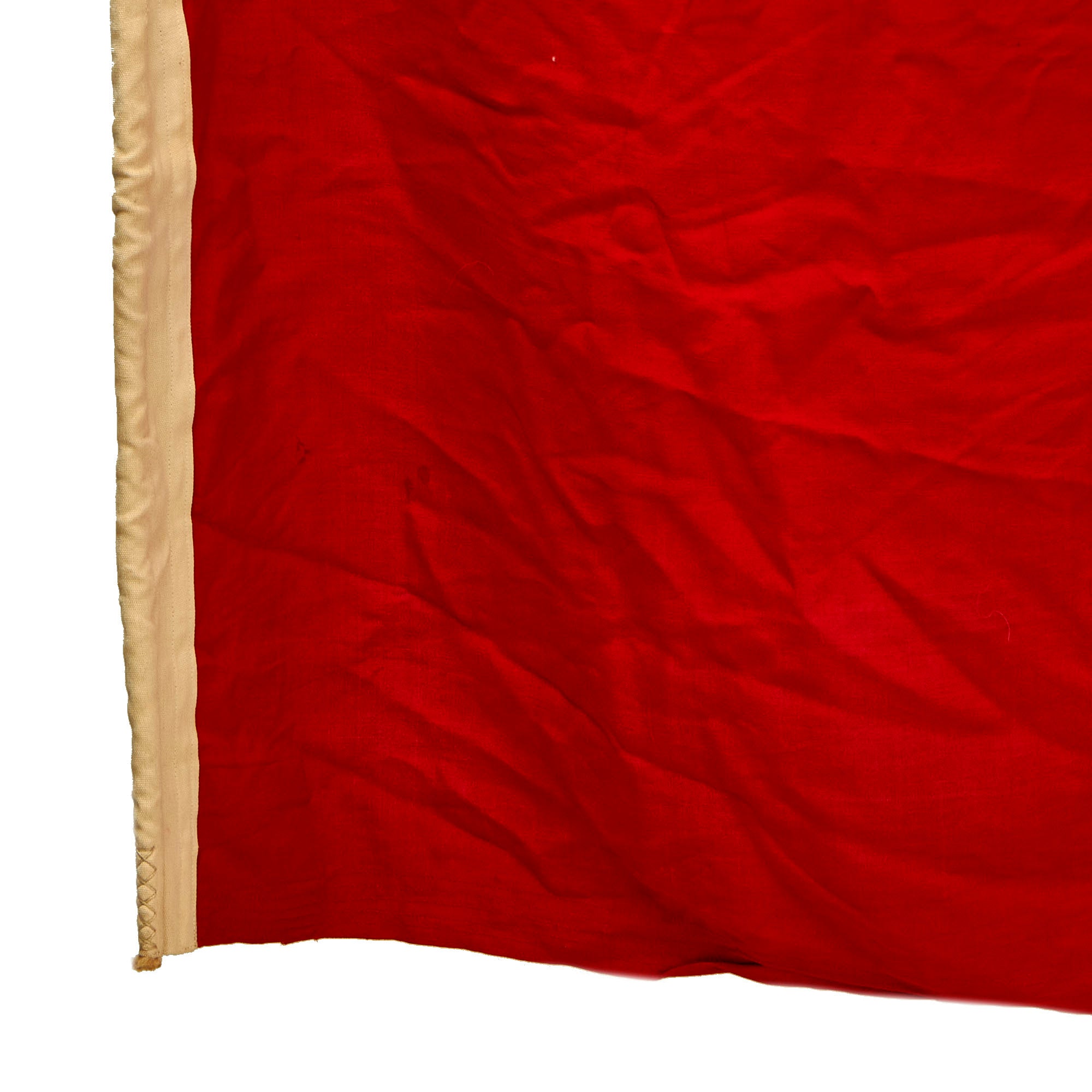 This Naval battle flag is totally original and is in good used condition, looking to have seen actual use in service. There is a good amount of material torn from one of the corners, and also a large stain about 24" wide on the top of the flag, which looks to be from oil or something similar. There are some smaller stains and tears visible as well, probably from before it was captured.