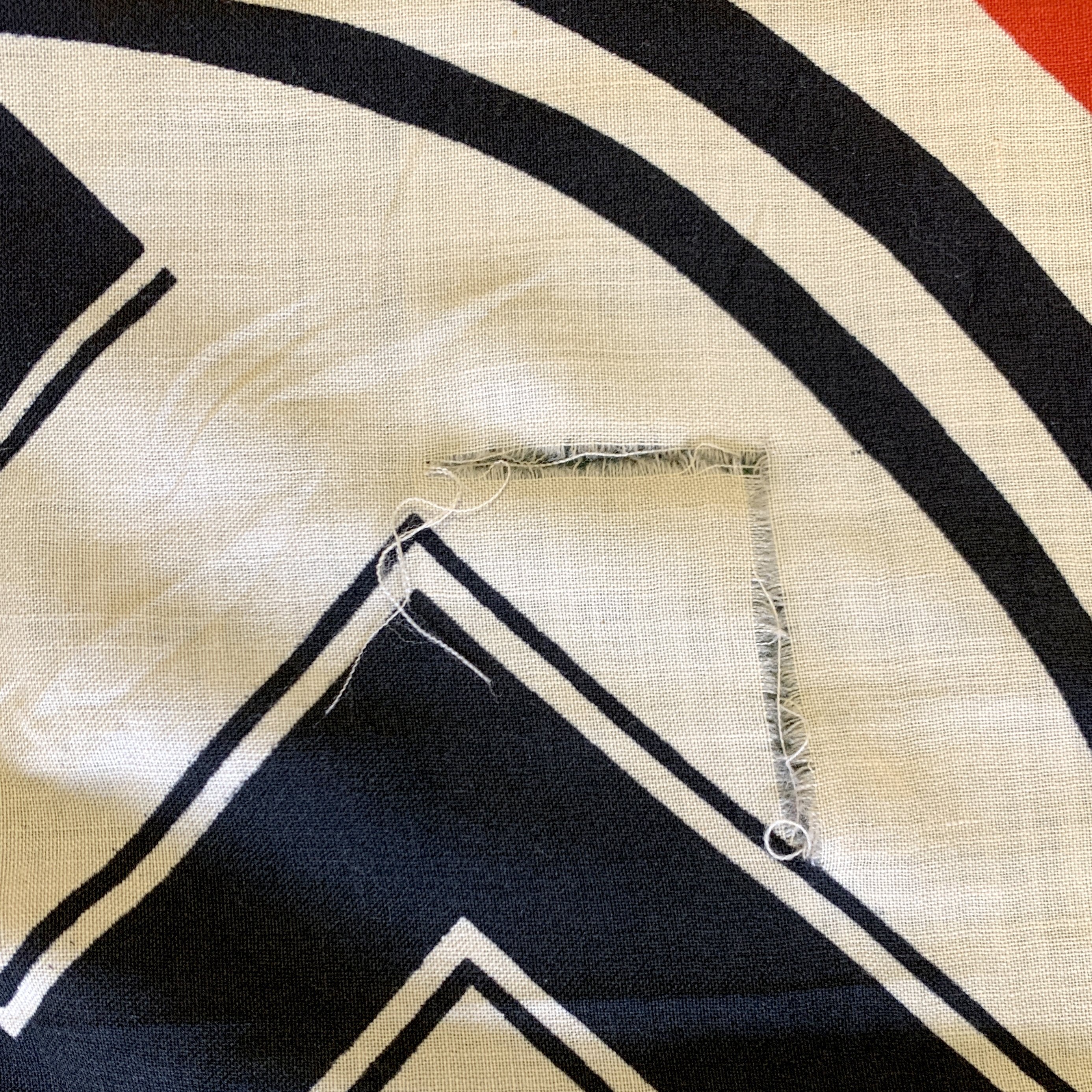 This Naval battle flag is totally original and is in very good condition, with the expected wear and damage due to age. The wool construction is unfortunately prone to degradation and moth, but this one has very little of that. However it does have a 3" x 3" tear where it got caught on something long ago, in the white circle by the swas. This unfortunately does not show in the photos. It is marked with the Eagle / M indicating German Kriegsmarine (Navy) acceptance. The header is marked on the right hand side: