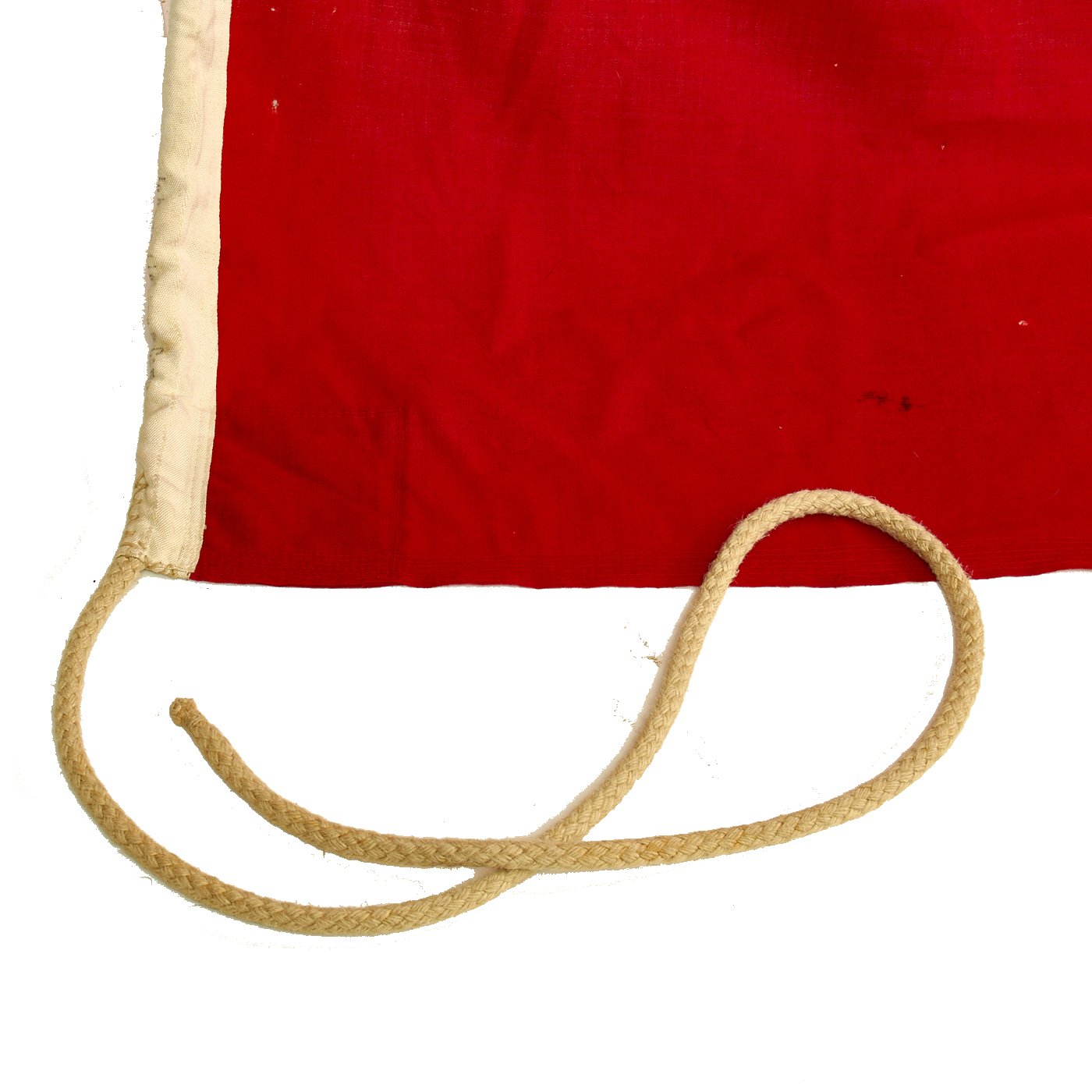 Constructed of wool with a bright red background with a large white central circle displaying a large Swas (hook cross or swas) with the German Naval Balkenkreuz (Beam Cross) design also in black to the edges. In the top corner (Canton) is a black on white Eisernes Kreuz (Iron cross). It features a canvas header, with a nice long halyard on the bottom, and a loop on the top.