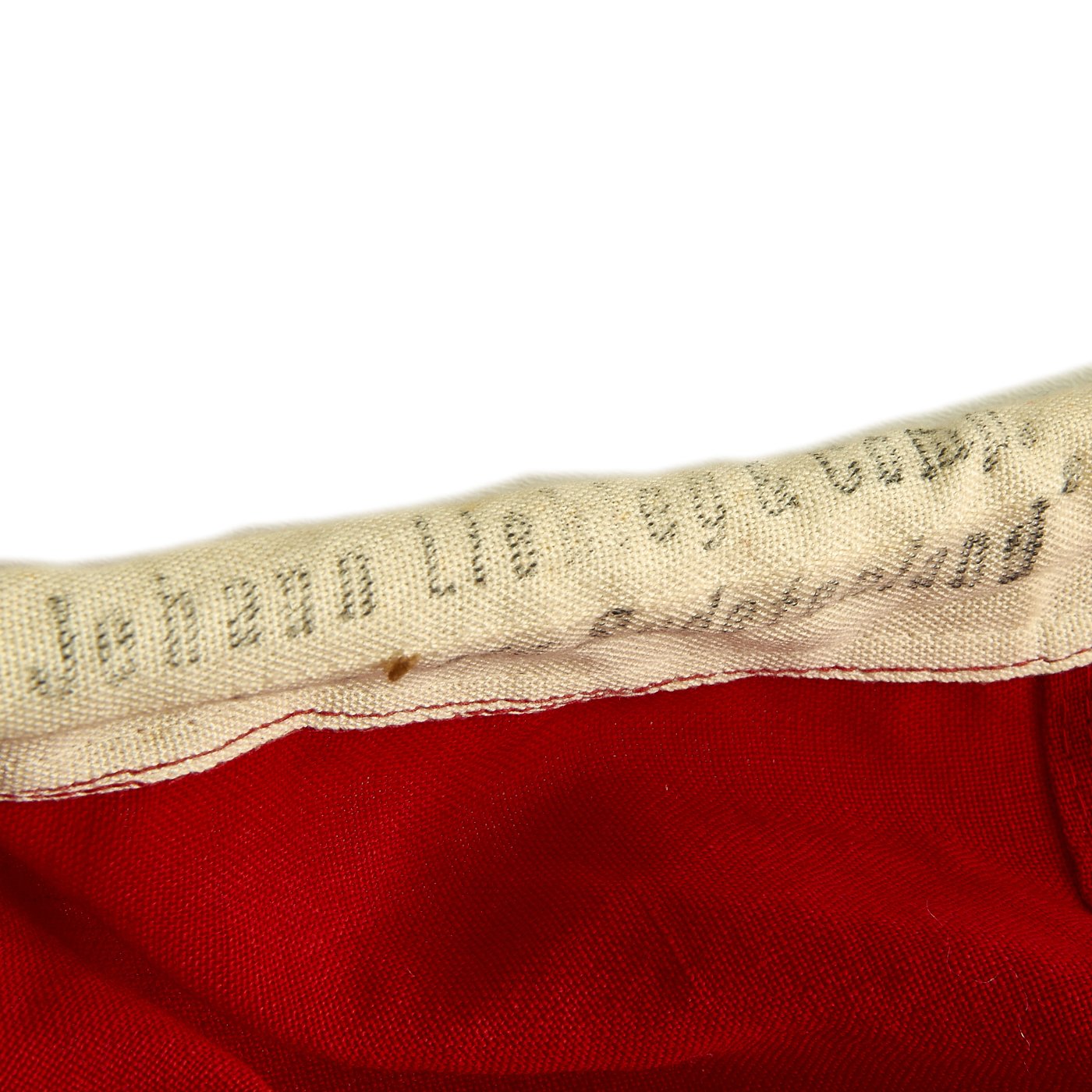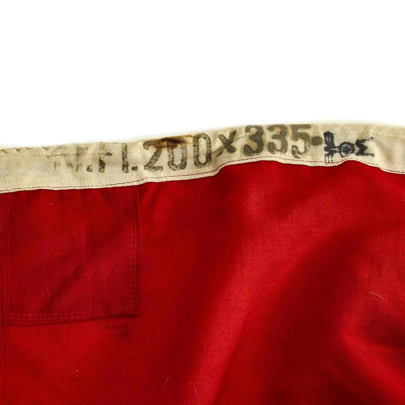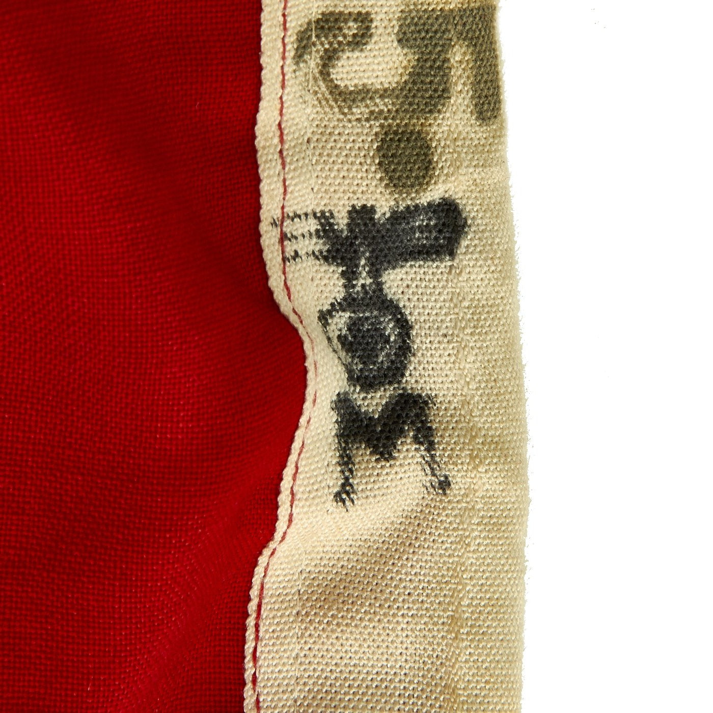 This Naval battle flag is totally original and is in very good condition, with the expected wear and damage due to age. The wool construction is unfortunately prone to degradation and moth, which this flag does have to a small degree. There are some small holes and tears, but nothing major. The flag is marked on the header with the Eagle / M indicating German Kriegsmarine (Navy) acceptance. The header is also stamped TWICE on the right hand side with the flag type designation:
