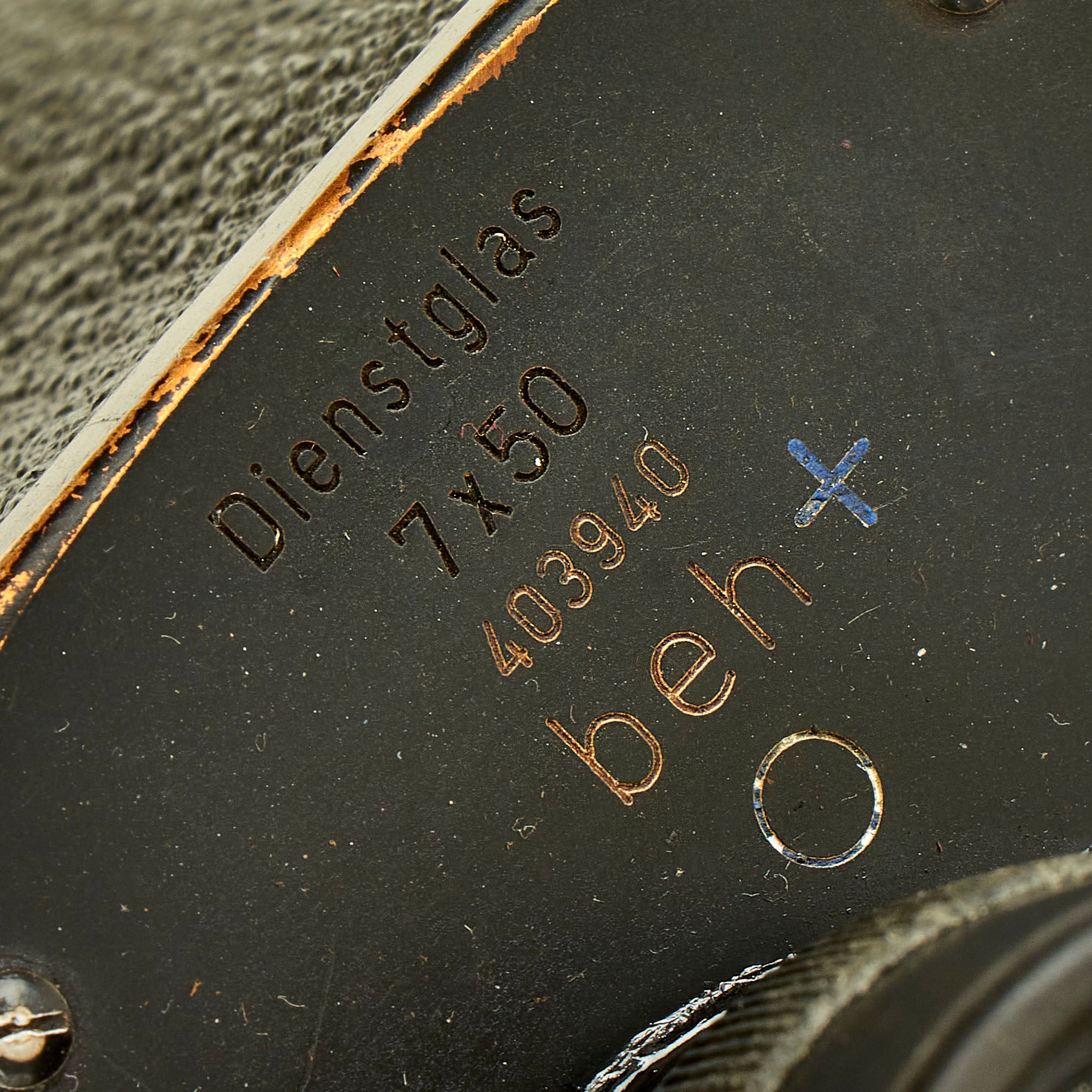 Original Item: Only One Available. This is a very nice set of German WWII binoculars known by the German Wehrmacht as a Dienstglas 7x50 (service glass 7x50). They are marked with the specifications and maker information on the rear of the right barrel: