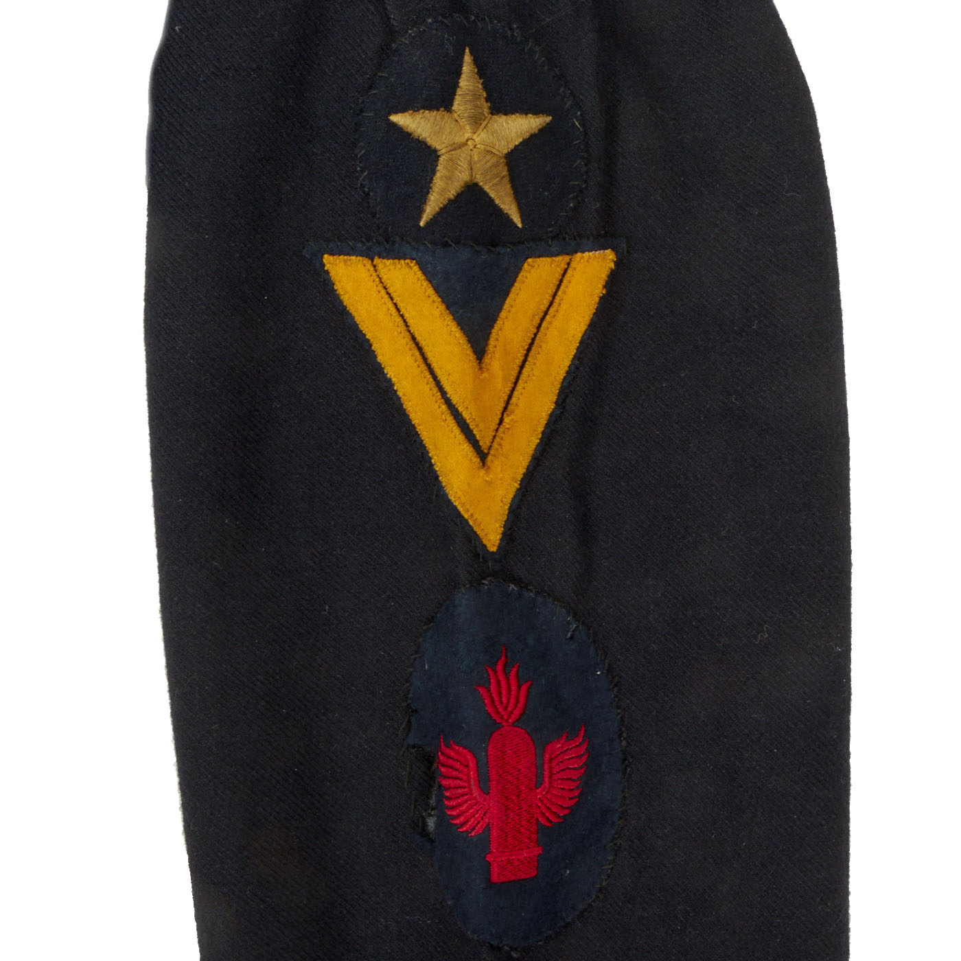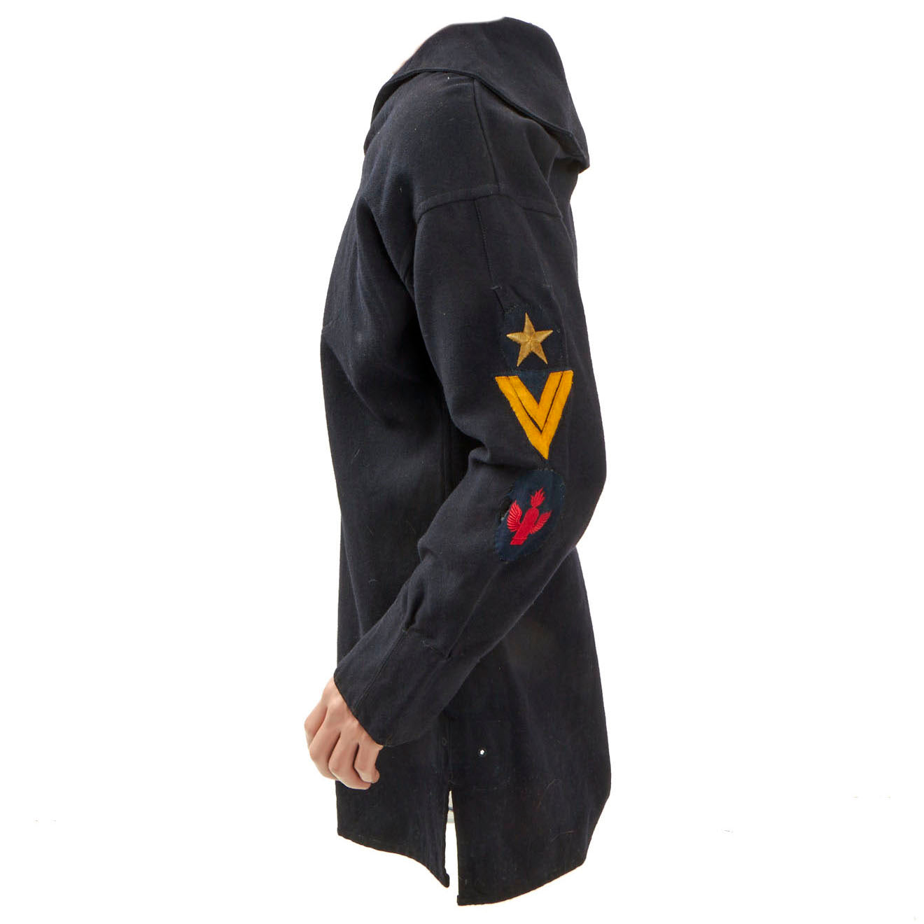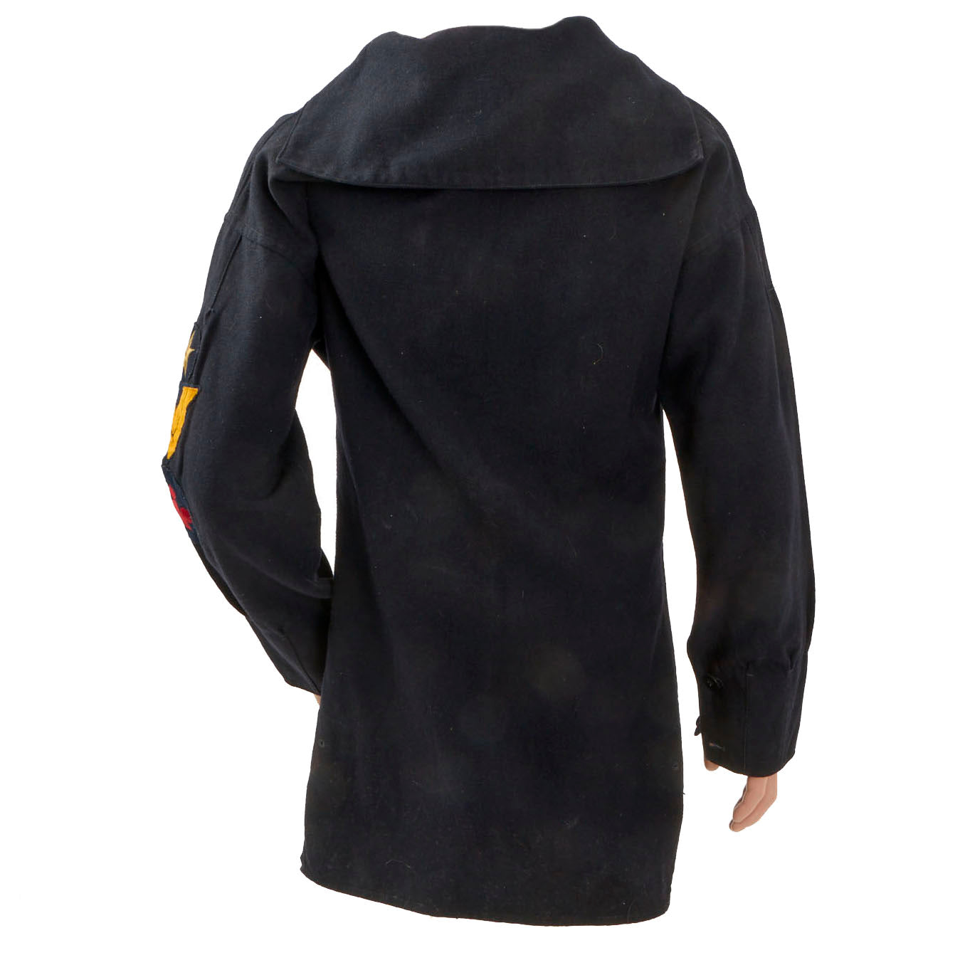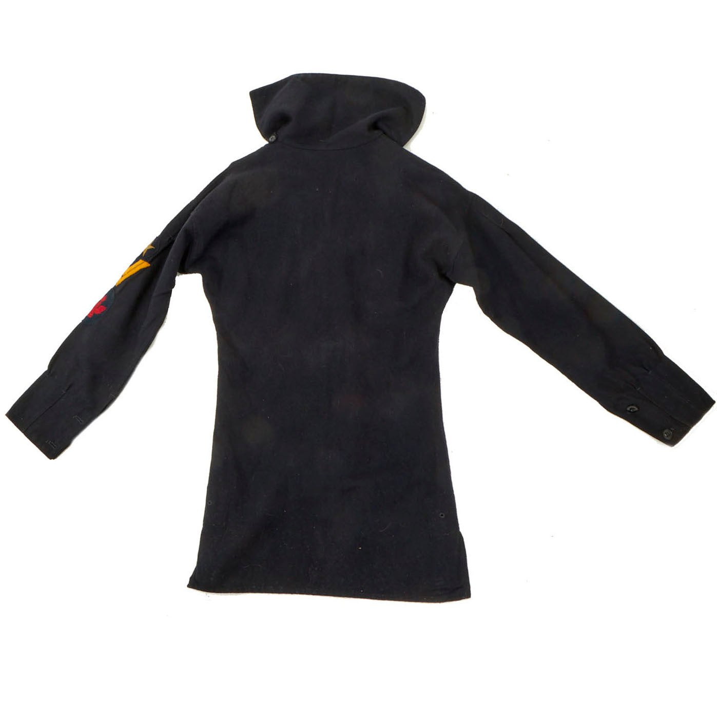 This beautiful Kriegsmarine jumper belonged to a Matrosenobergefreiter (Seaman 1st Class) which was identified by the chevrons on the upper left shoulder of the jumper. His “rate” or job was an Anti-Aircraft Gun Crewman and the patch indicating so is on the left shoulder beneath the chevrons. The rating patch features the elongated bomb with wings on the sides of it. Both patches are of wool construction and appear to have been hand stitched on. There is very little mothing present on the insignia. On the right breast of the jumper the Kriegs eagle can be found. The eagle is brighter in color and not faded like the other patches, indicating that this very well could have been replaced at some point. This was definitely a service worn tunic and displays a “worn” appearance. There are some small holes present on the upper right side of the jumper on the front. They don’t appear to be caused by moths, the holes are in the same location where the buttstock of a rifle would sit when being shouldered, so they very well could be “snag” holes.