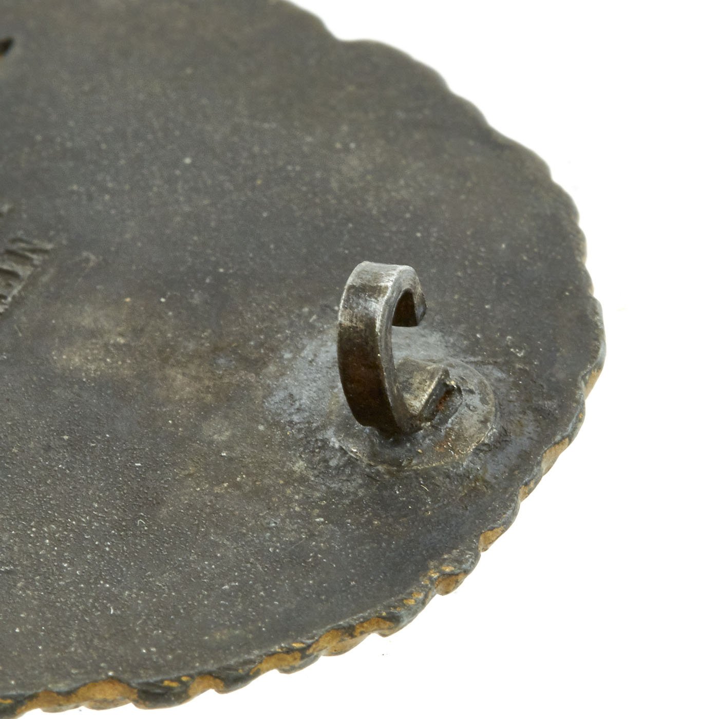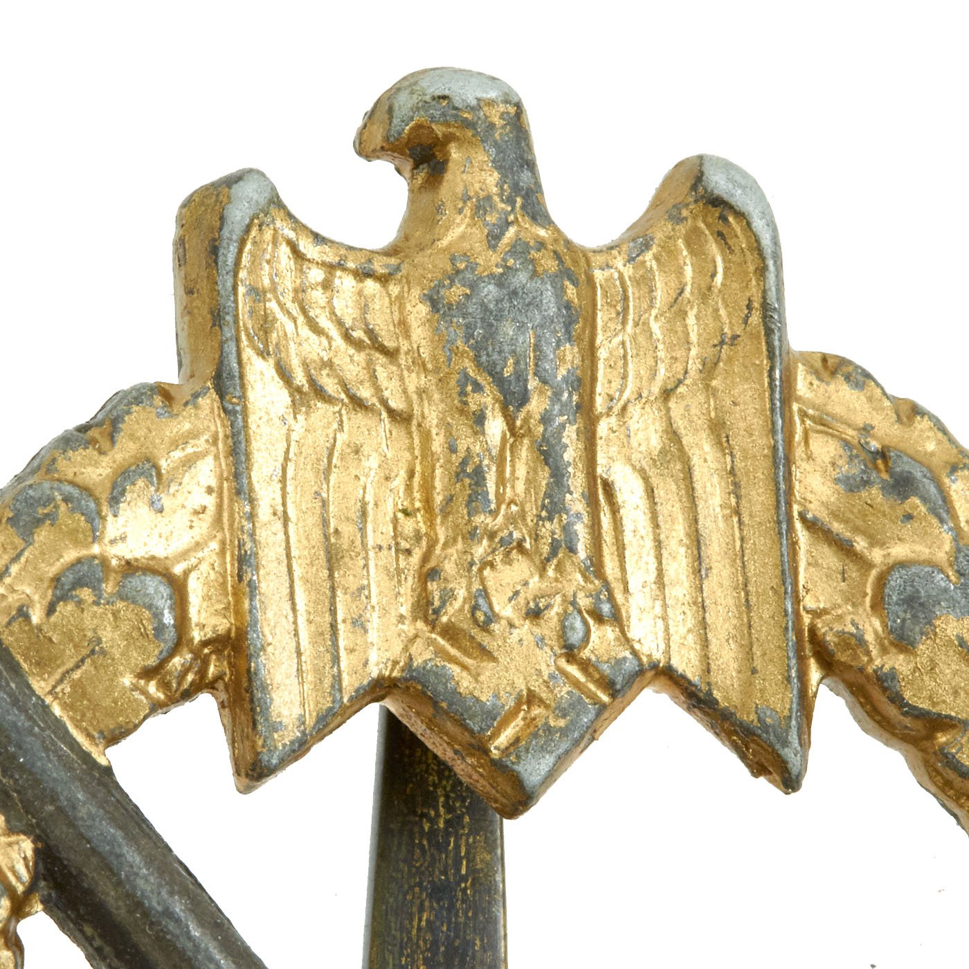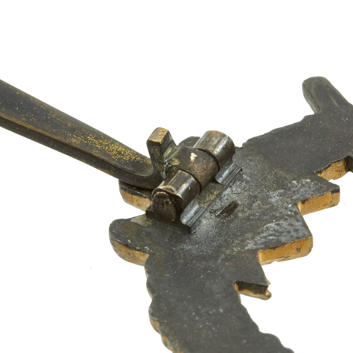 This means this example is a somewhat early example, as later they moved to manufacturer codes. It is the standard zinc alloy, with an attached hinge and brass catch. The condition is very good, with a lot of the original gold wash present on the wreath. A very nice example of this badge. Ready to display!