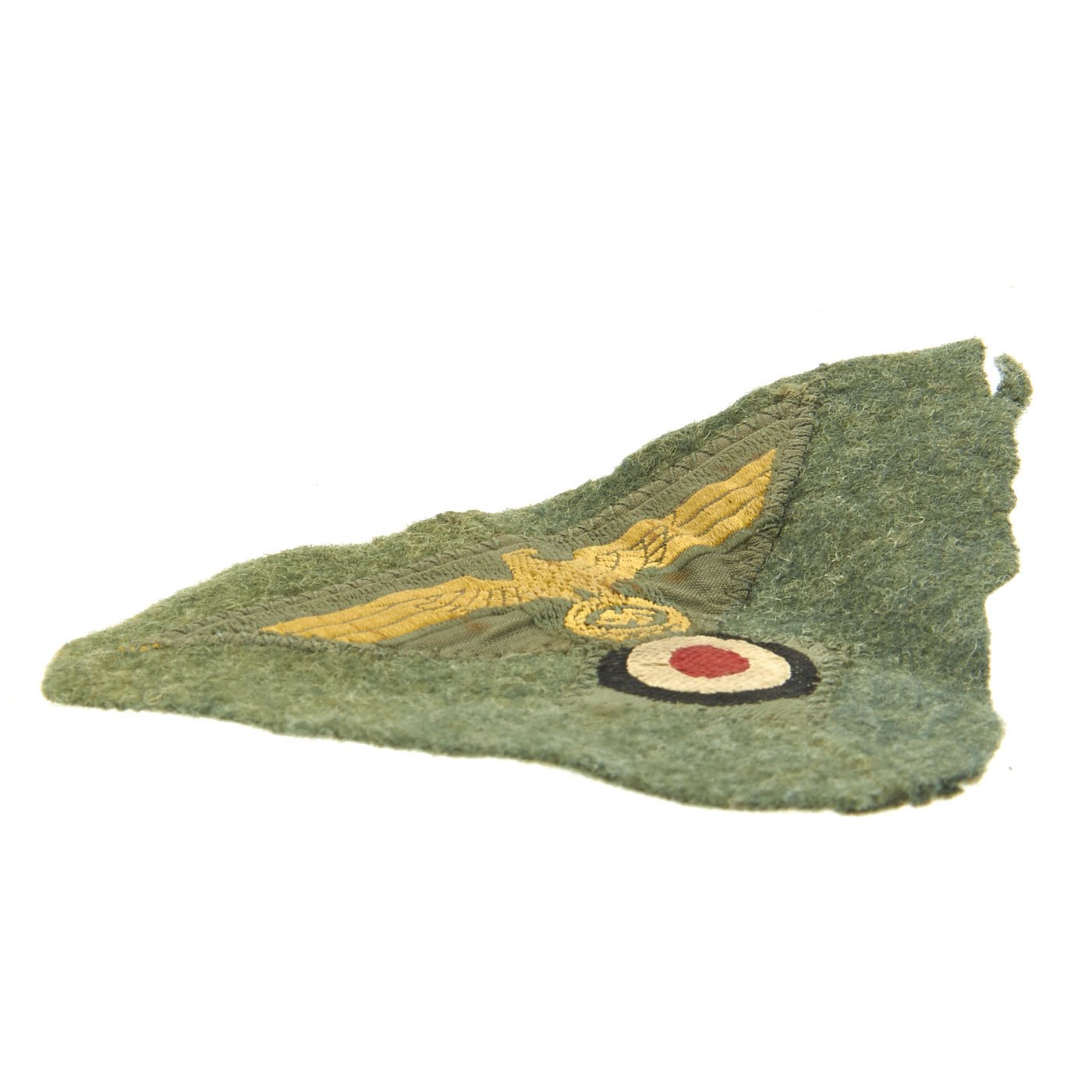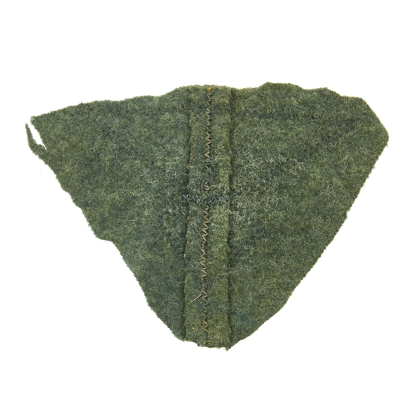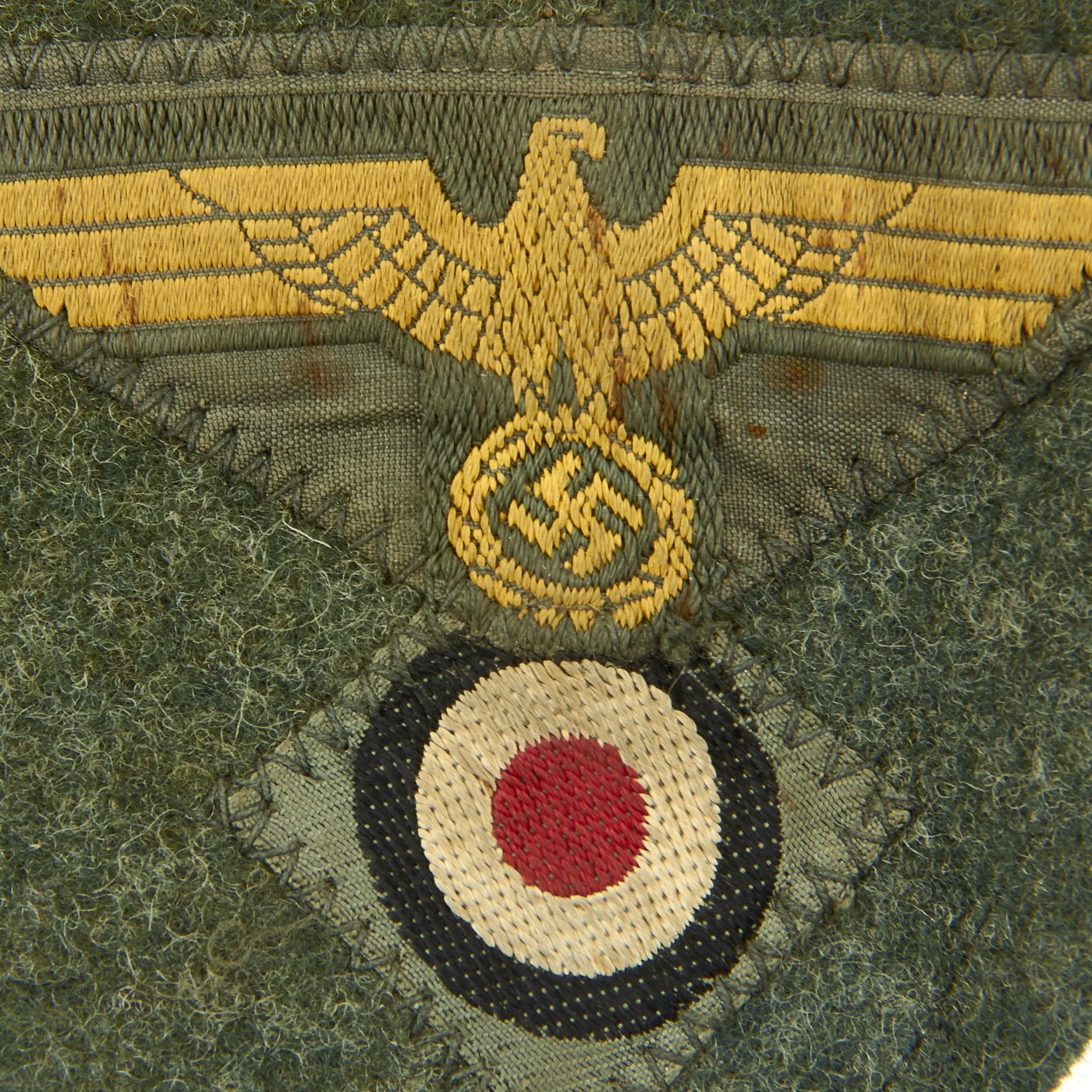 Original Item: Only One Available. Here we have a very nice Cap Eagle and Cockade, cut off from a German WWII Kriegsmarine Coastal Artillerie M43 Field cap (Küstenartillerie Feldmütze). The insignia are sewn onto a field gray (feldgrau) wool cap section. This is the same as the army Heer colors, however it features a fine machine BeVo embroidered eagle, with yellow thread on a blue green base, the Kriegsmarine colors. Below this is a machine embroidered tri-color cockade, which is woven on the same blue material.