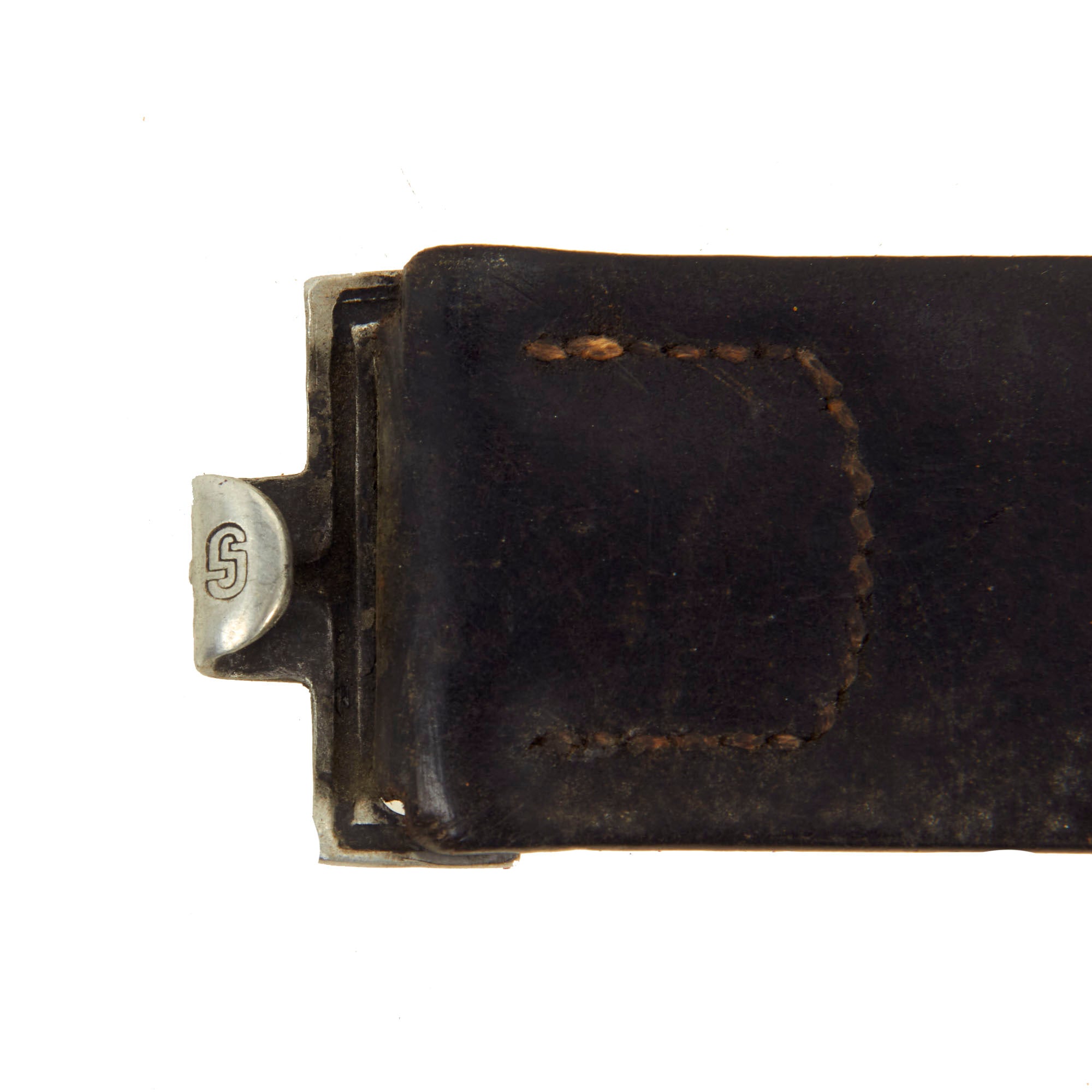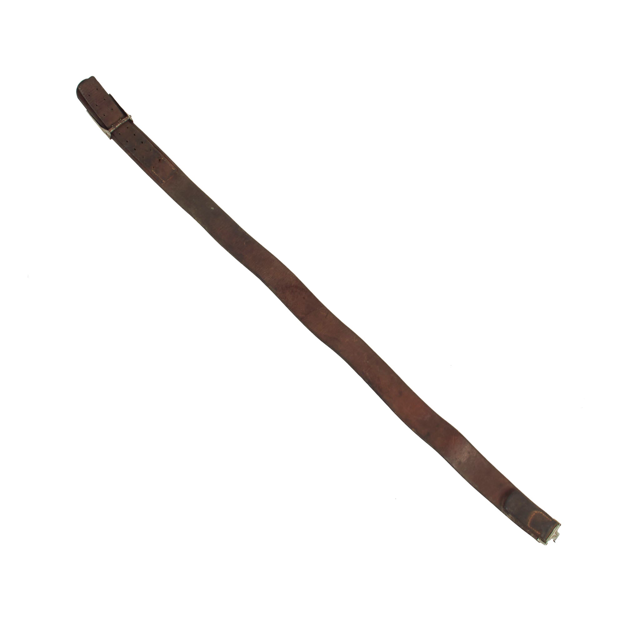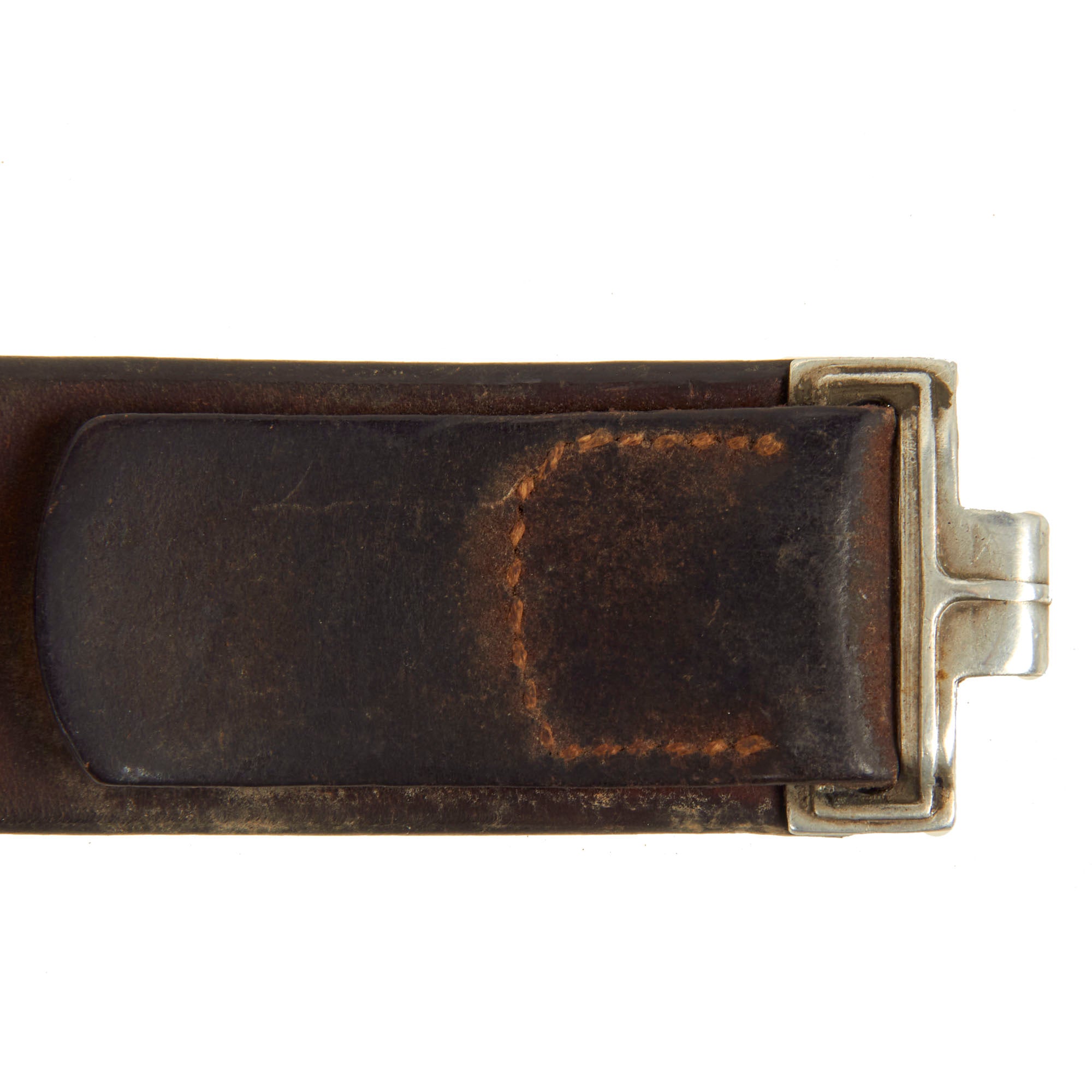 The leather belt is in very good used condition, and measures about 40 inches in overall length. It is stamped faintly on the buckle end with 100, for 100cm (39.3inches) and is an early example, with an aluminum maker marked end clip. The leather still retains the black finish on the exterior, with the interior brown. There are no maker markings that we can see, but they may have been worn away from use. The stitching on the leather tab was partly removed, and two more sets of holes added, as it looks to have been too big for the last wearer.